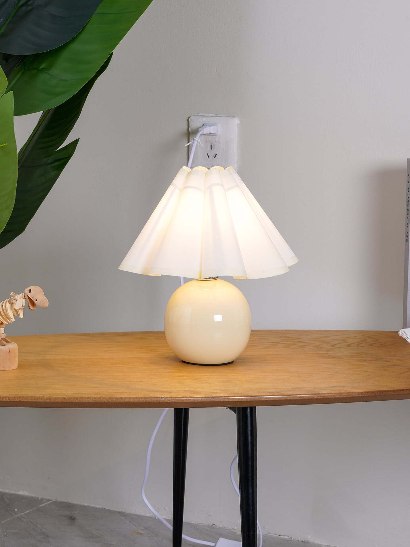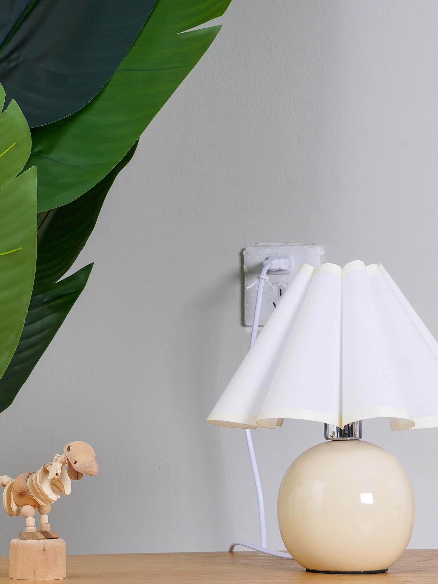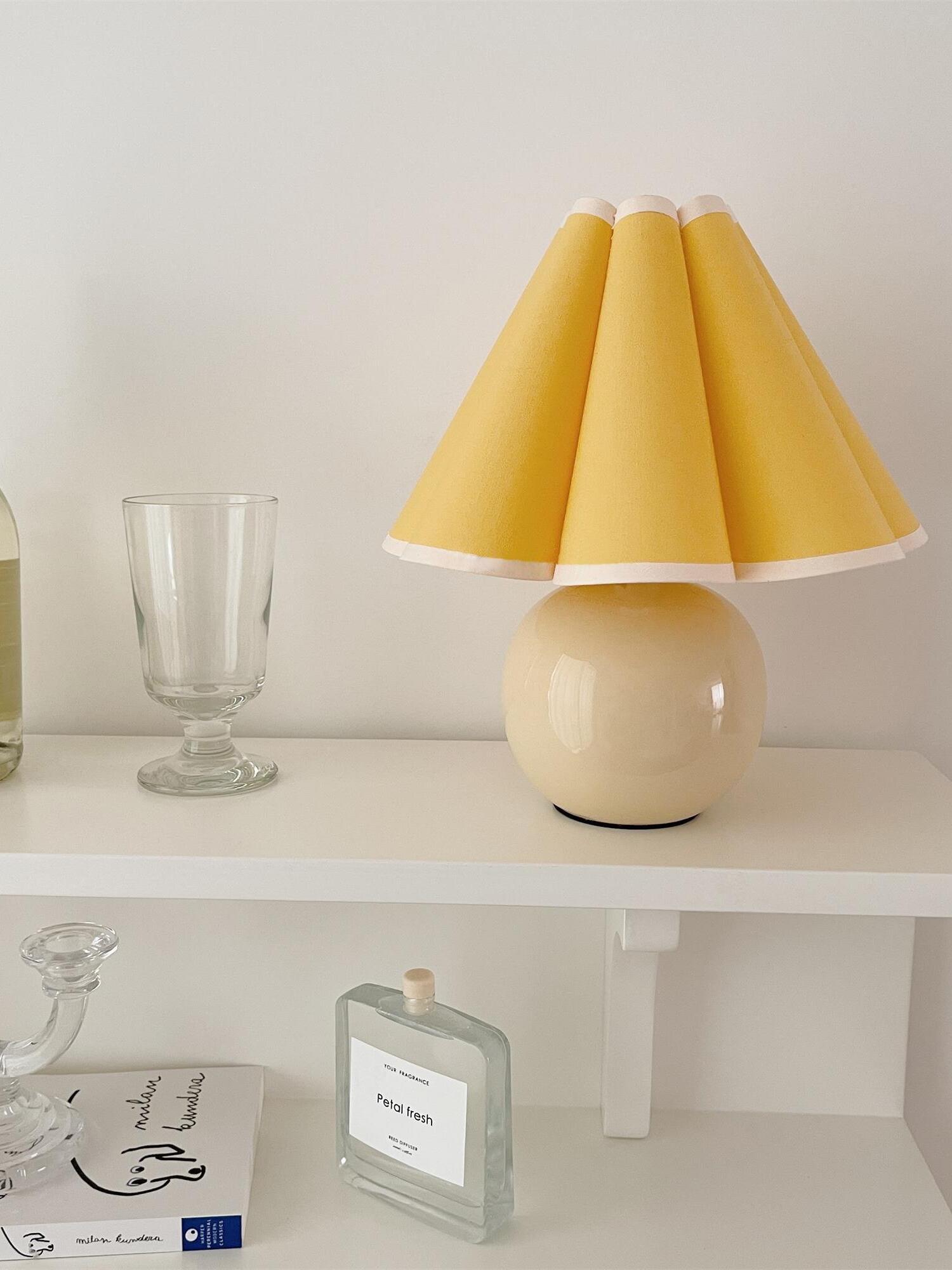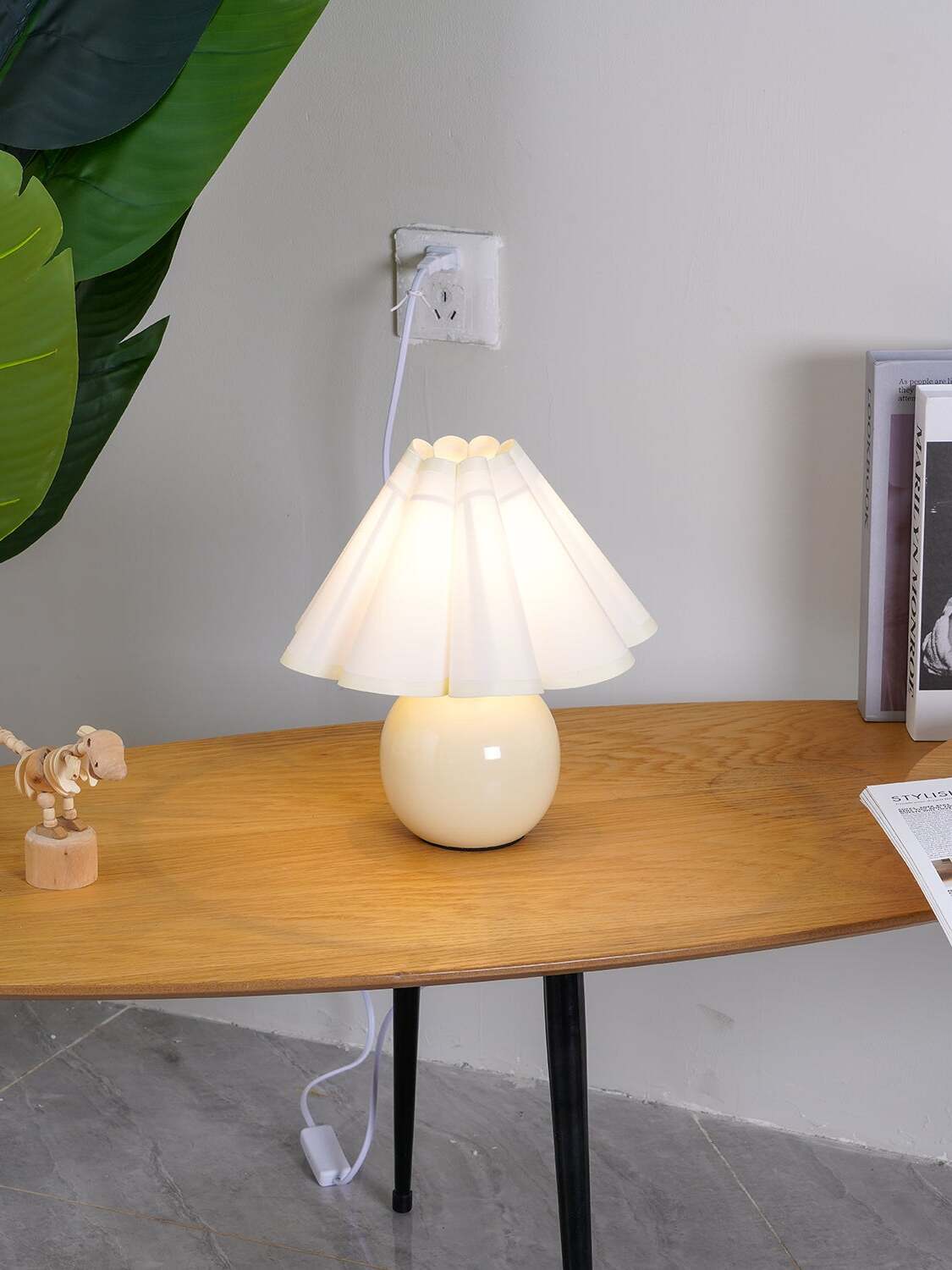 Kicsi '(pronounced "Kitchi", meaning 'mini' in Hungarian). Our white Kicsi Pleated Table Lamp features a vintage style linen pleated shade, and white ceramic body. This mushroom pleated hardback shade in creme has a traditional look. The fold over trim adds a soft touch to the pleated shade.