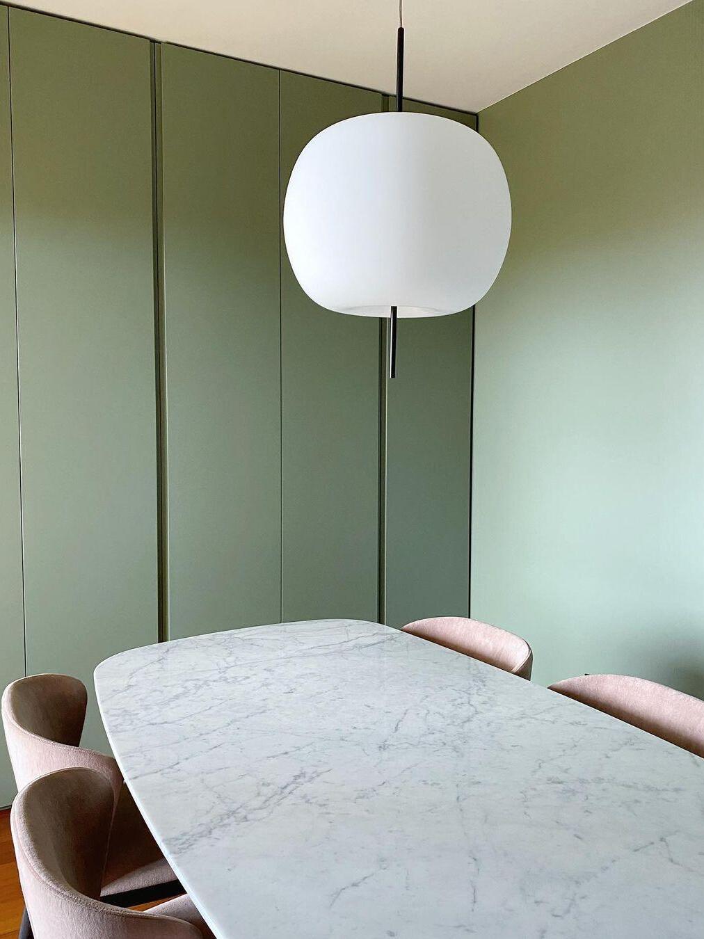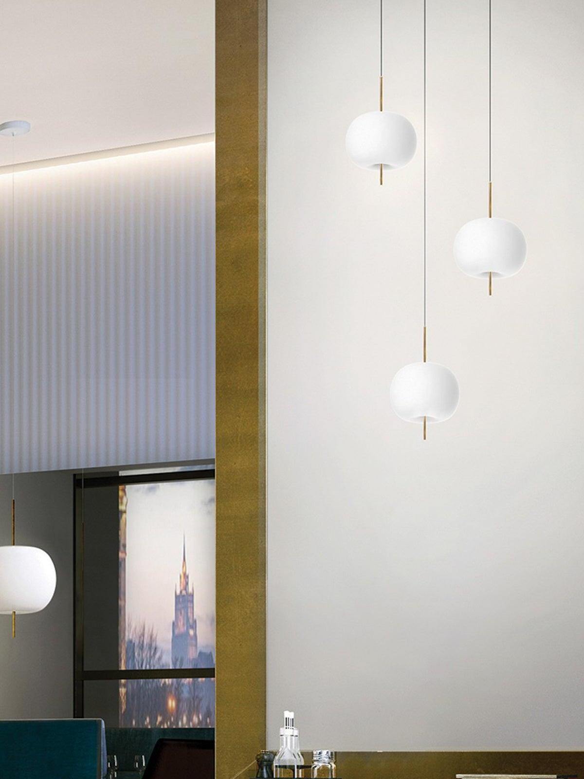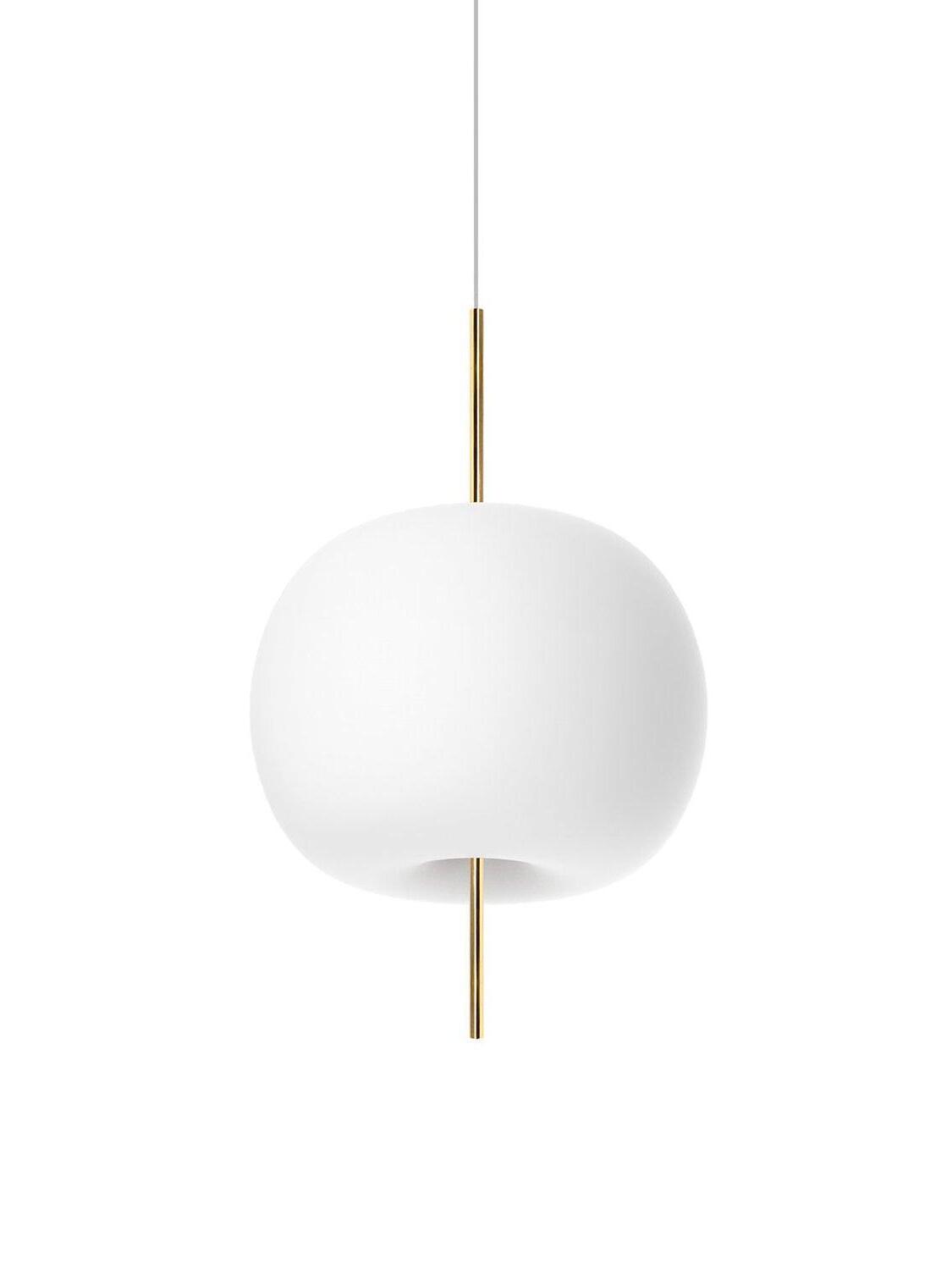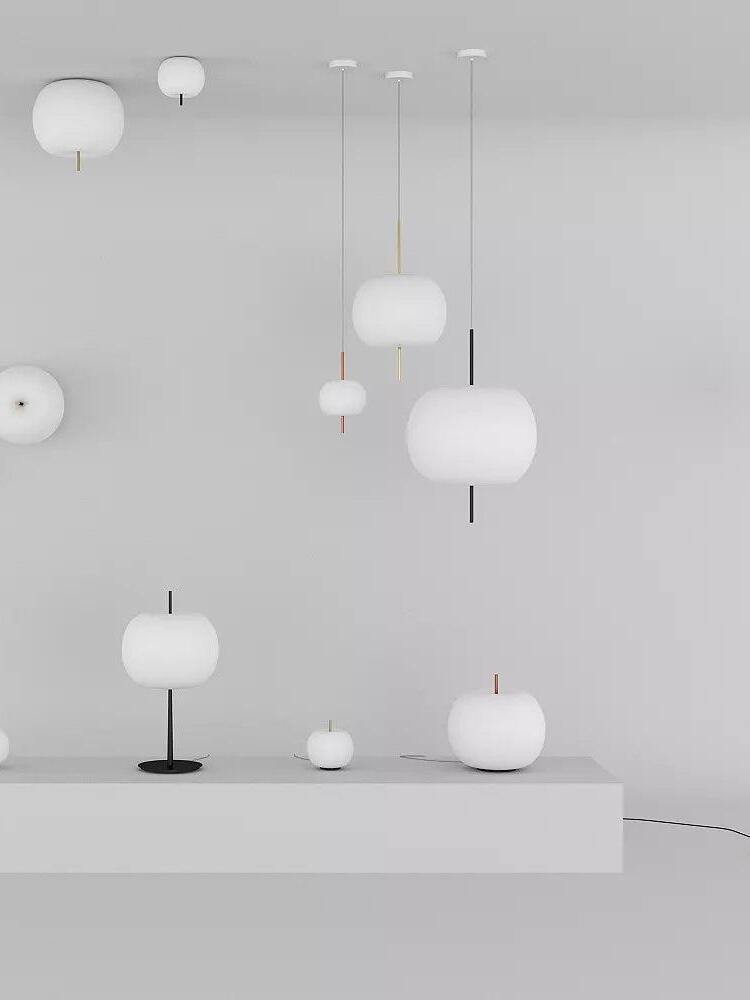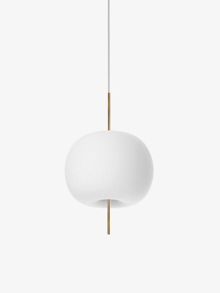 KUSHI, as its name suggests, is a very unique pendant light designed with inspiration from the Japanese "kushi". The design, which looks like an apple on a skewer, is a tribute to "food" and "Made in Italy". The shade part is made of two layers of blown glass and has a white color.