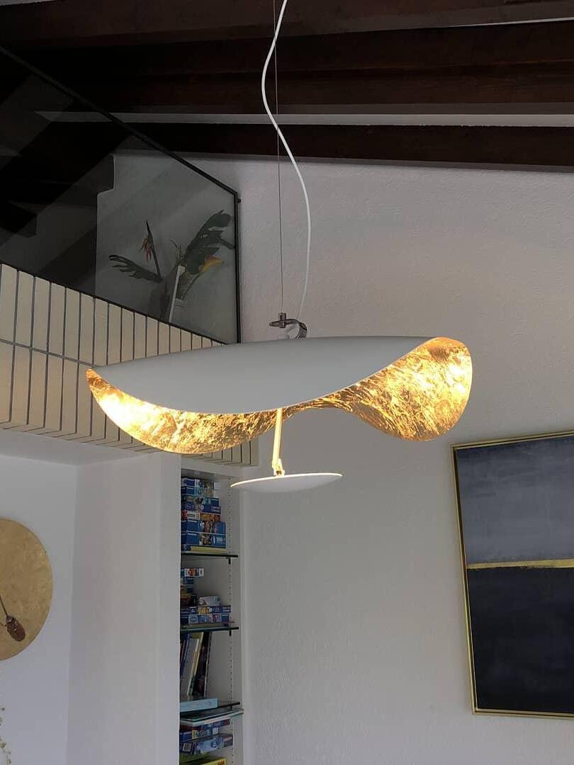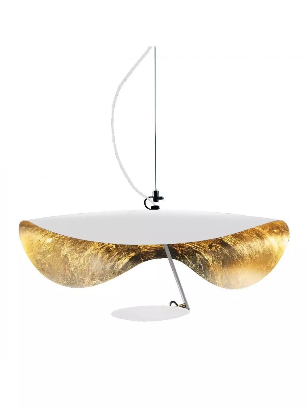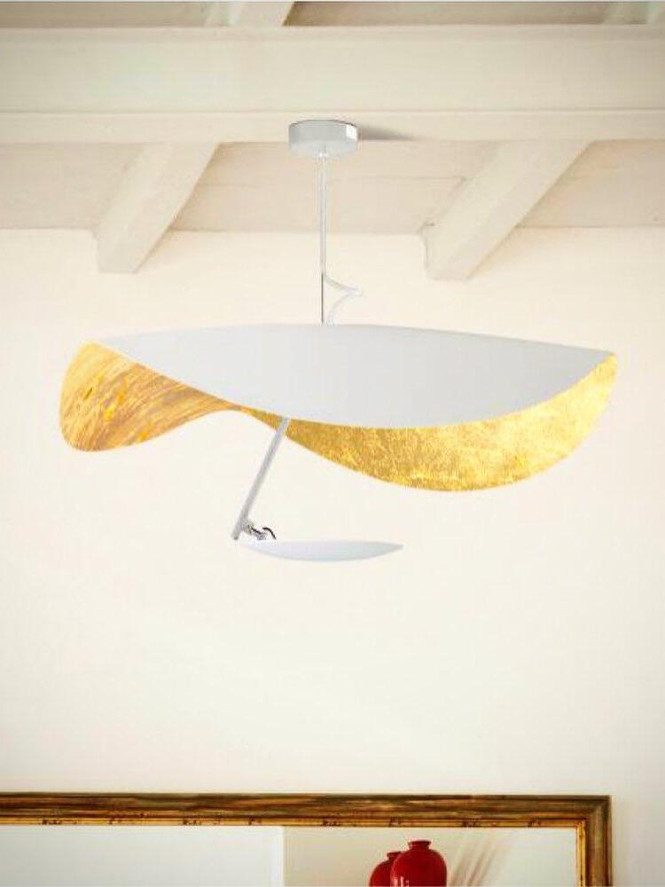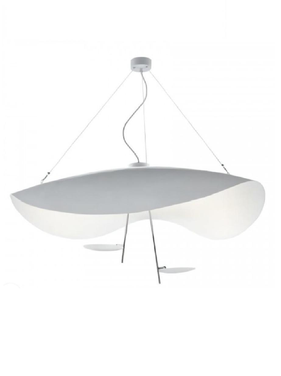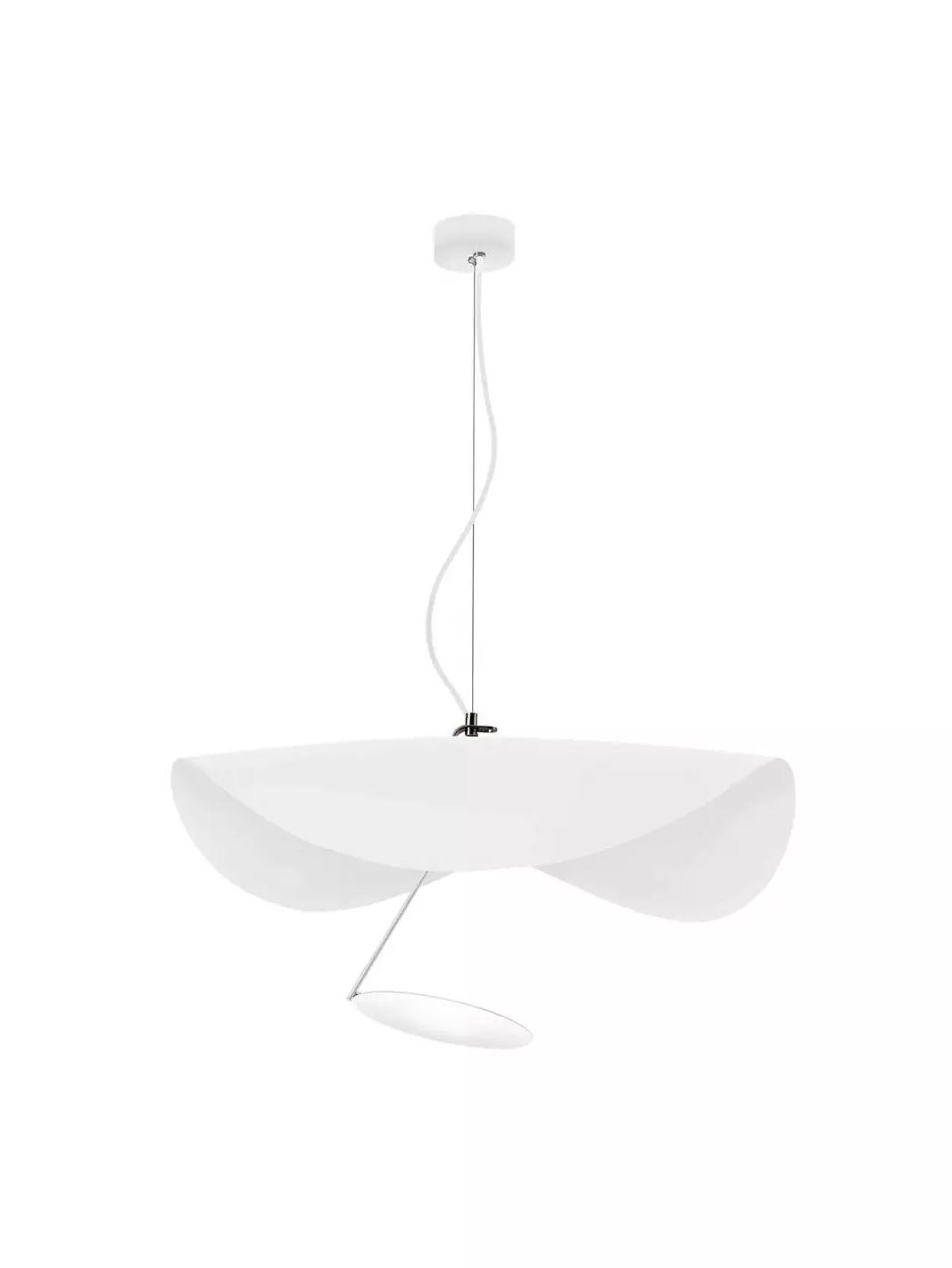 The Lederam Manta Pendant lamp / Lederam Ceiling lamp features a gracefully curving shade that embodies fluidity and the accuracy of the motion required to draw a line, with a disc shade extending out with a metal rod. Finished in White with the option of a White, Satin, or Gold rod. May be ceiling or wall mounted.