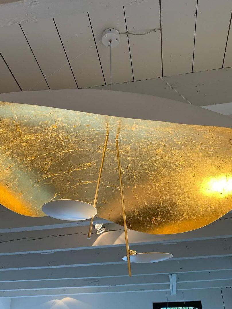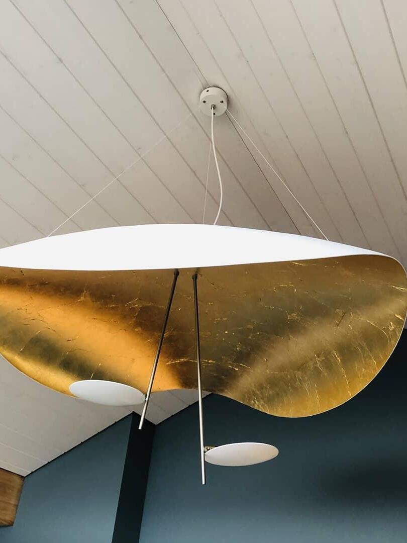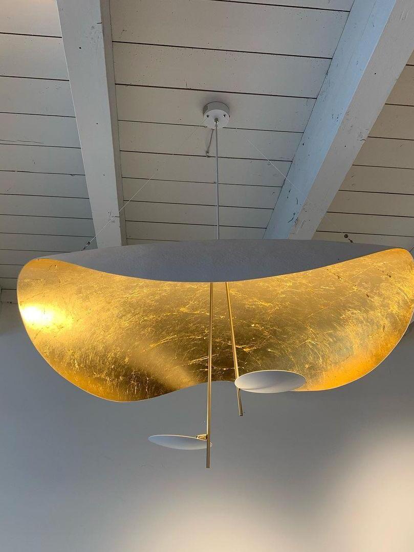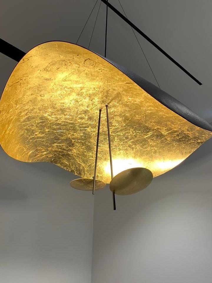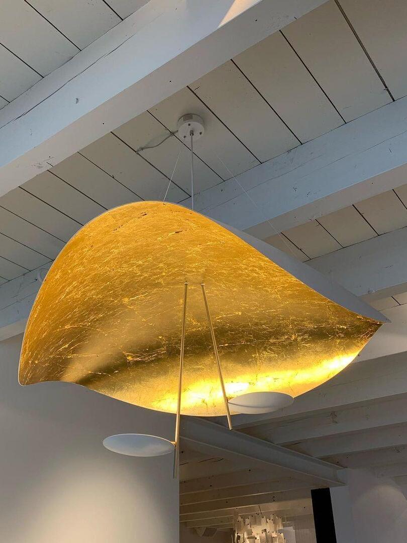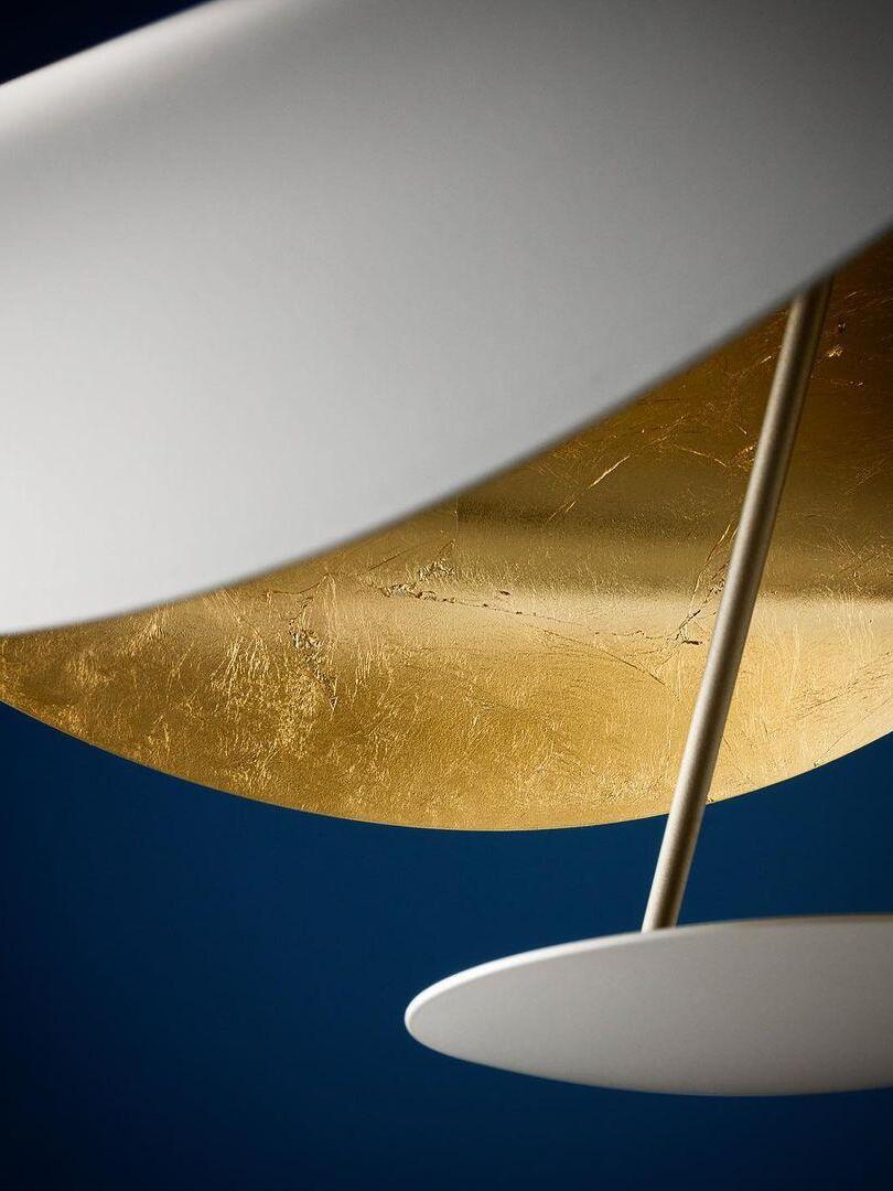 The Lederam Manta Pendant lamp / Lederam Ceiling lamp features a gracefully curving shade that embodies fluidity and the accuracy of the motion required to draw a line, with a disc shade extending out with a metal rod. Finished in White with the option of a White, Satin, or Gold rod. May be ceiling or wall mounted.