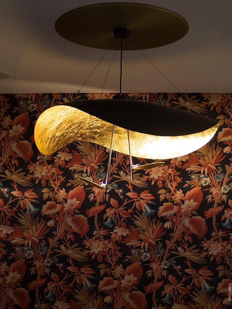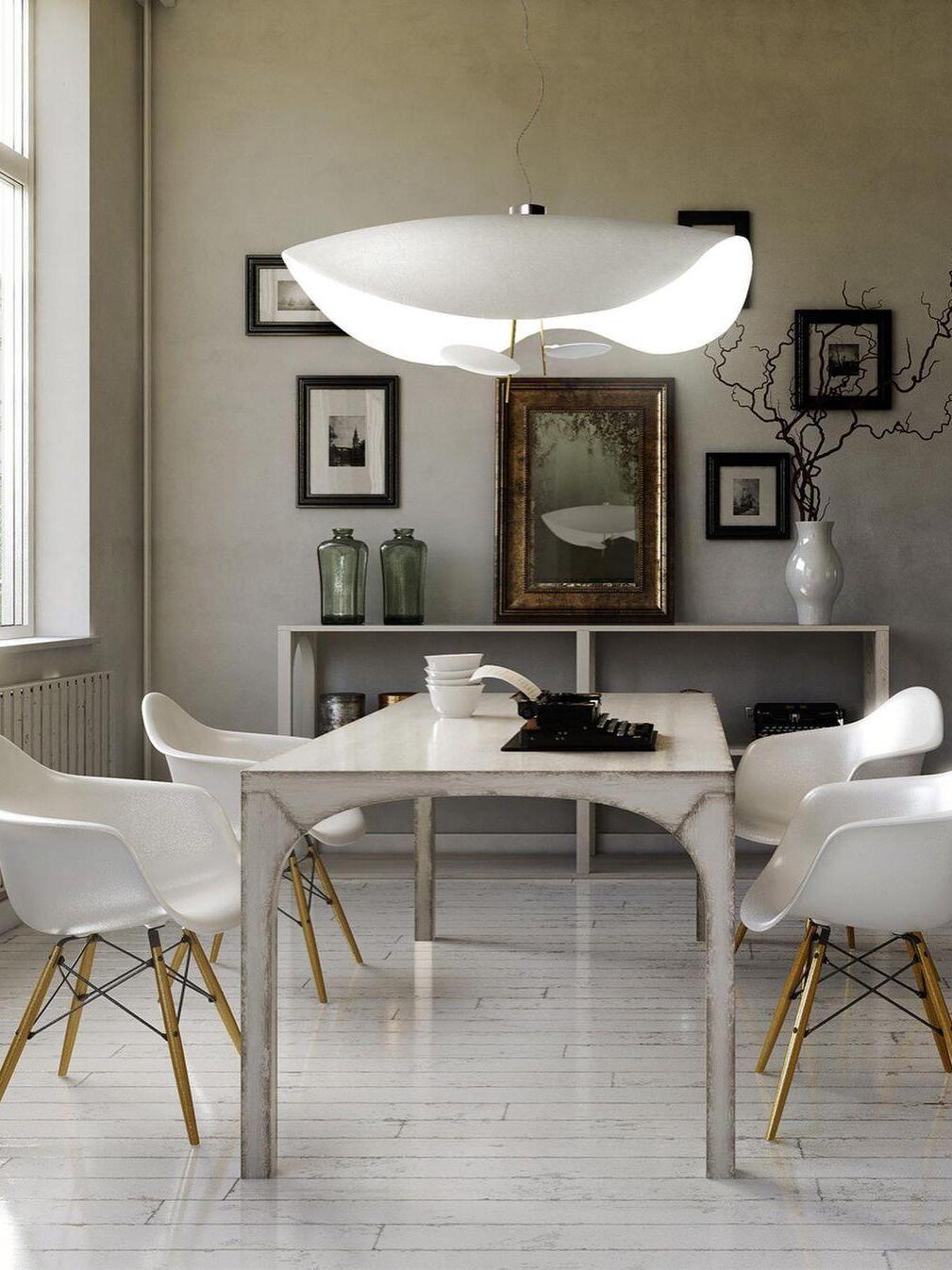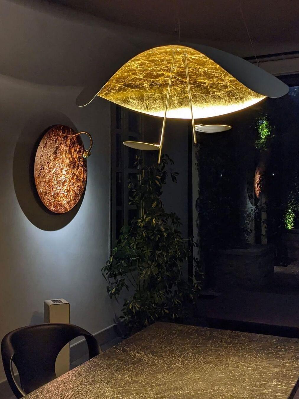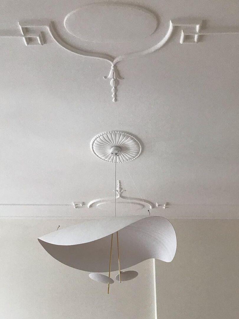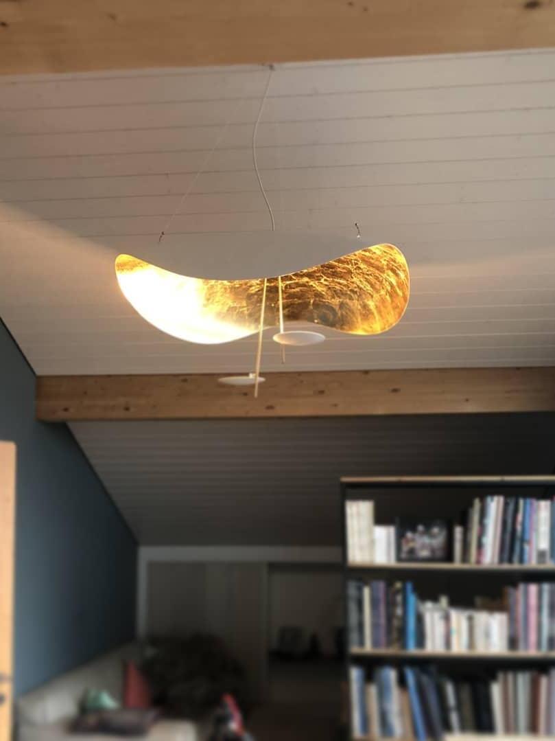 The Lederam Manta Pendant lamp / Lederam Ceiling lamp features a gracefully curving shade that embodies fluidity and the accuracy of the motion required to draw a line, with a disc shade extending out with a metal rod. Finished in White with the option of a White, Satin, or Gold rod. May be ceiling or wall mounted.