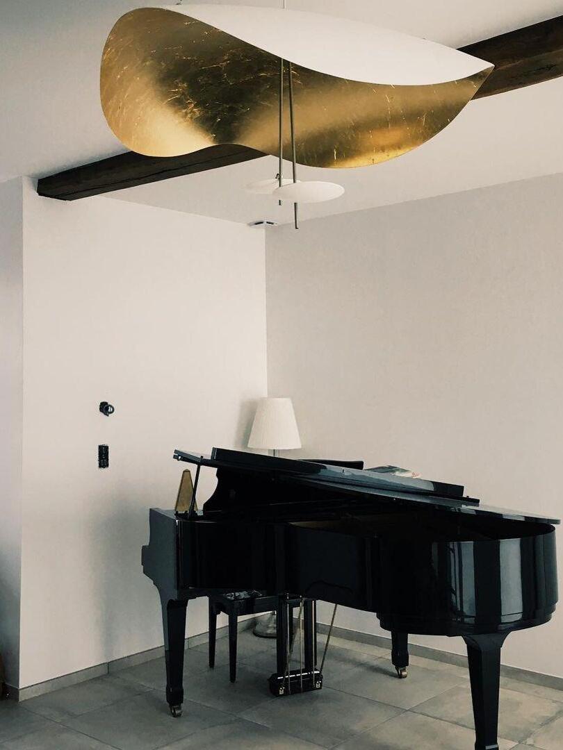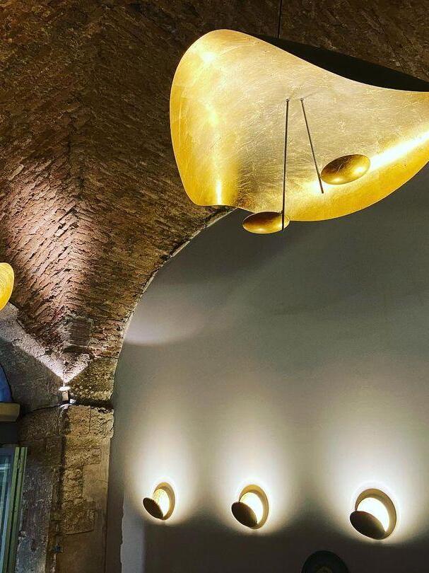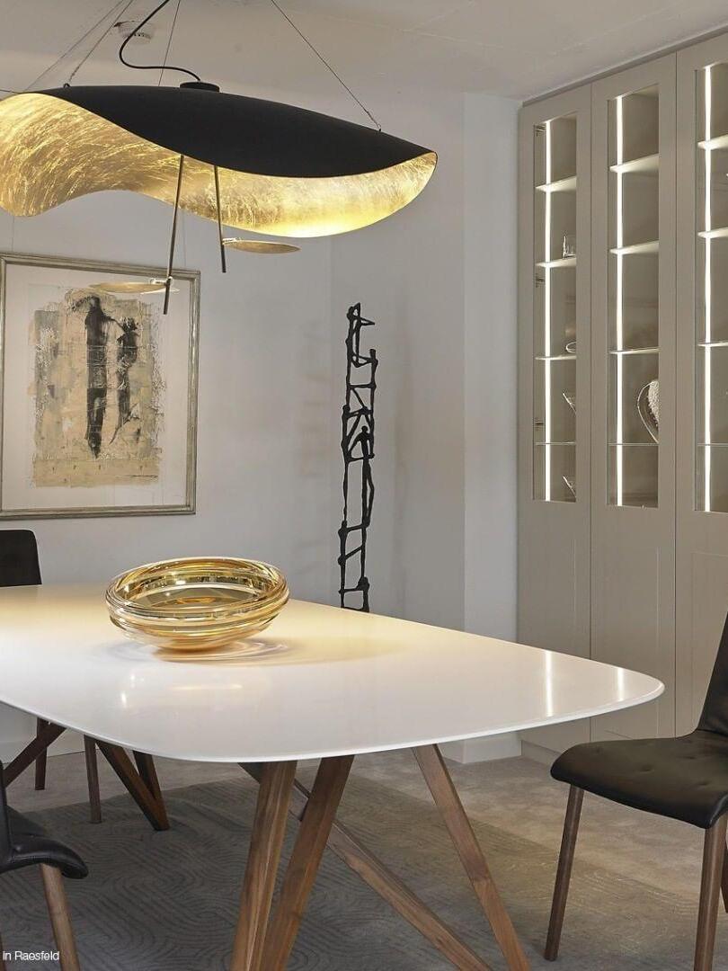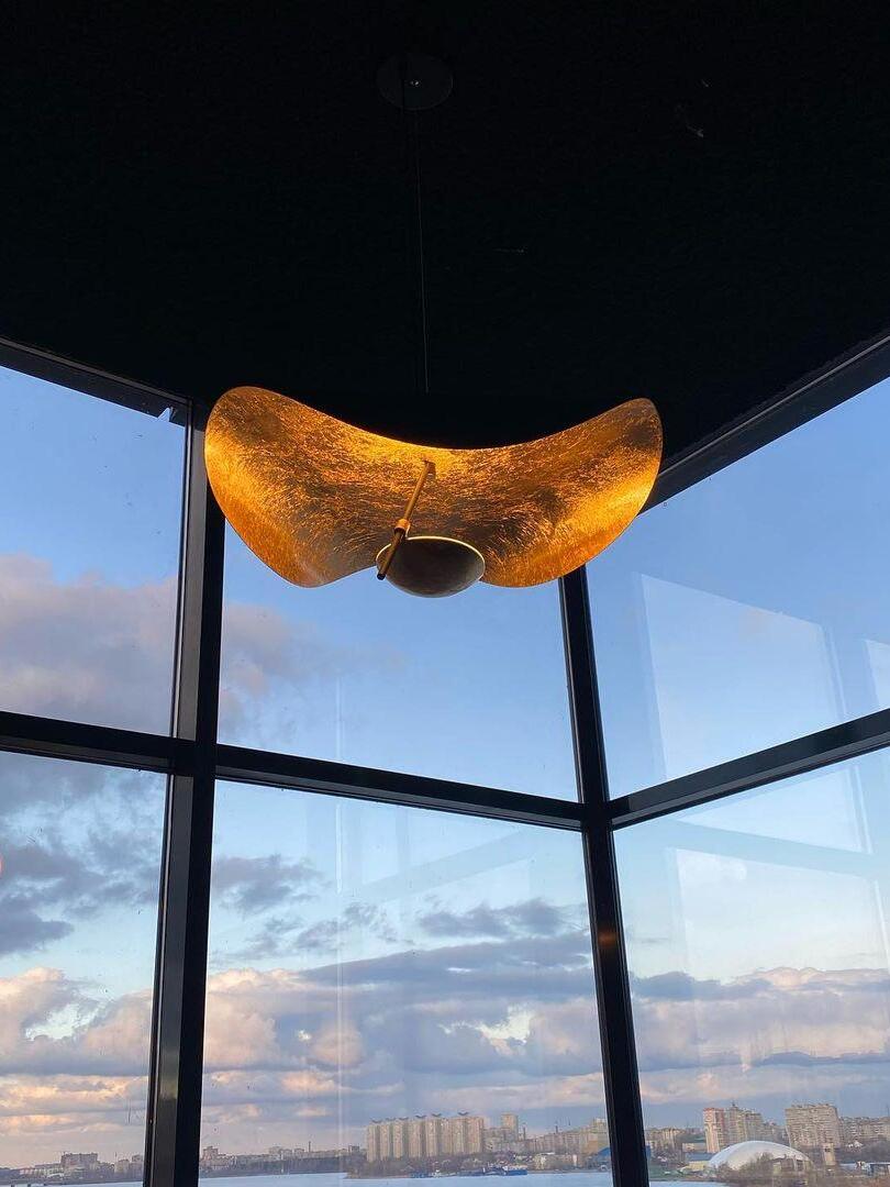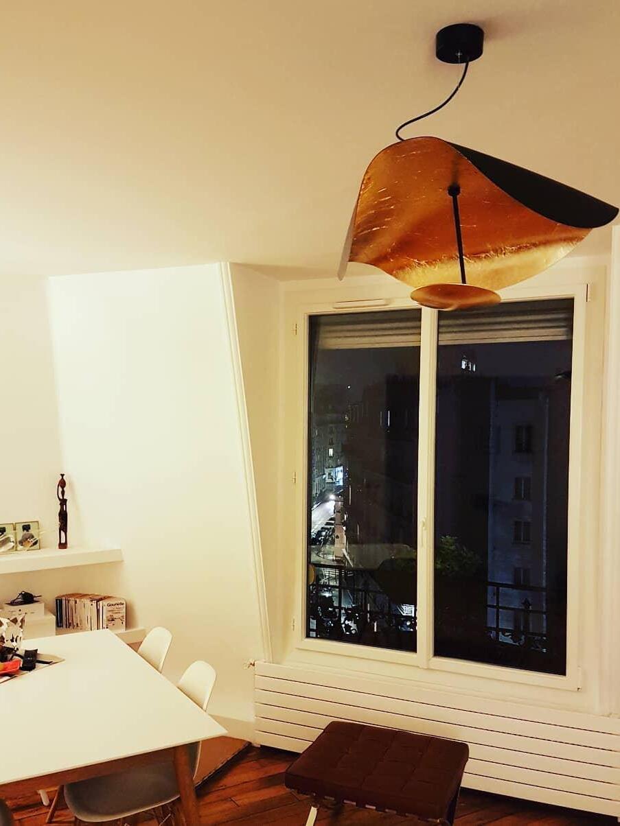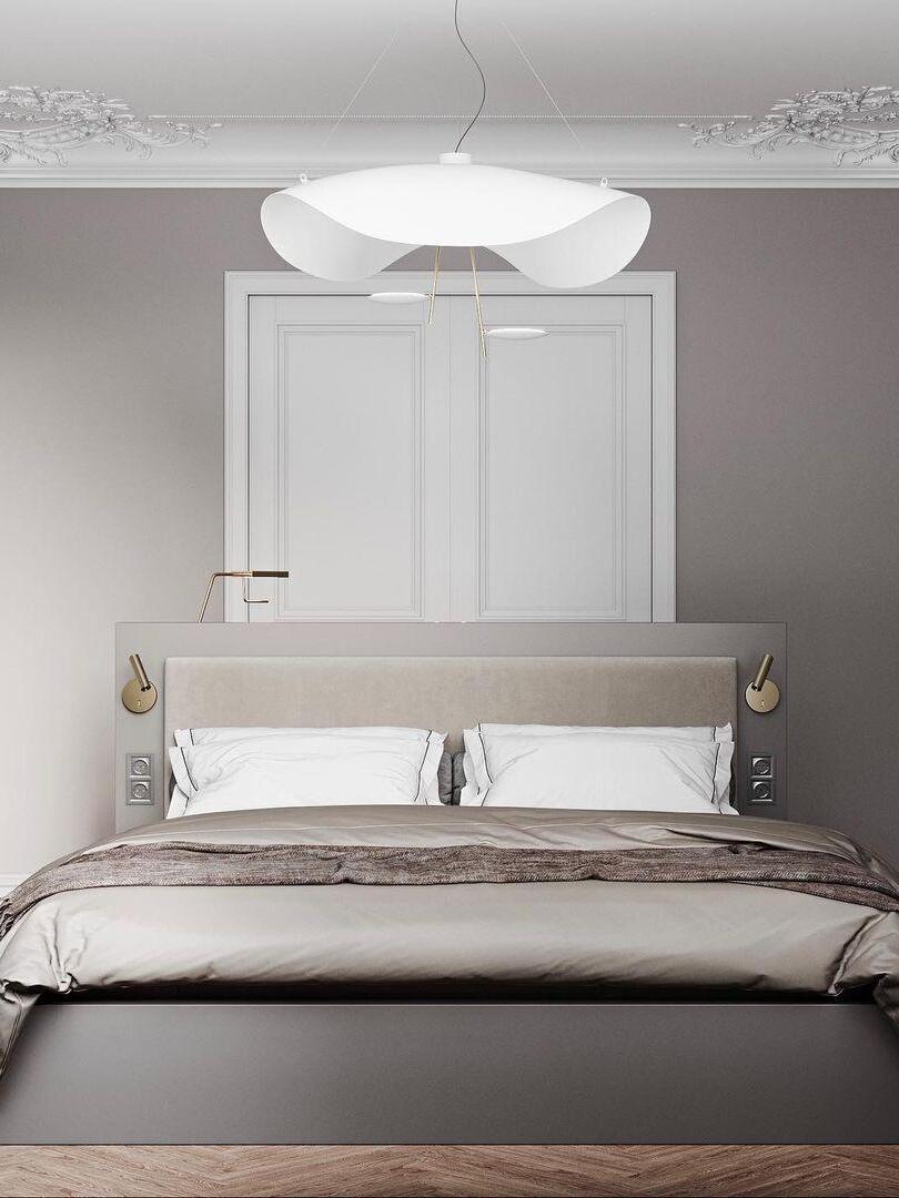 The Lederam Manta Pendant lamp / Lederam Ceiling lamp features a gracefully curving shade that embodies fluidity and the accuracy of the motion required to draw a line, with a disc shade extending out with a metal rod. Finished in White with the option of a White, Satin, or Gold rod. May be ceiling or wall mounted.