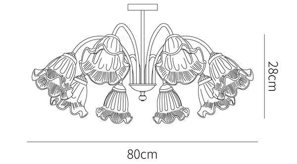 This mottled rich clear shaded Eight Light Chandelier offers an attractive, delicate design featuring shades mouth blown of fine art glass. Lily shades are suspended from gracefully curved arms in this fixture finished by hand in golden iron frame.