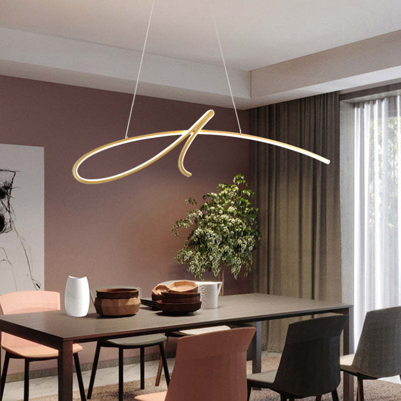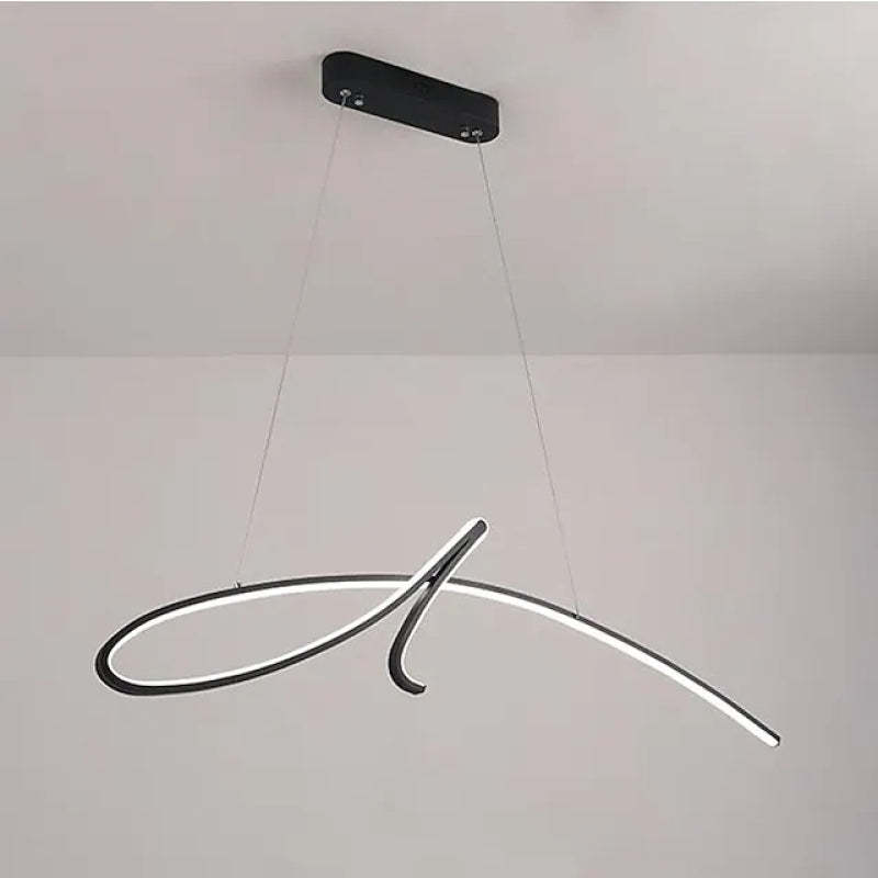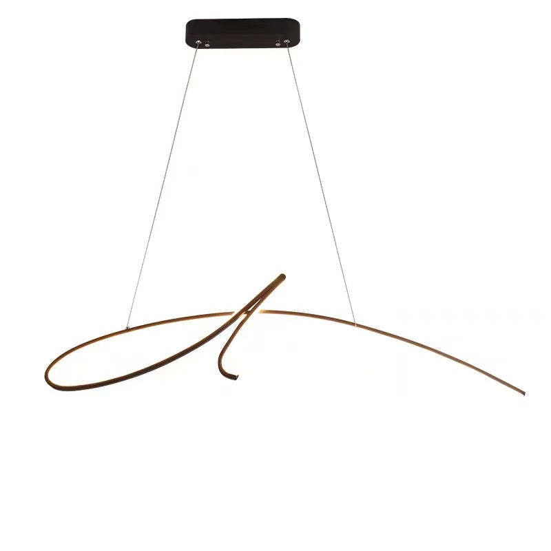- The pendant light features irregular curved lines, showcasing a modern and minimalist design. This unique shape adds an element of contemporary style to its appearance while elevating the room overall ambiance
