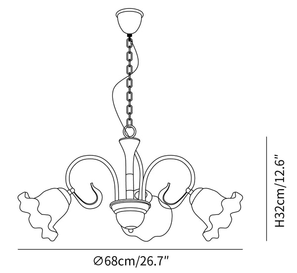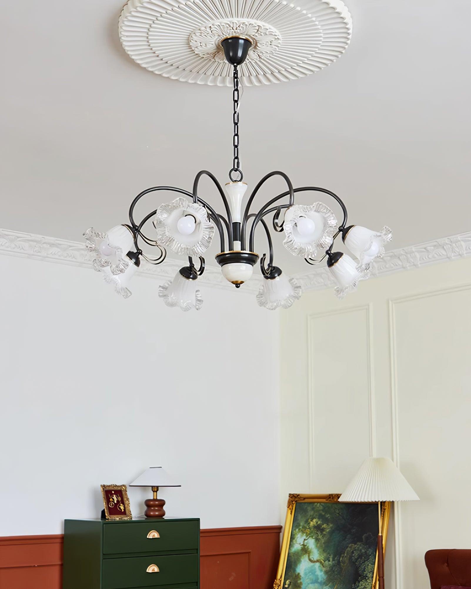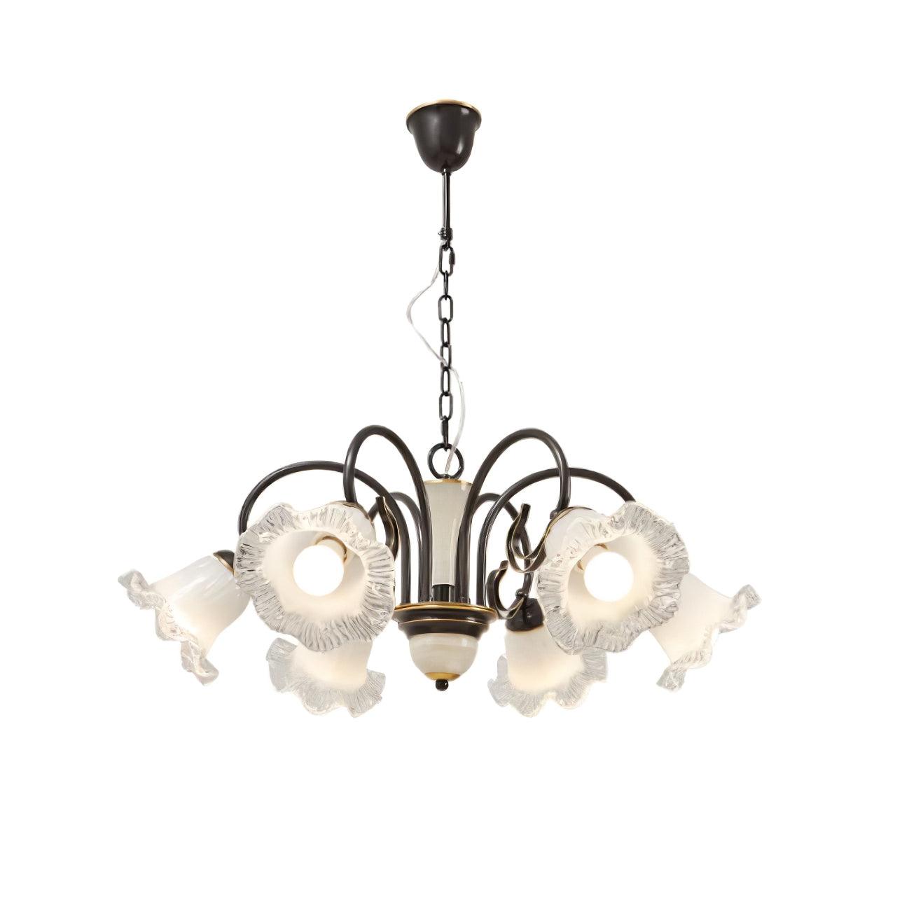 Experience the perfect blend of elegance and romance in the Luce Black Chandelier, distinguished by its vintage appeal and delicate floral shade. Create an atmosphere of refined beauty and soft sophistication with its captivating nuances, and luxuriate in a timeless ambience of warmth and serenity.