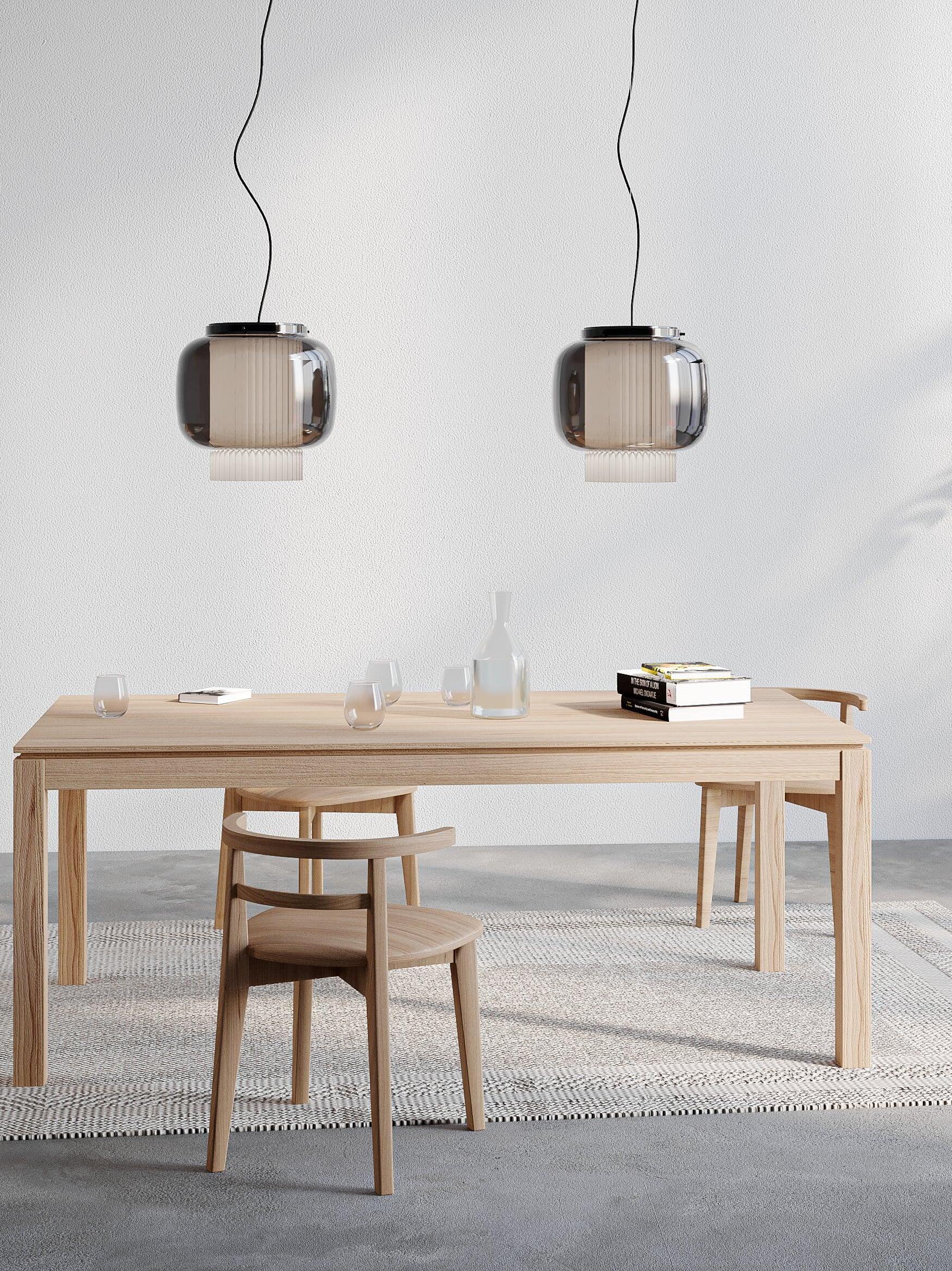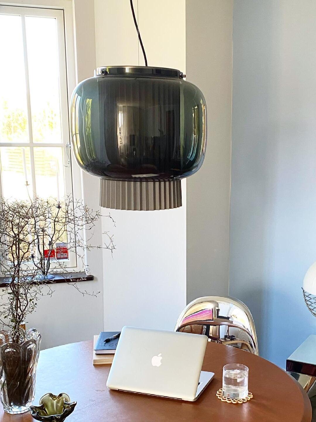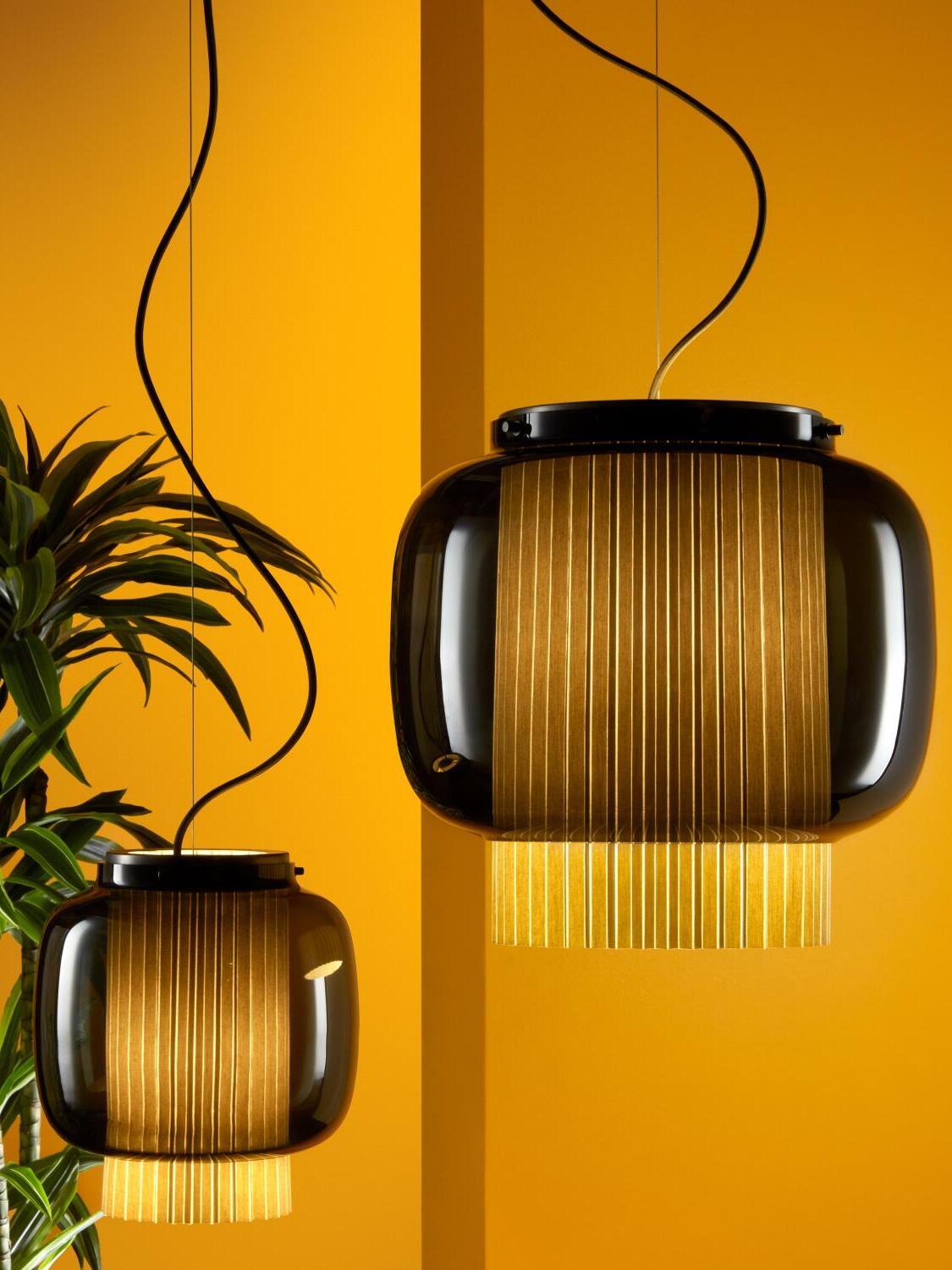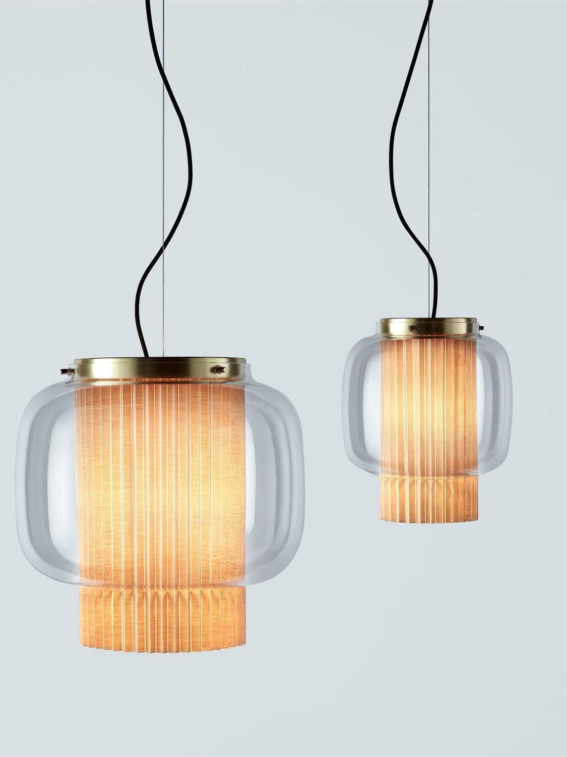 An incredibly elegant combination of artisanal blown glass and a plissé textile diffuser. Its name comes from Spanish "Mantón de Manila". It's a traditional silk shawl commonly used by flamenco dancers.