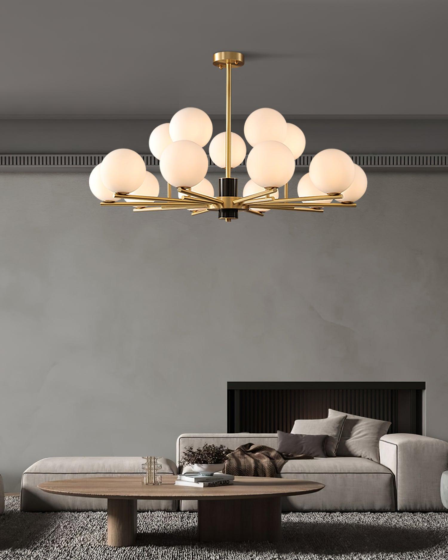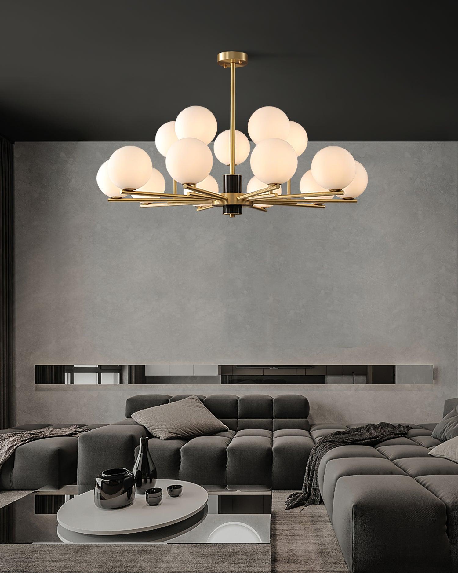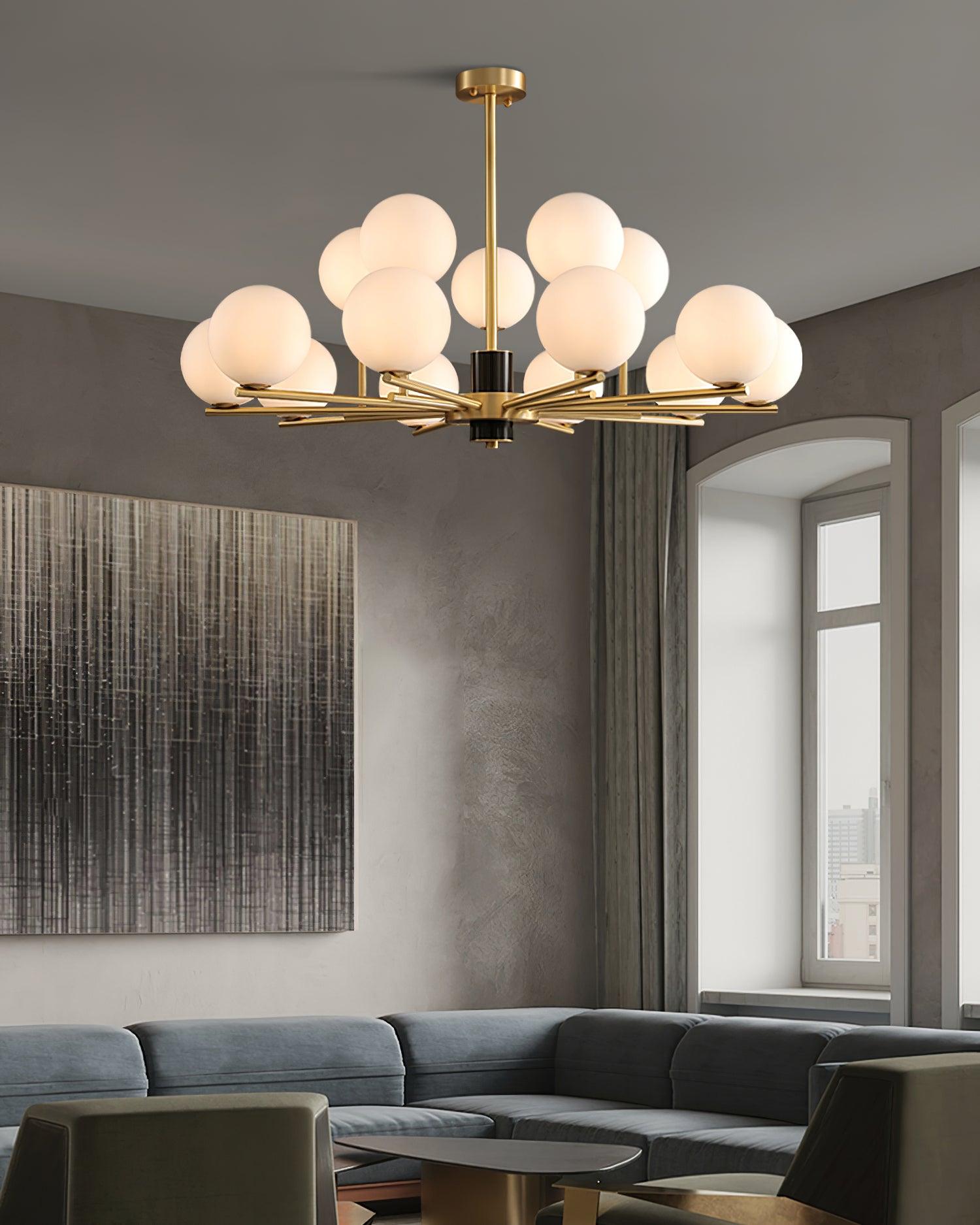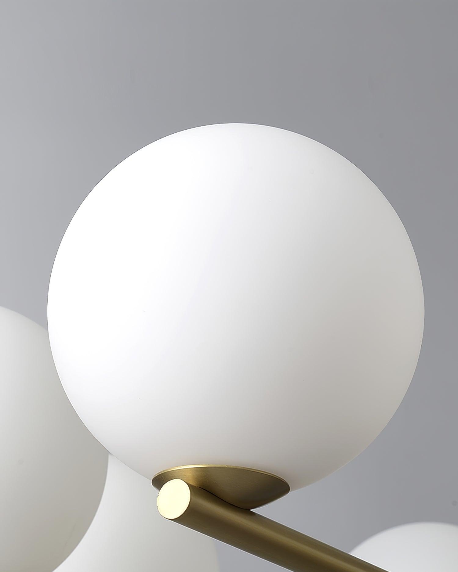 The Marais Chandelier provides a gentle, ambient light and creates a tranquil atmosphere. Its white glass spheres hang gracefully, giving it an elegant and refined look that adds a touch of minimalism to any home. Enjoy its calming presence and effervescent beauty.