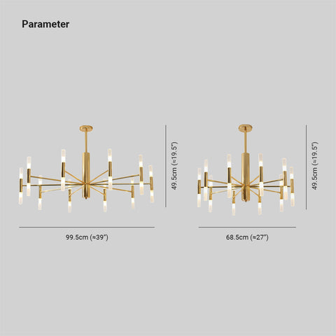 - The chandelier has a cylindrical body with 10 branches and a gold metal bracket in the centre, available in two length sizes to suit the size of the scene.