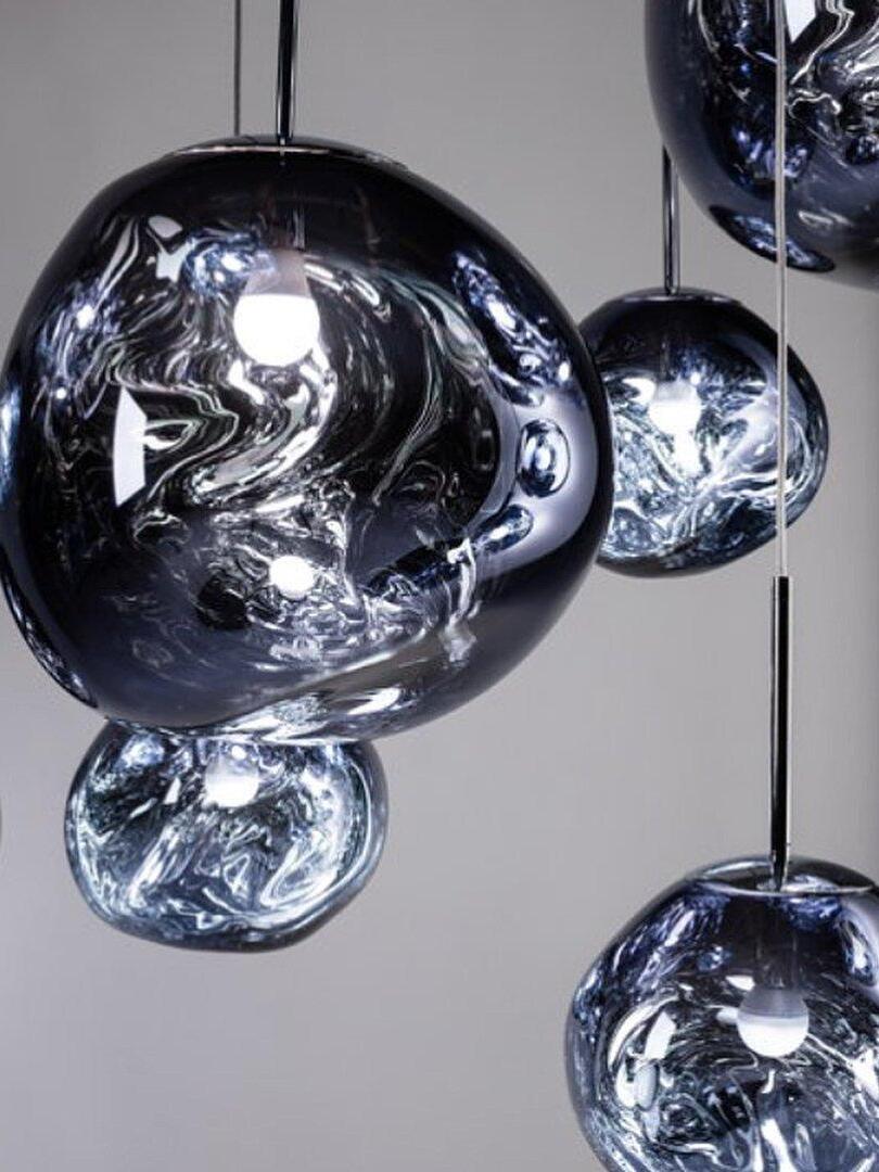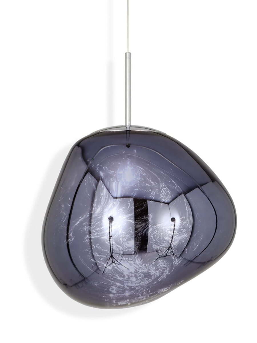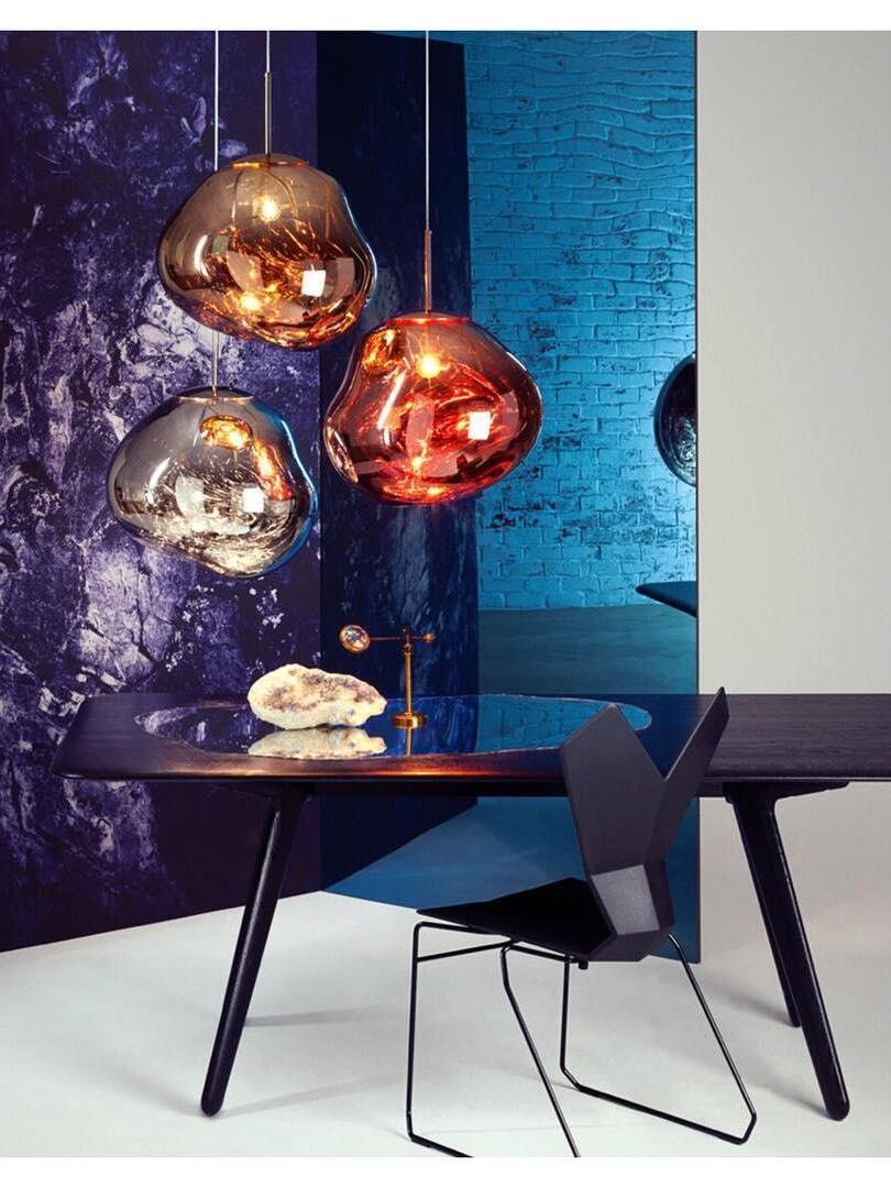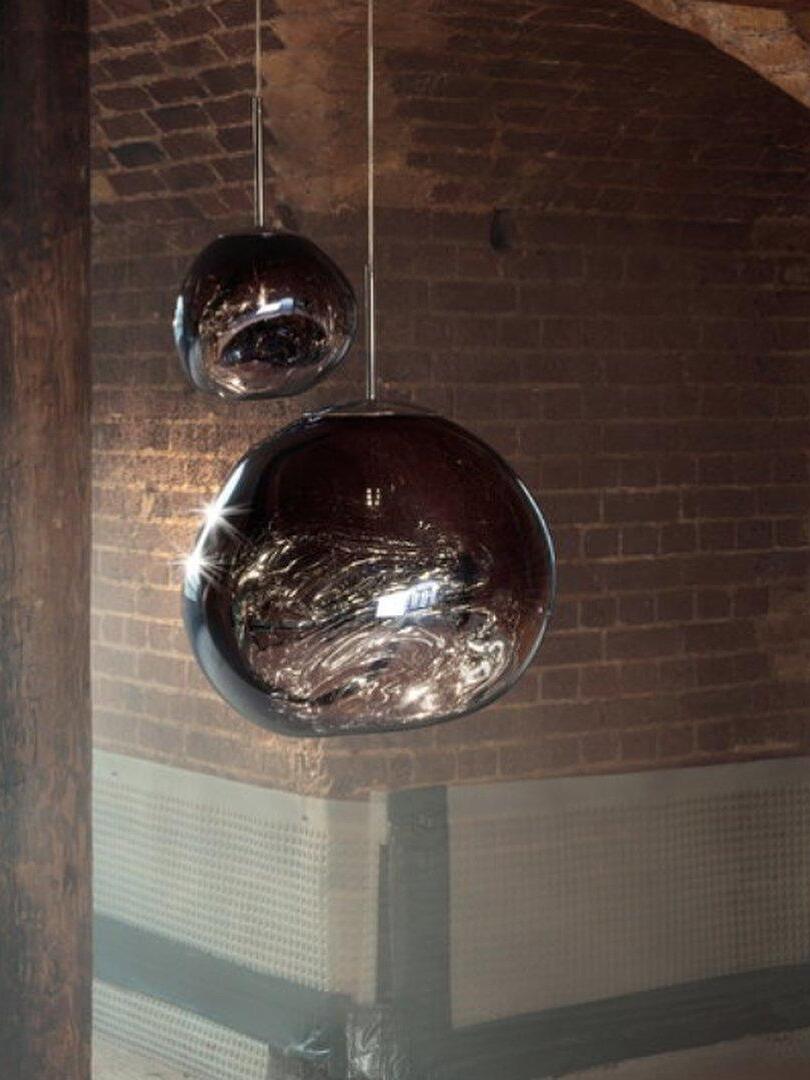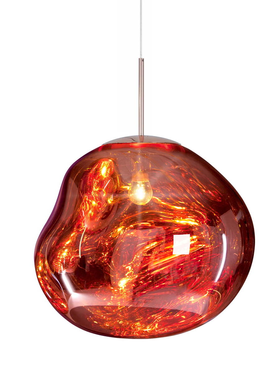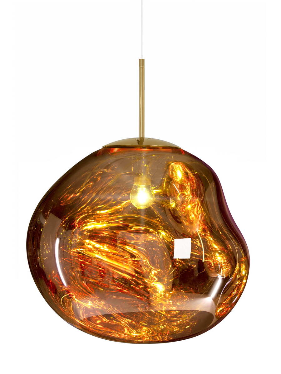 Melt is a beautifully distorted pendant light in a modern Copper finish and matching ceiling rose. Emitting an attractive, mildly hallucinogenic light, this ceiling light creates a mesmerizing melting hot-blown glass effect when on and a mirror-finish effect when off. it emits an attractive, mildly hallucinogenic light. Melt floor lamps are available in copper, chrome and gold.