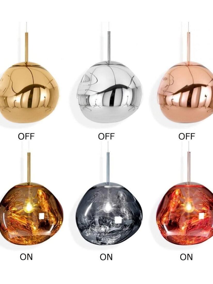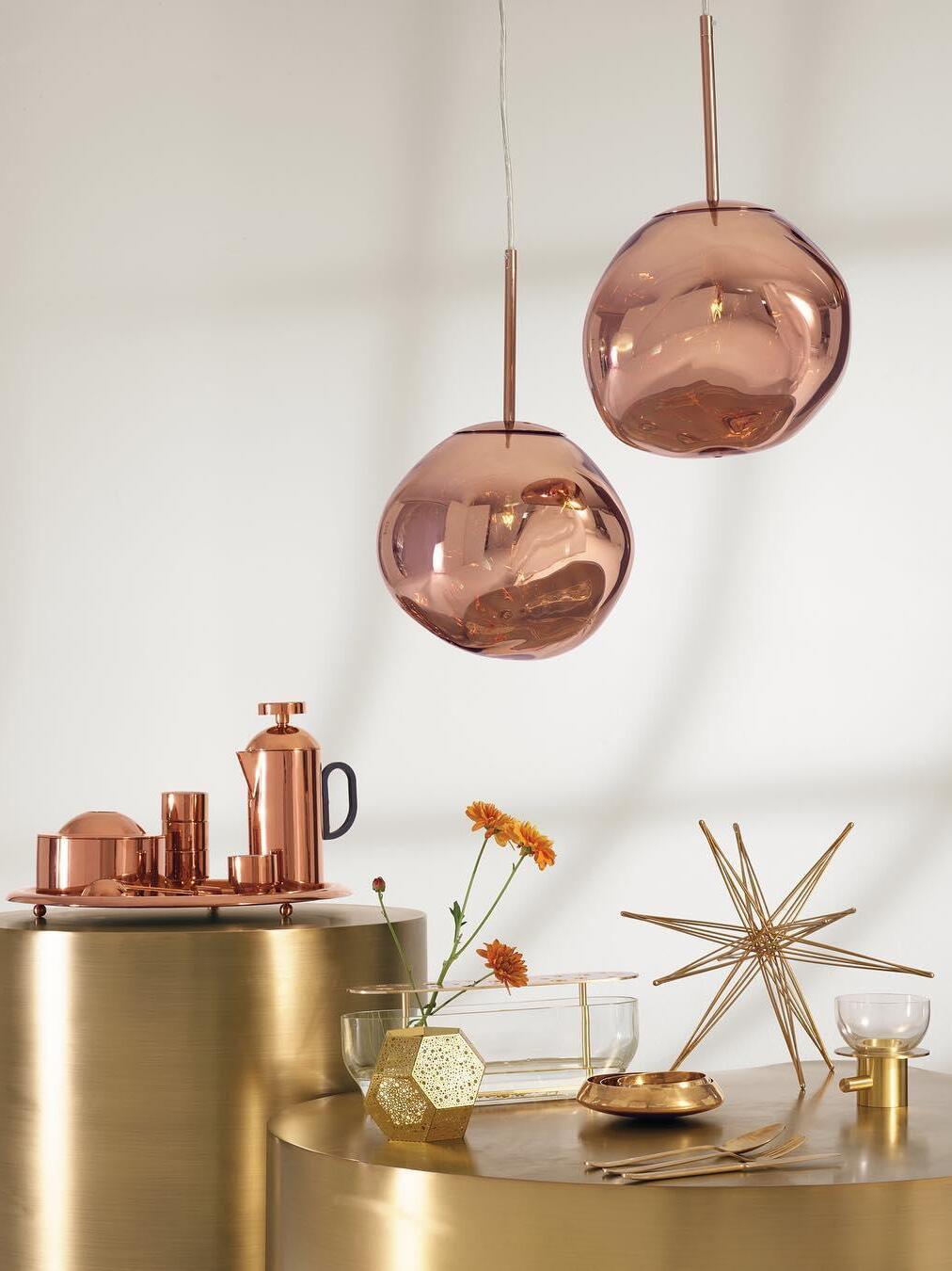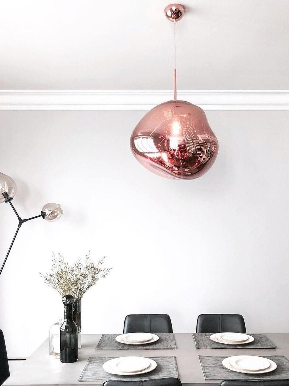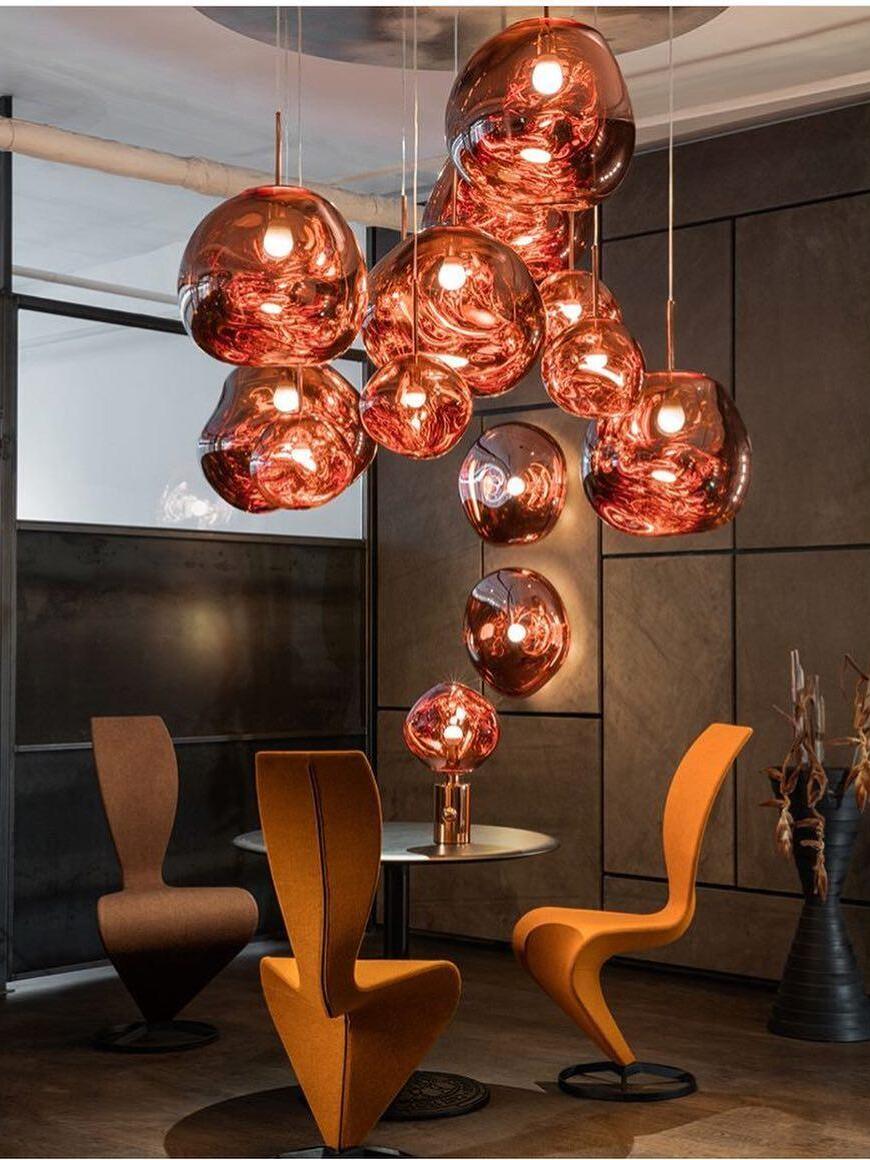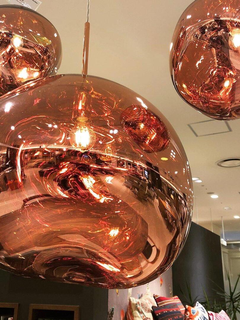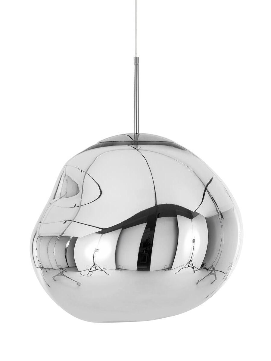 Melt is a beautifully distorted pendant light in a modern Copper finish and matching ceiling rose. Emitting an attractive, mildly hallucinogenic light, this ceiling light creates a mesmerizing melting hot-blown glass effect when on and a mirror-finish effect when off. it emits an attractive, mildly hallucinogenic light. Melt floor lamps are available in copper, chrome and gold.