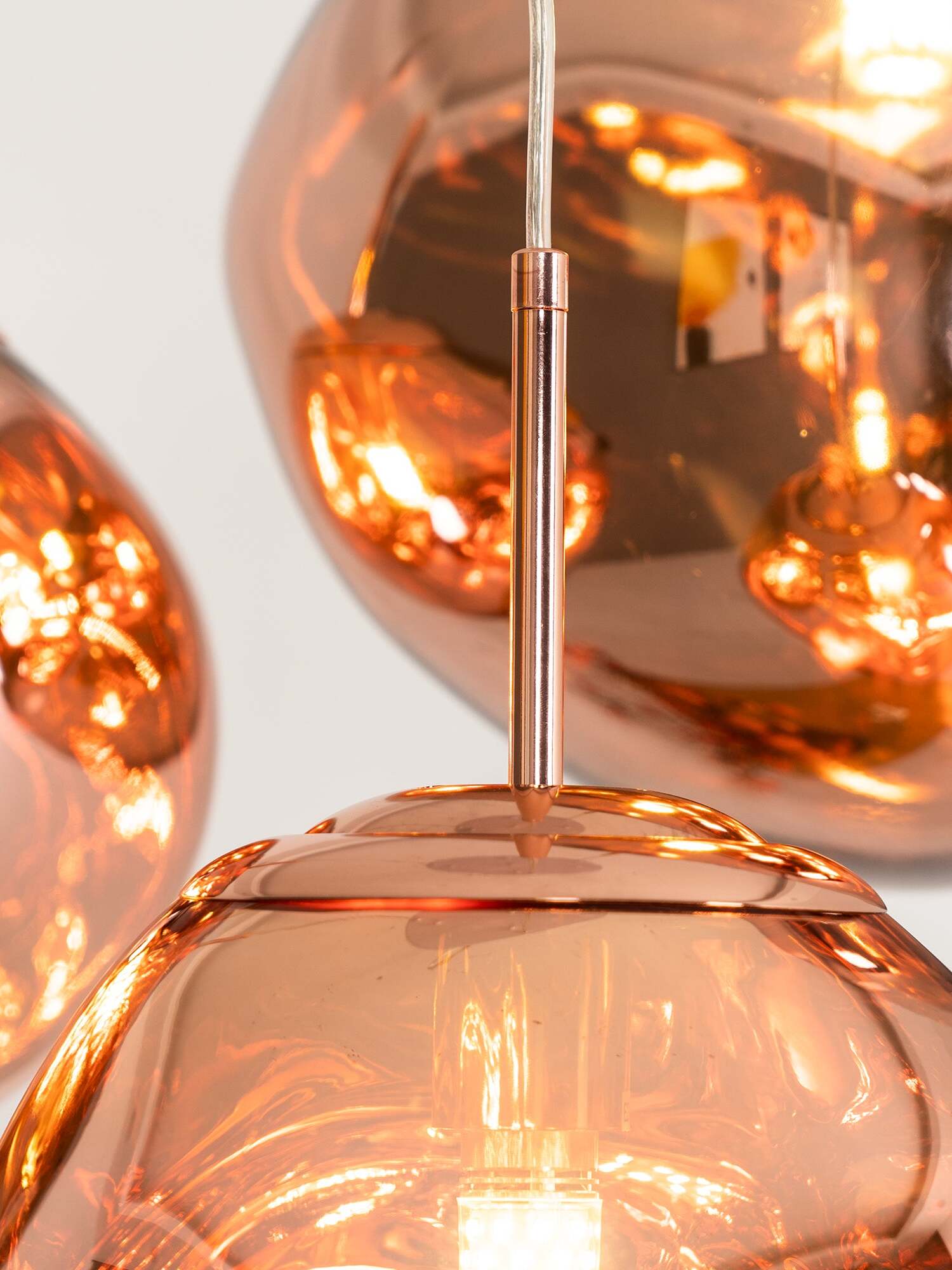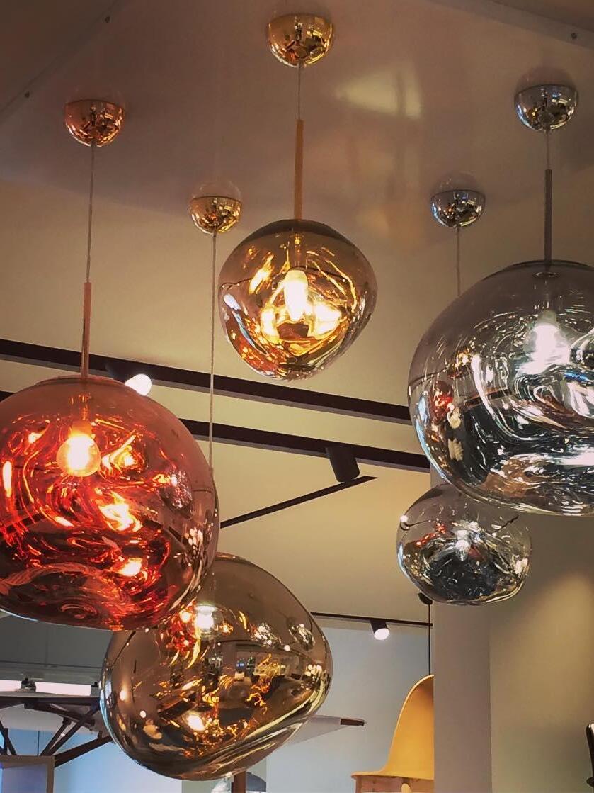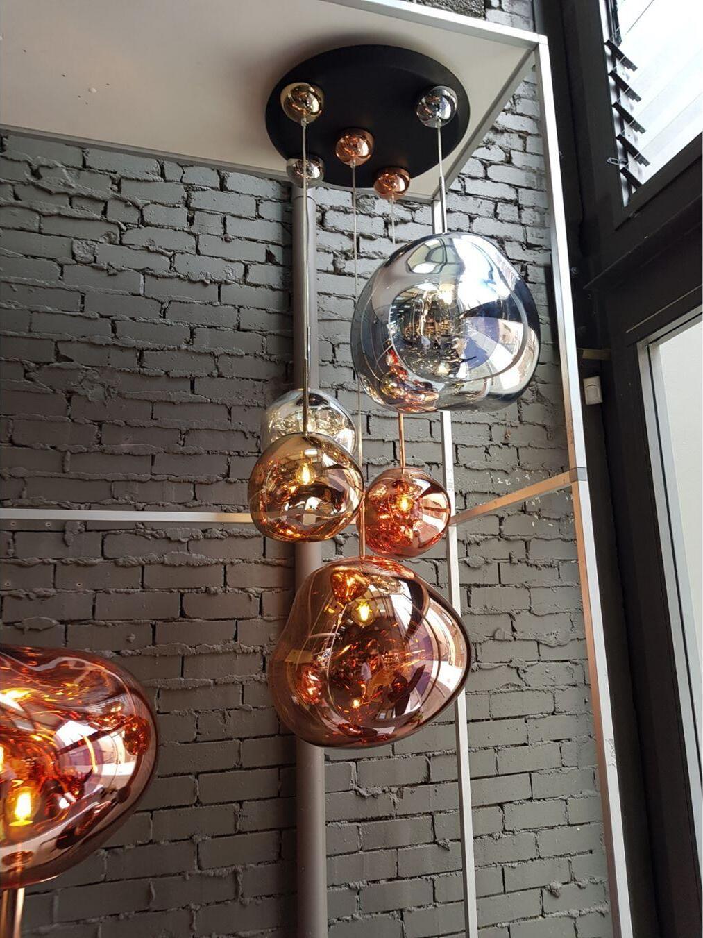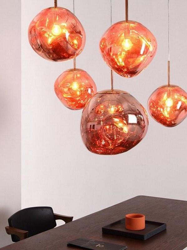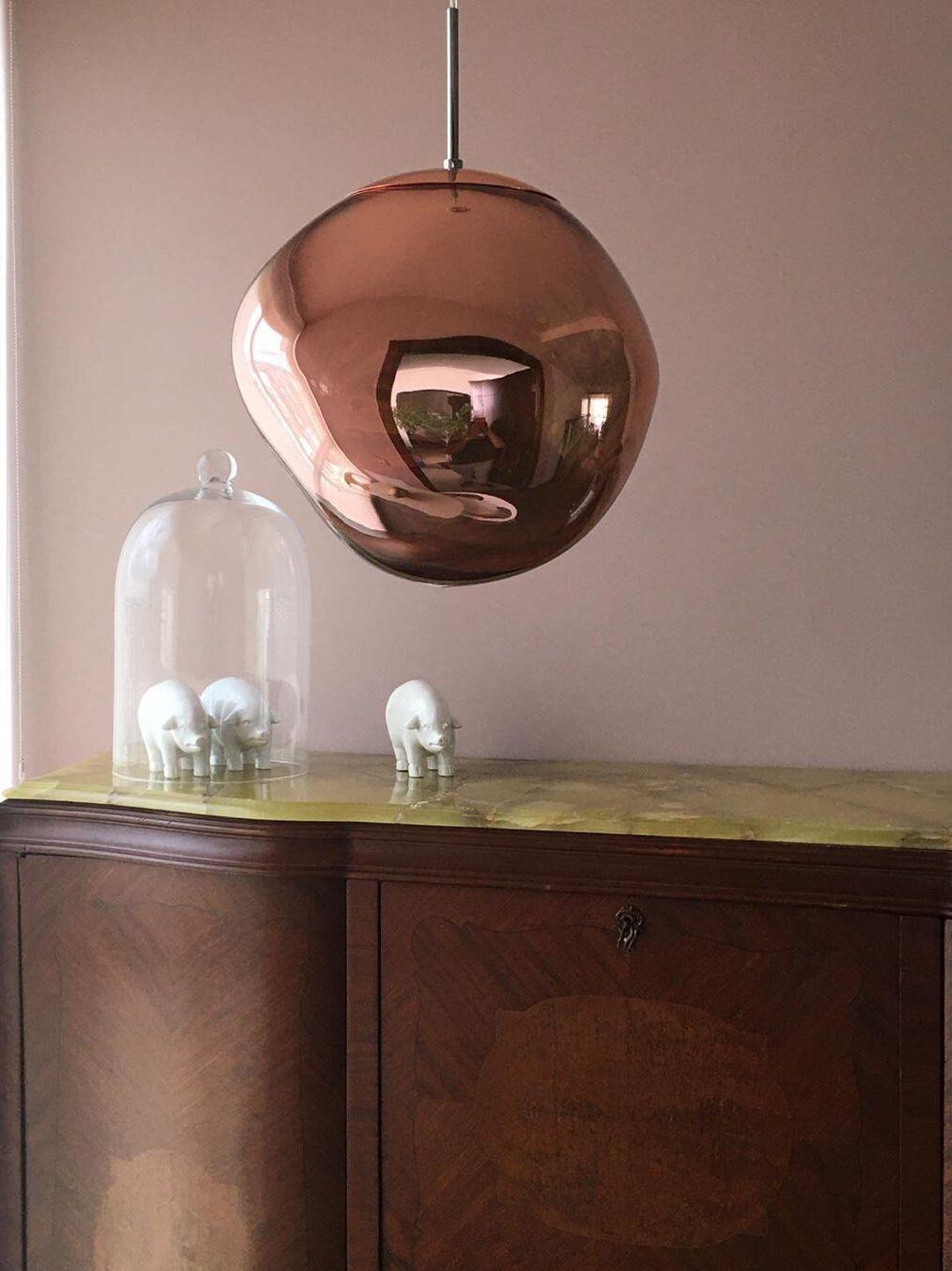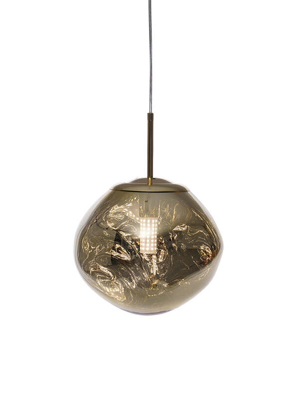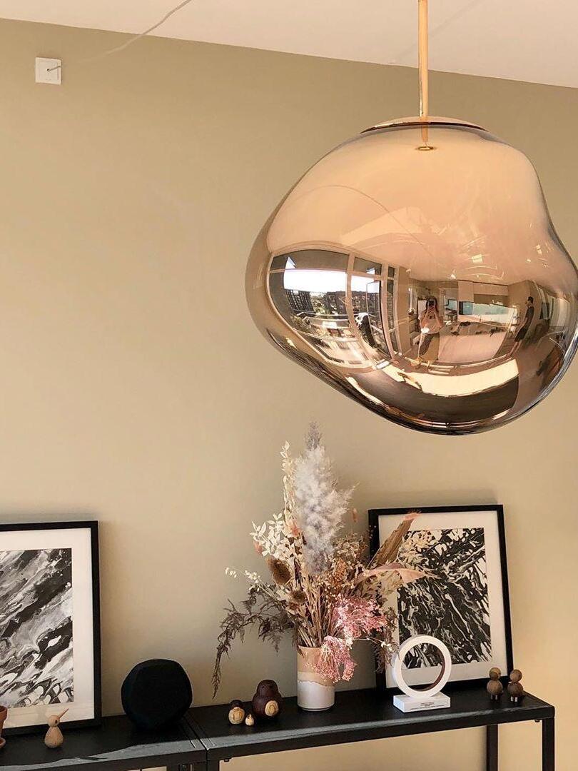 Melt is a beautifully distorted pendant light in a modern Copper finish and matching ceiling rose. Emitting an attractive, mildly hallucinogenic light, this ceiling light creates a mesmerizing melting hot-blown glass effect when on and a mirror-finish effect when off. it emits an attractive, mildly hallucinogenic light. Melt floor lamps are available in copper, chrome and gold.
