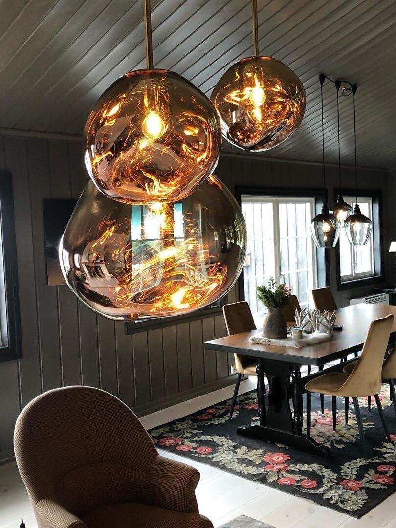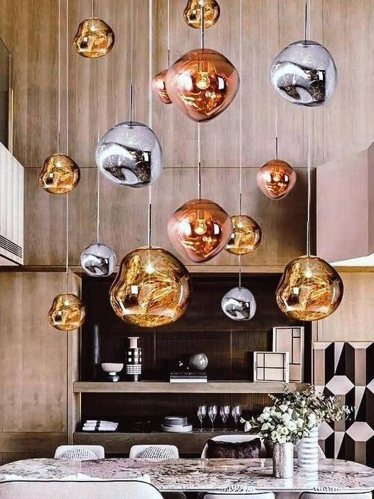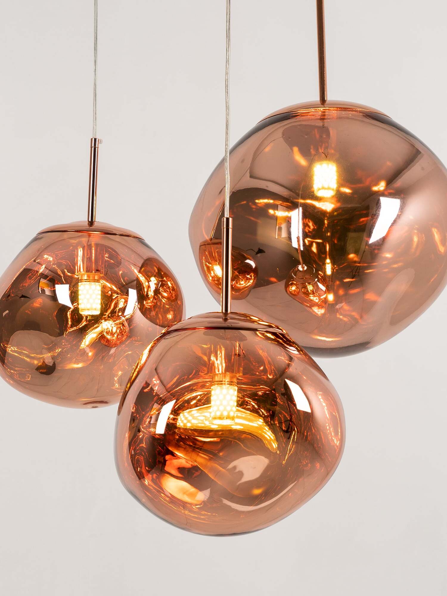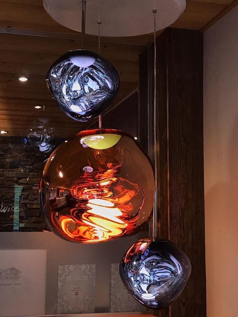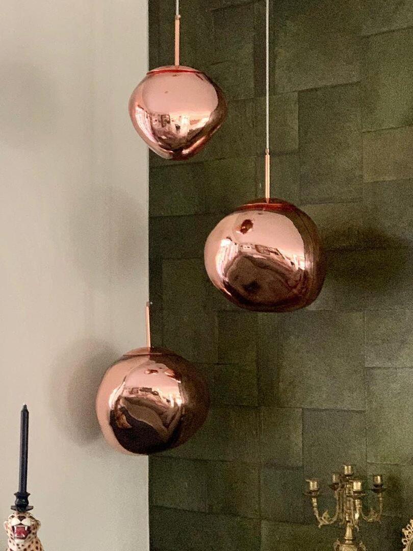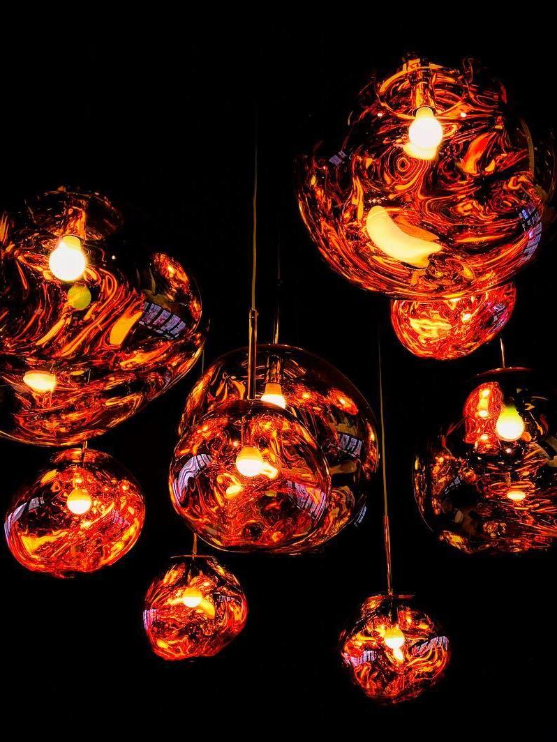 Melt is a beautifully distorted pendant light in a modern Copper finish and matching ceiling rose. Emitting an attractive, mildly hallucinogenic light, this ceiling light creates a mesmerizing melting hot-blown glass effect when on and a mirror-finish effect when off. it emits an attractive, mildly hallucinogenic light. Melt floor lamps are available in copper, chrome and gold.