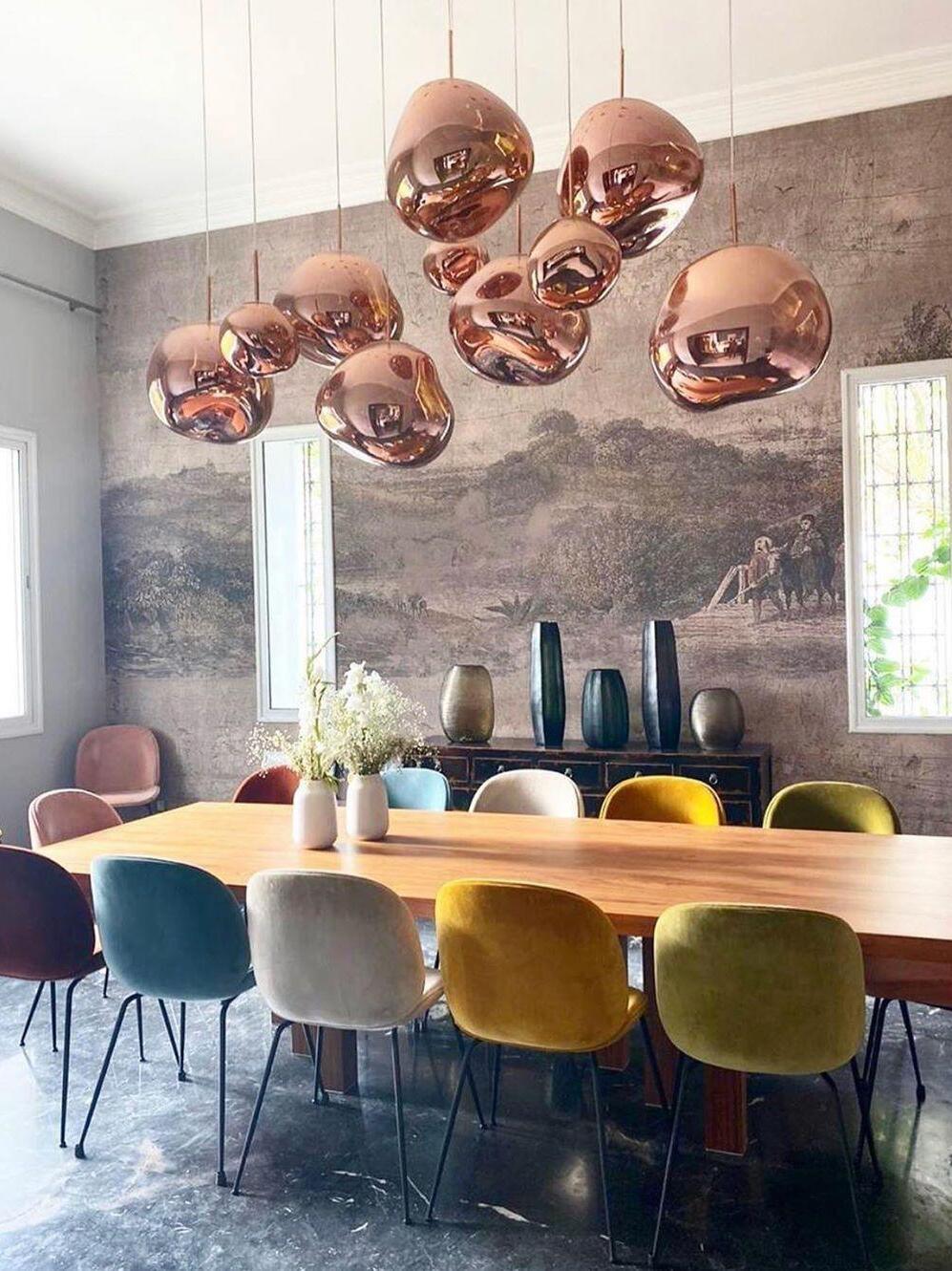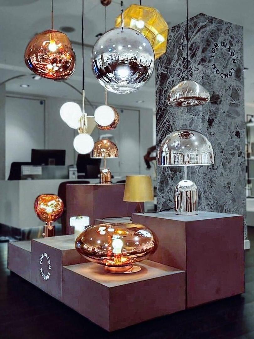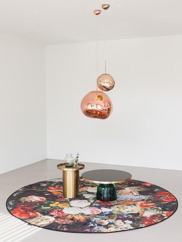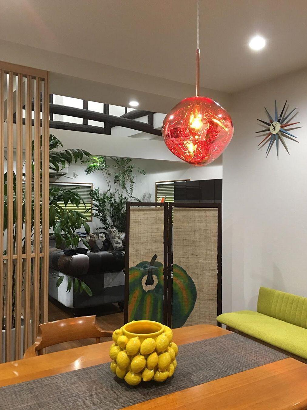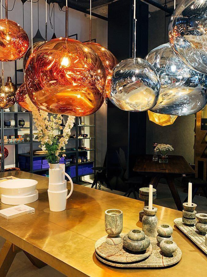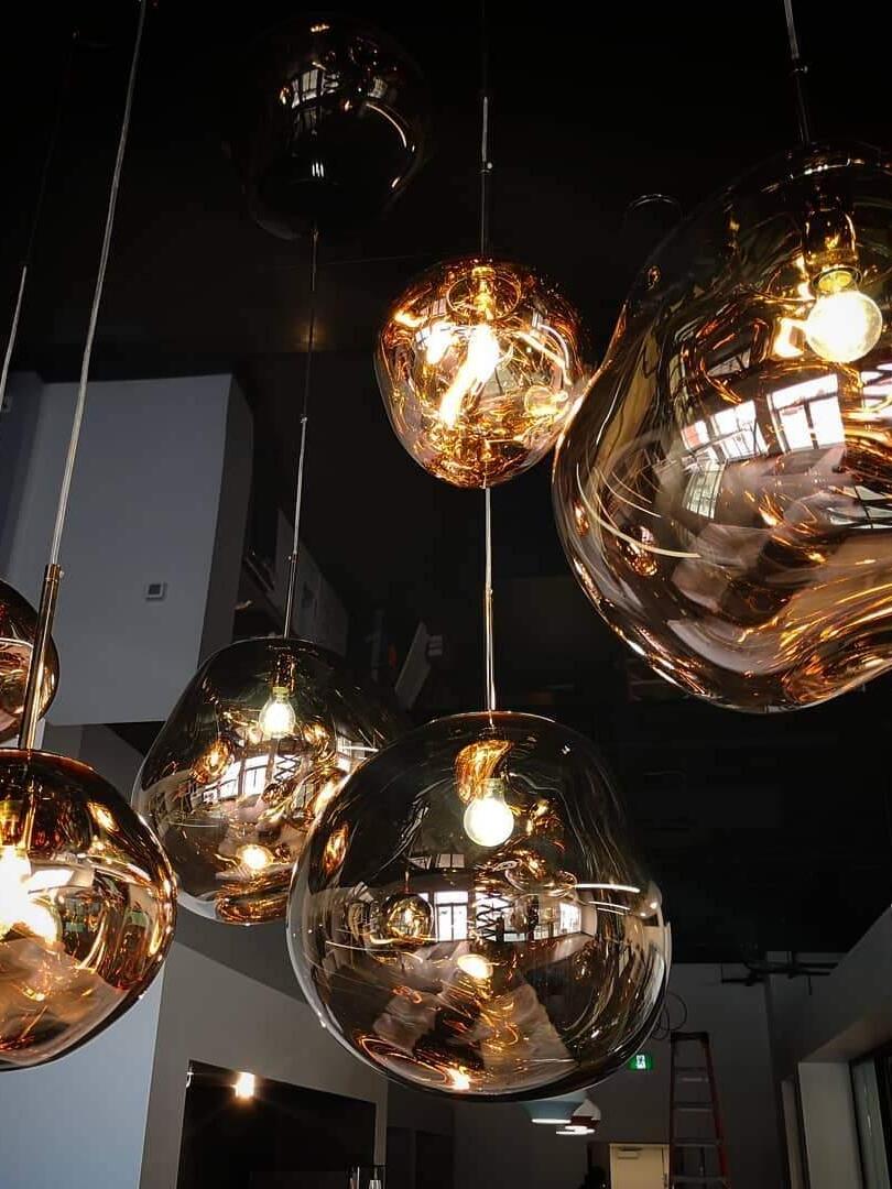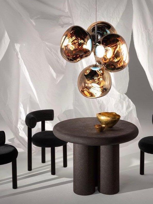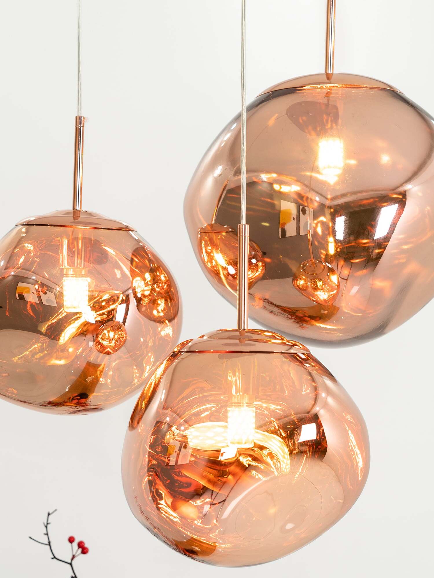 Melt is a beautifully distorted pendant light in a modern Copper finish and matching ceiling rose. Emitting an attractive, mildly hallucinogenic light, this ceiling light creates a mesmerizing melting hot-blown glass effect when on and a mirror-finish effect when off. it emits an attractive, mildly hallucinogenic light. Melt floor lamps are available in copper, chrome and gold.