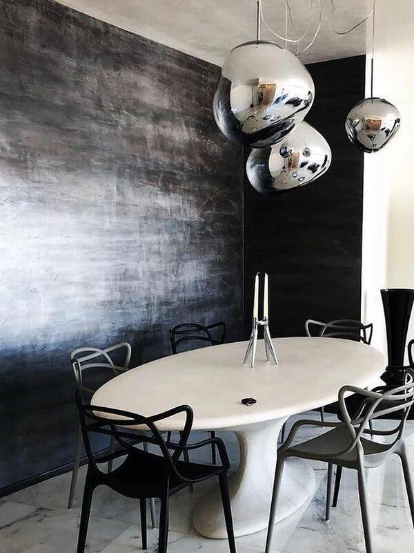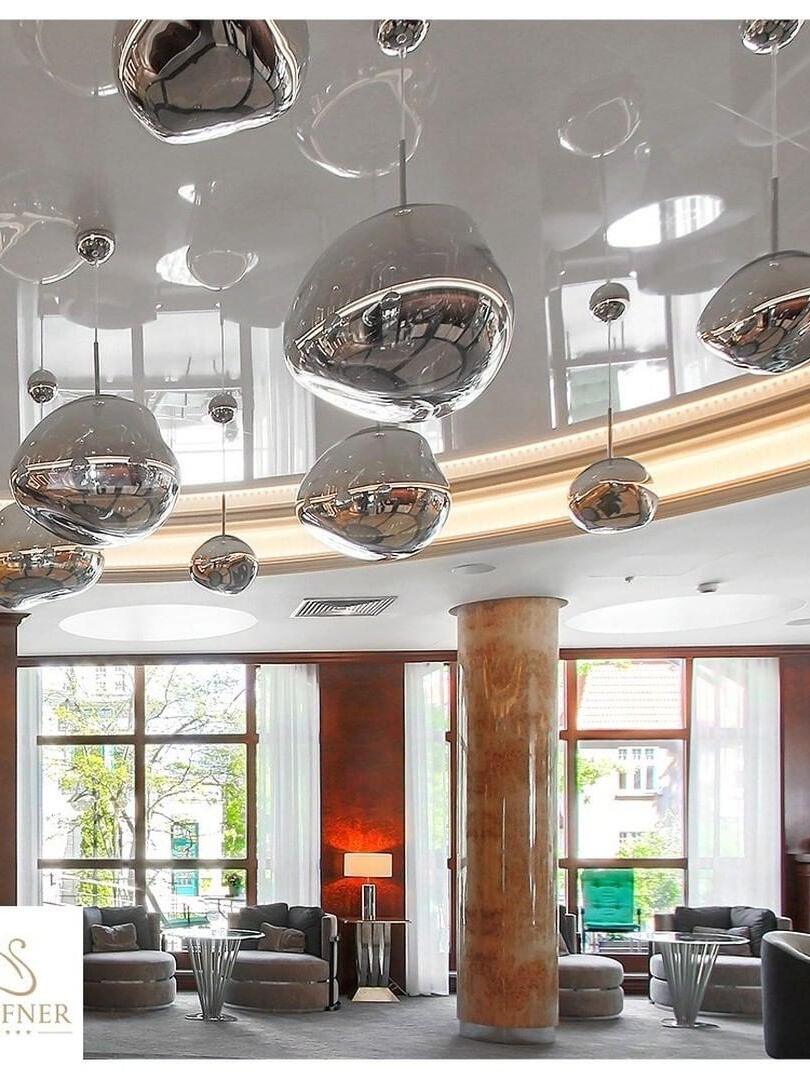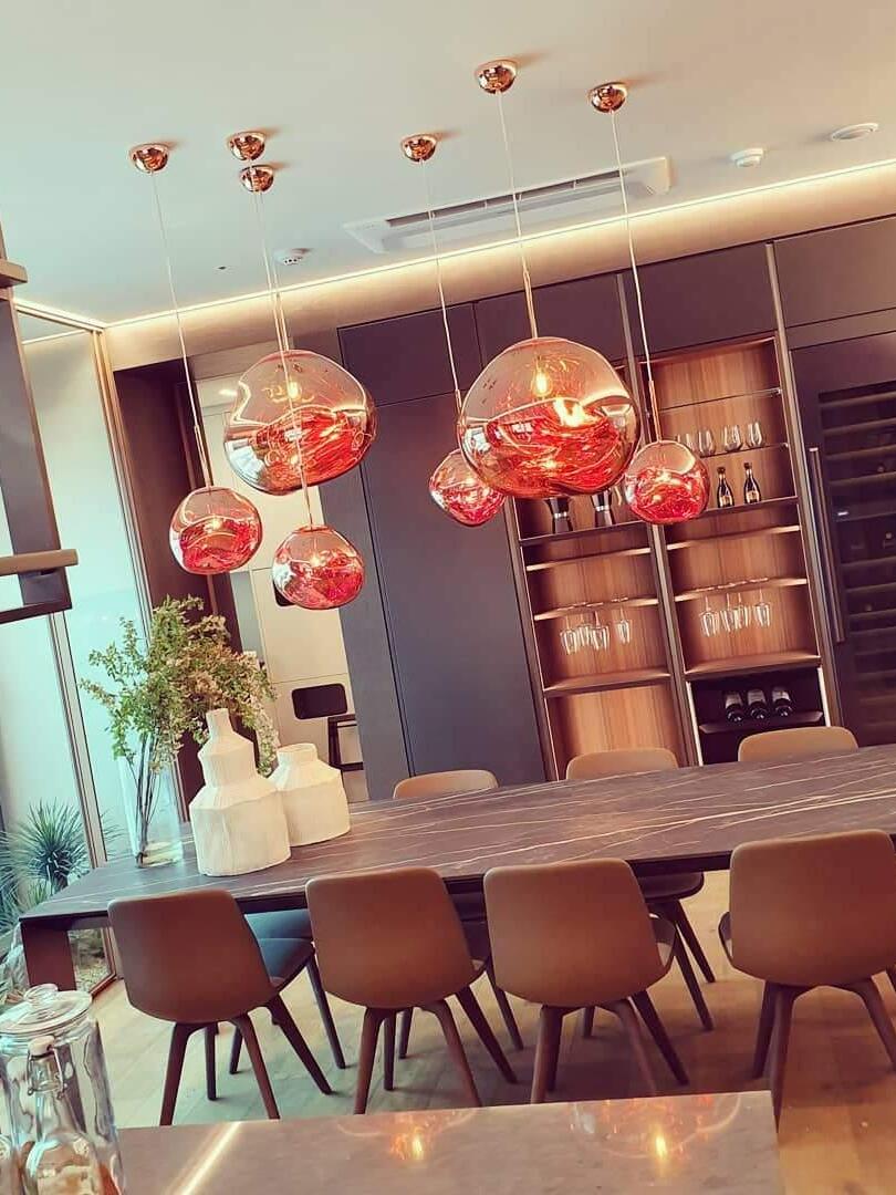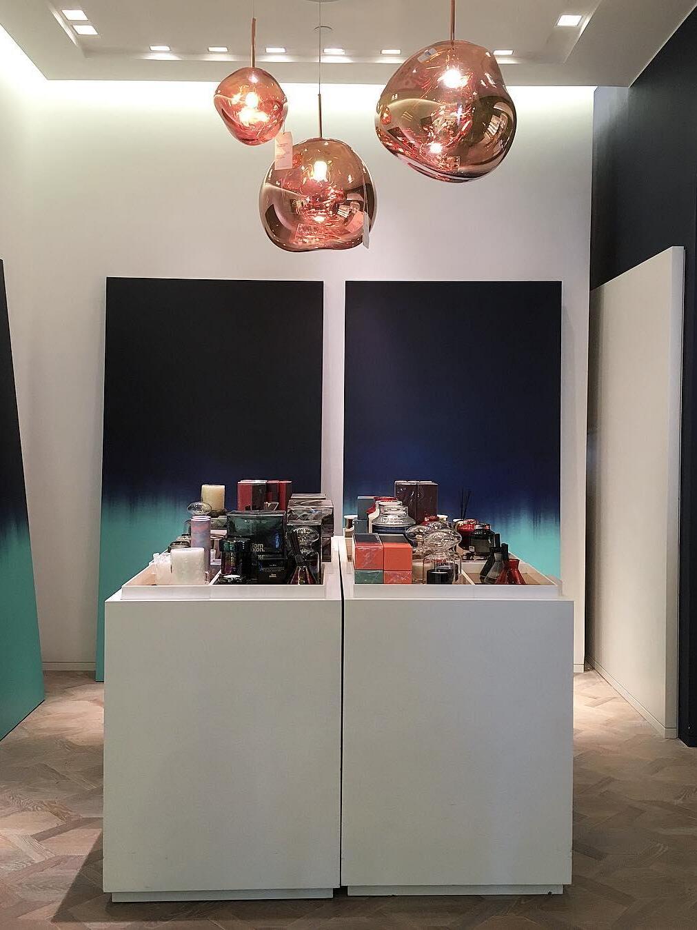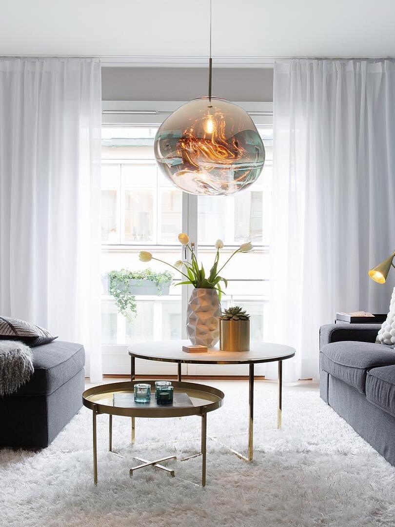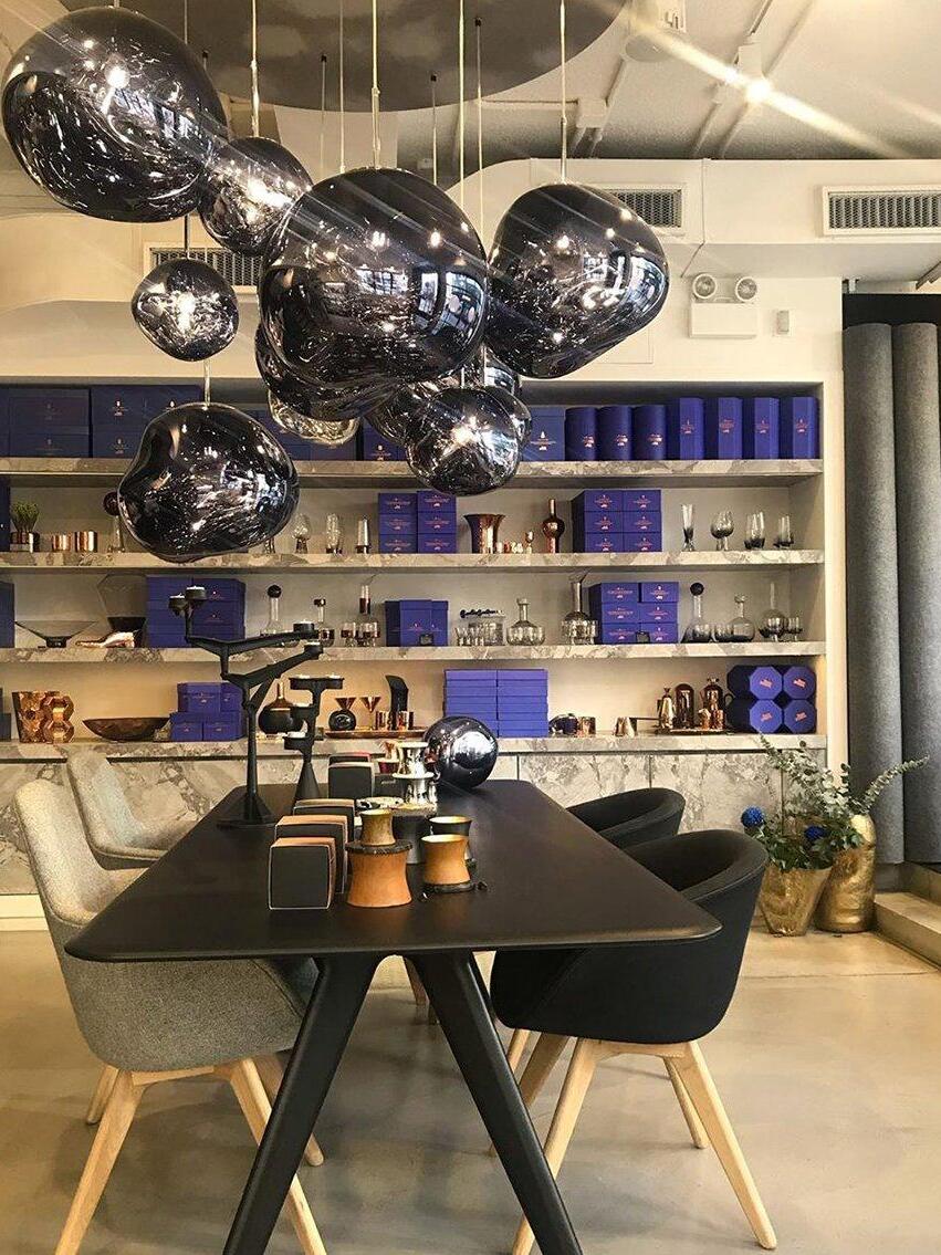 Melt is a beautifully distorted pendant light in a modern Copper finish and matching ceiling rose. Emitting an attractive, mildly hallucinogenic light, this ceiling light creates a mesmerizing melting hot-blown glass effect when on and a mirror-finish effect when off. it emits an attractive, mildly hallucinogenic light. Melt floor lamps are available in copper, chrome and gold.