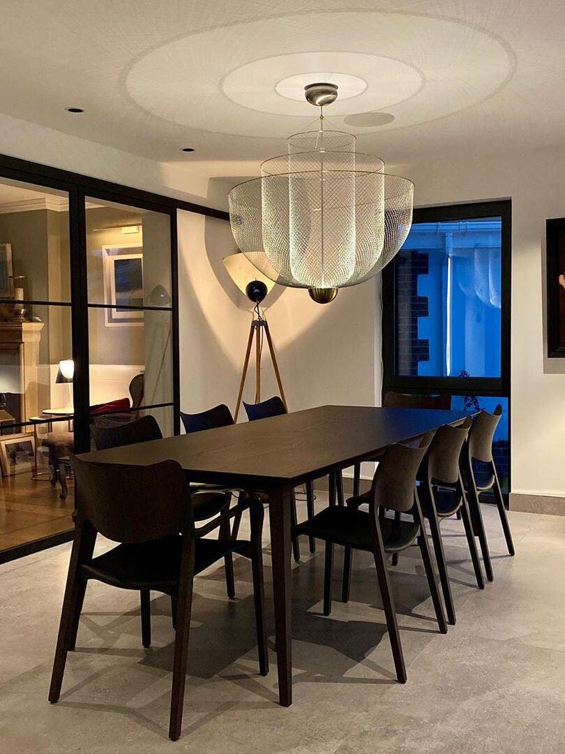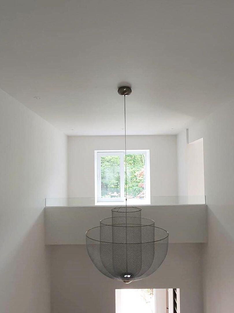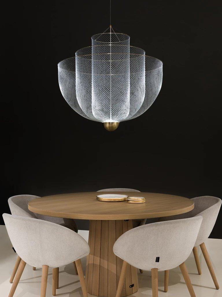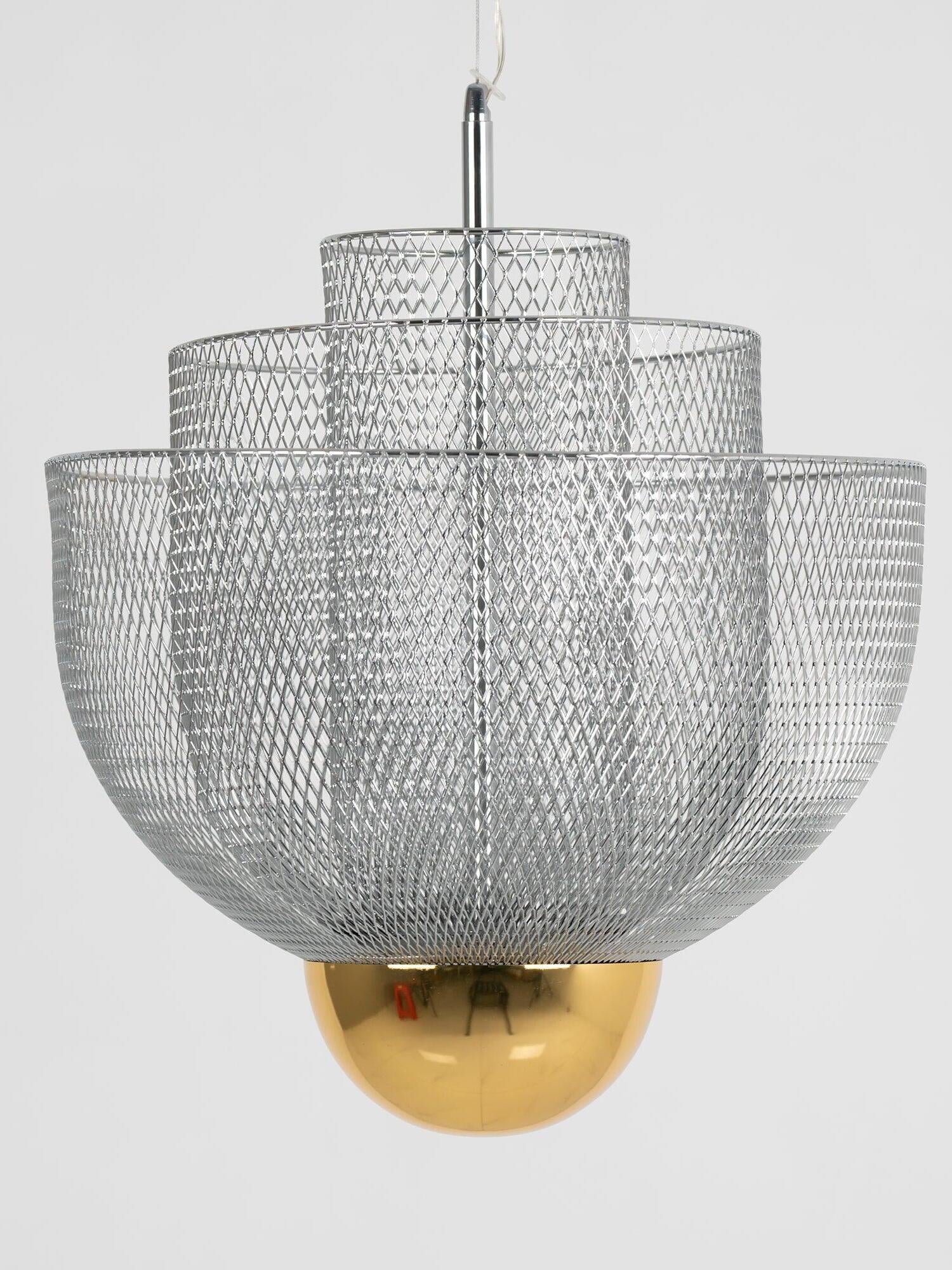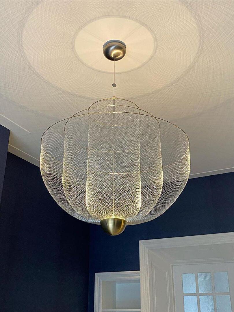 The surprising design, with the integrated LED light source that shines upwards, provides exceptional light and a play of shadows on the ceiling. The ingeniously layered steel frame shines gracefully through the LED light that with 2700 Kelvin gives a very warm white light (maximum 30 Watt). The chandelier-like lamp has a diameter of 60 centimeters and is 60 centimeters high. The transparent cable on which the lamp hangs has a maximum length of two meters.