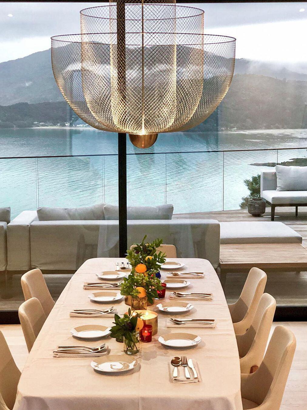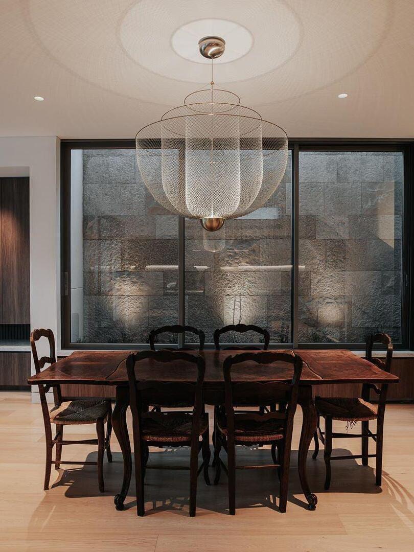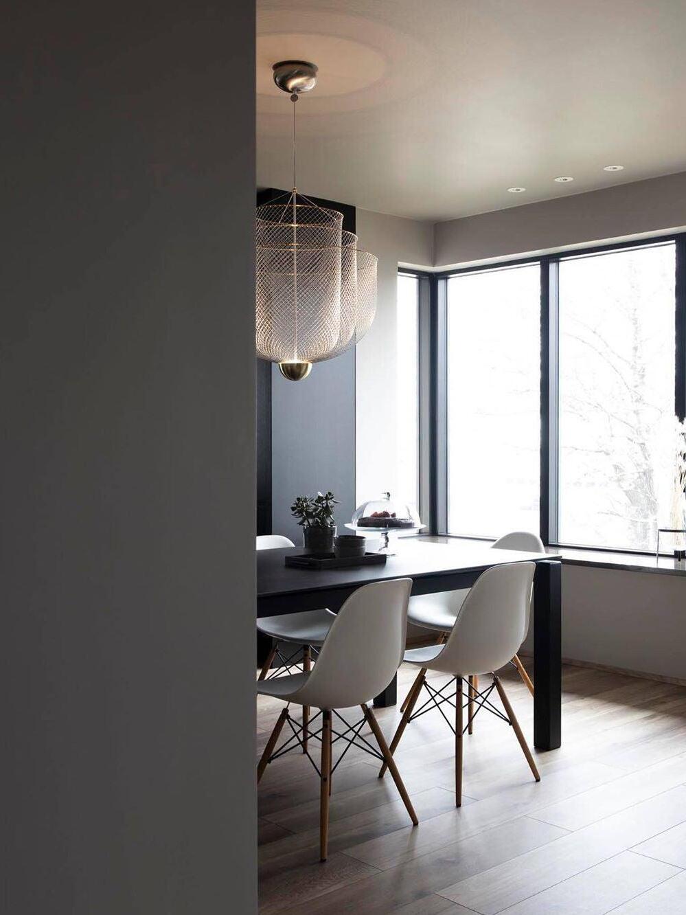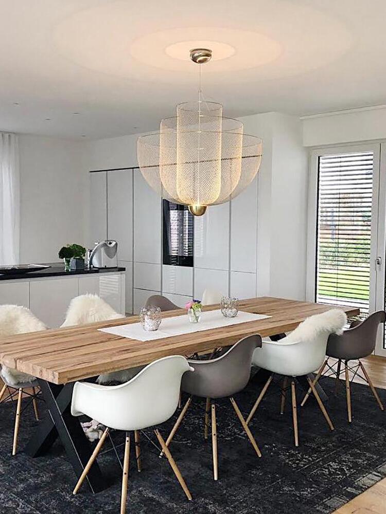 The surprising design, with the integrated LED light source that shines upwards, provides exceptional light and a play of shadows on the ceiling. The ingeniously layered steel frame shines gracefully through the LED light that with 2700 Kelvin gives a very warm white light (maximum 30 Watt). The chandelier-like lamp has a diameter of 60 centimeters and is 60 centimeters high. The transparent cable on which the lamp hangs has a maximum length of two meters.