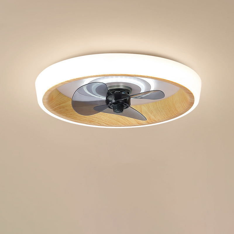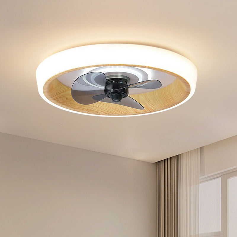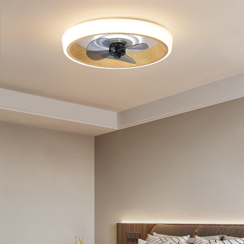 Modern Minimalist Round Wood Grain Aluminum Acrylic LED Flush Mount Ceiling Fan Light For Bedroom