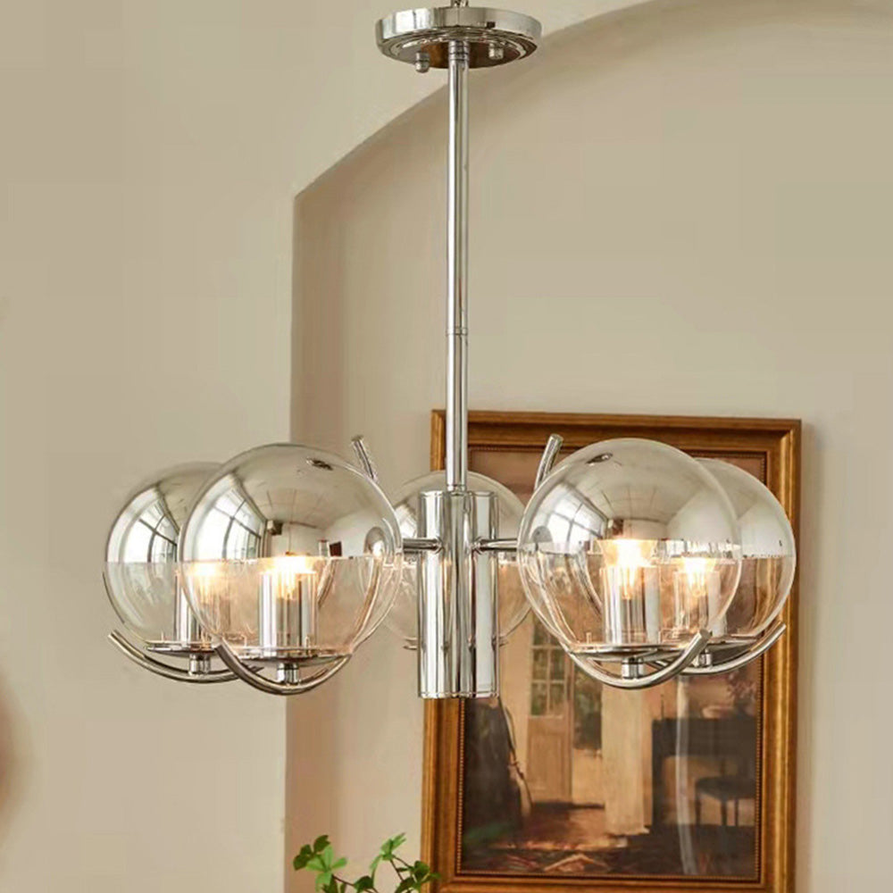 The spherical and linear arms combine to create a new look for this contemporary chandelier. The translucent mirrored glass shade adds charm and practicality, providing style to both modern and more classic interiors.