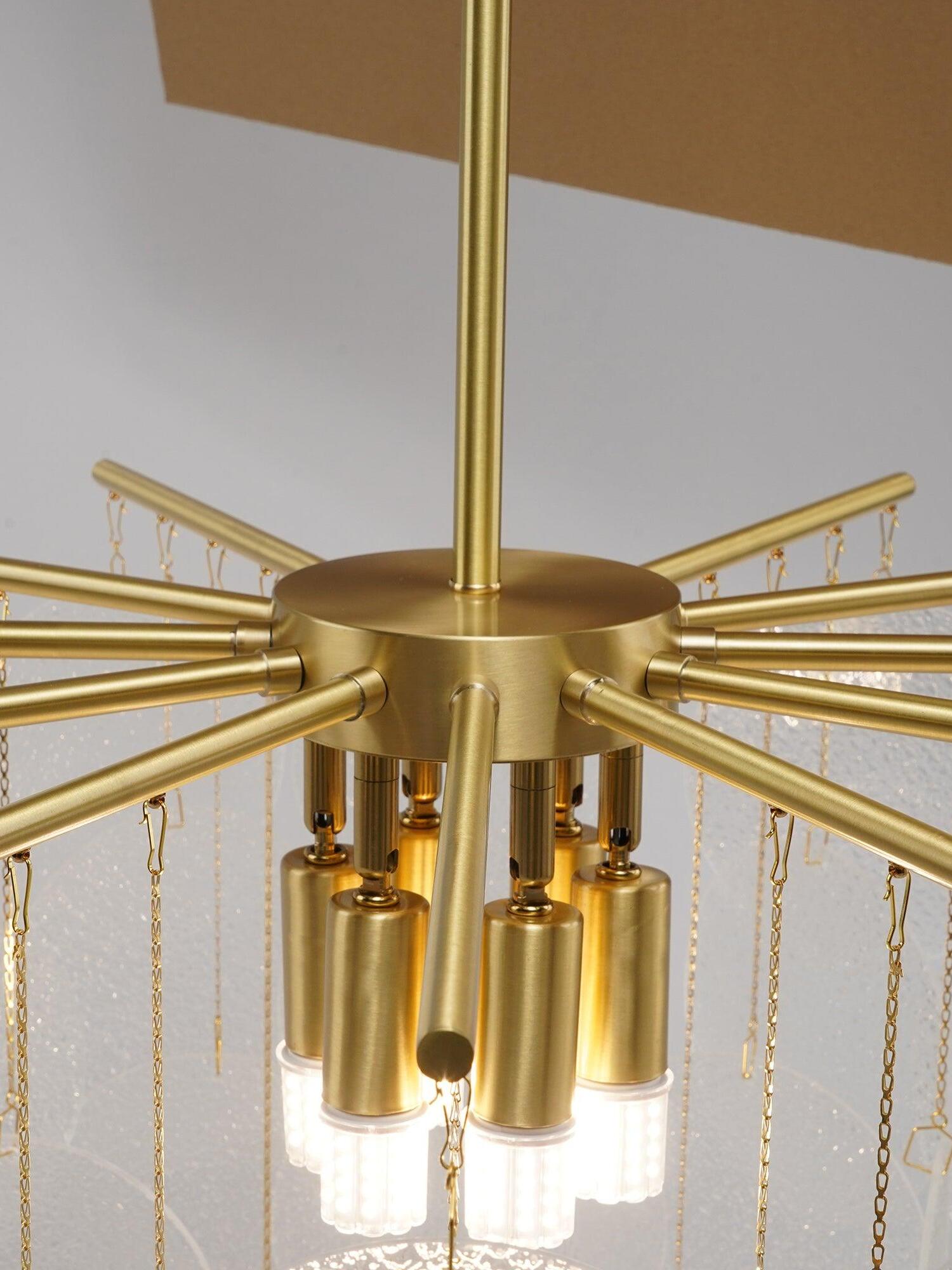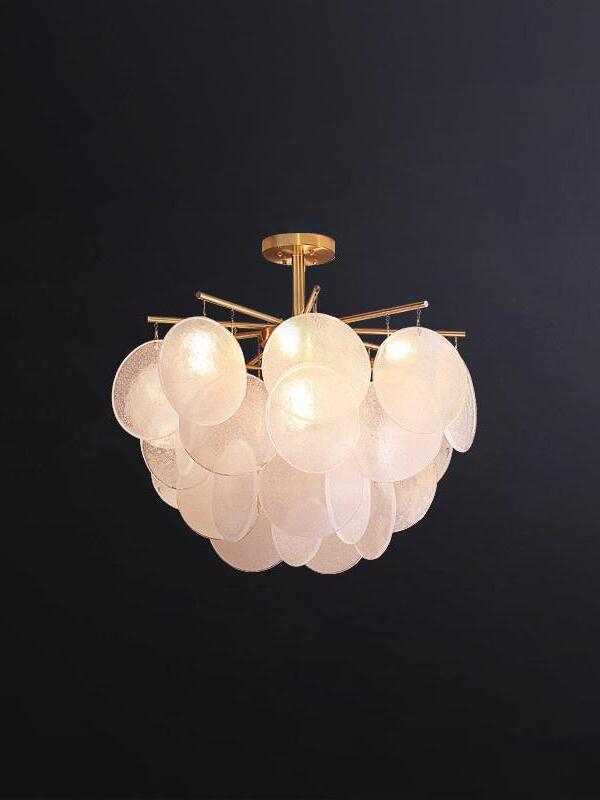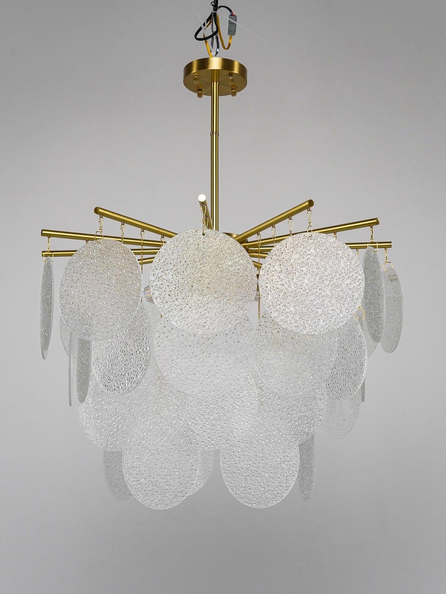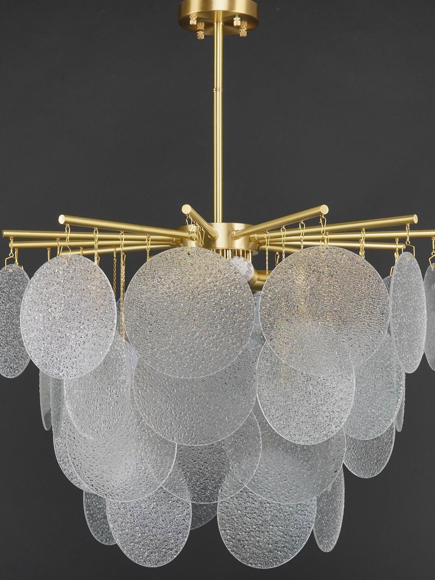 Each piece of glass is unique. The droplets are hand-formed by our artisans using a process where undulations and crystal-like textures form. The translucent glass is complemented and beautifully framed by the symmetrical metalwork. The light emitted is a warm, soft glow.