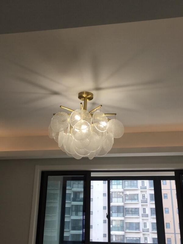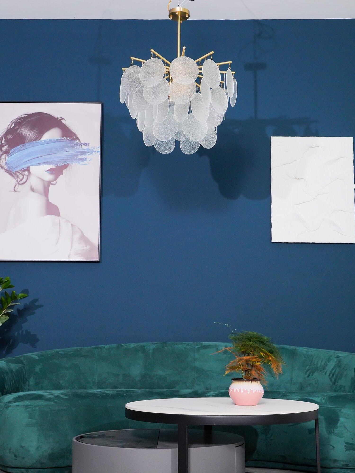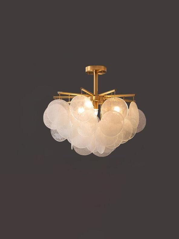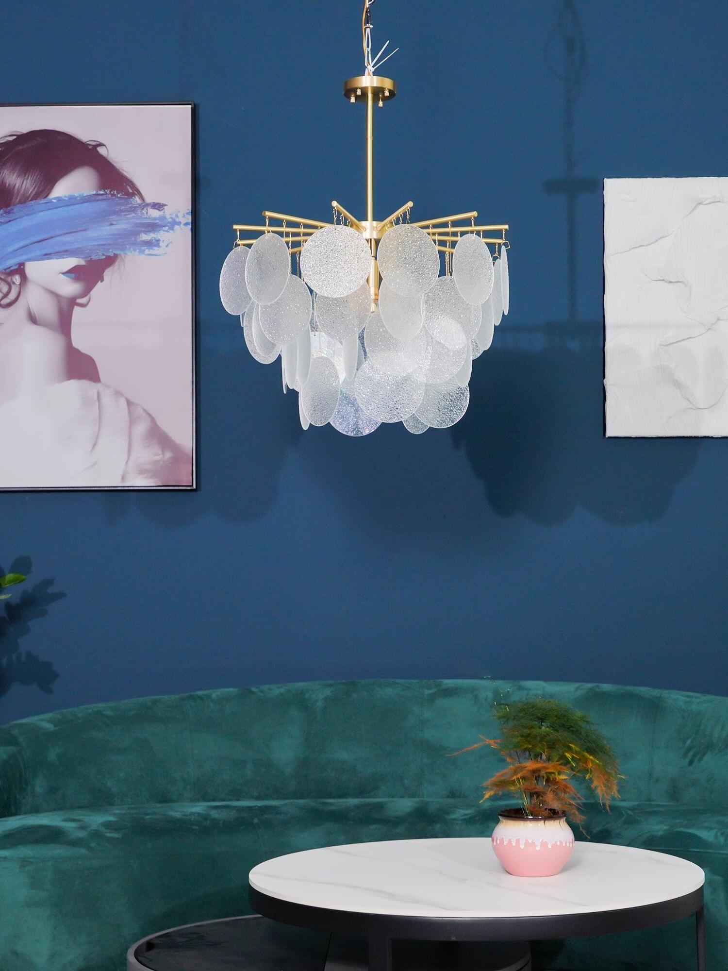 Each piece of glass is unique. The droplets are hand-formed by our artisans using a process where undulations and crystal-like textures form. The translucent glass is complemented and beautifully framed by the symmetrical metalwork. The light emitted is a warm, soft glow.