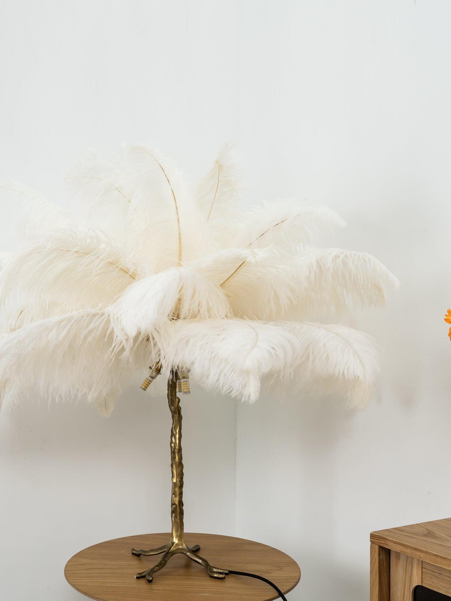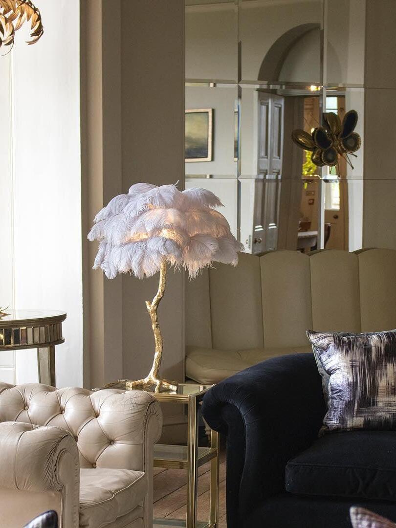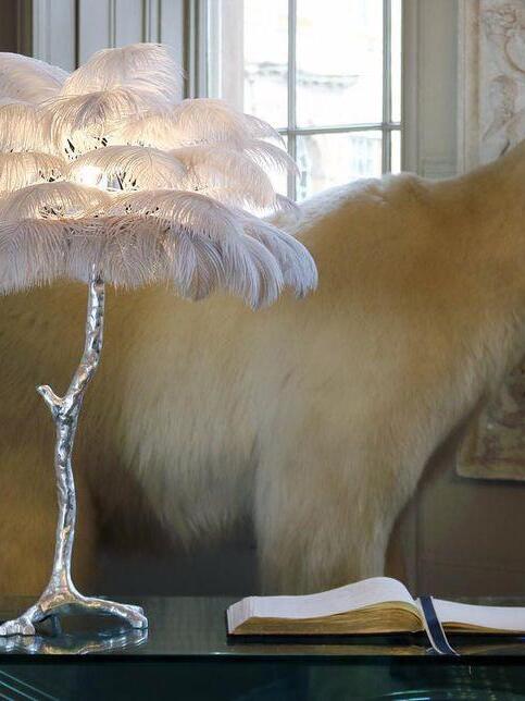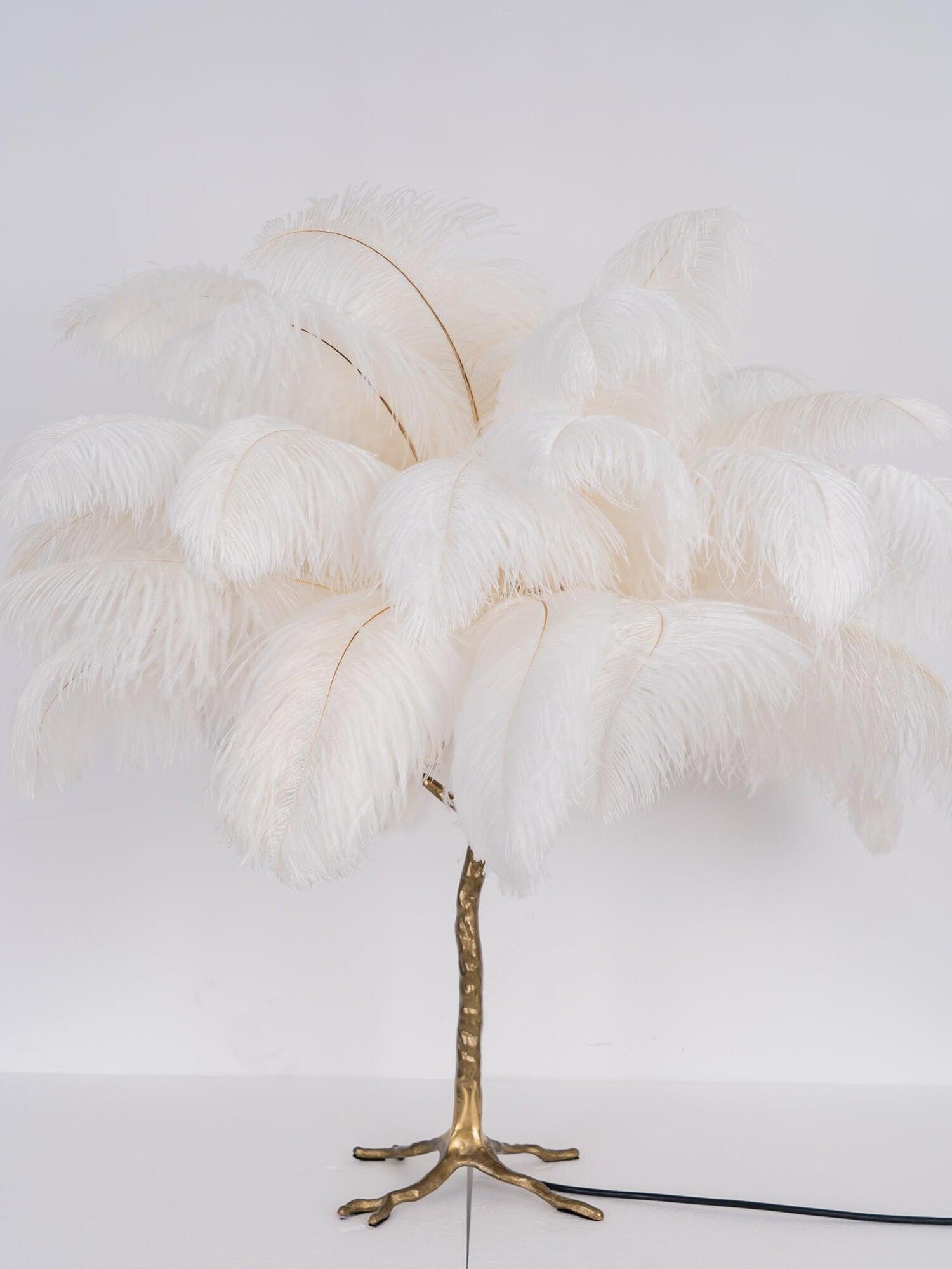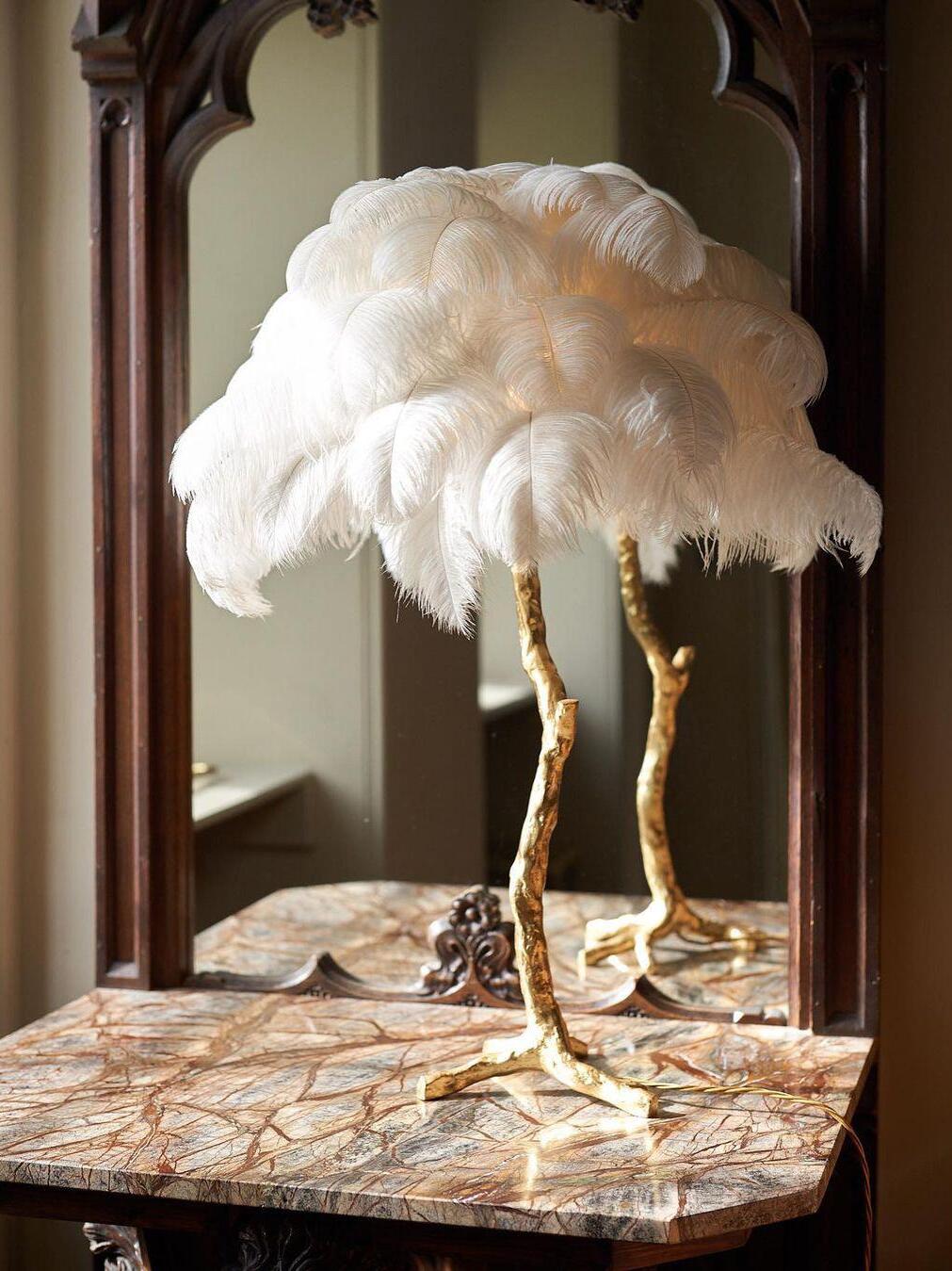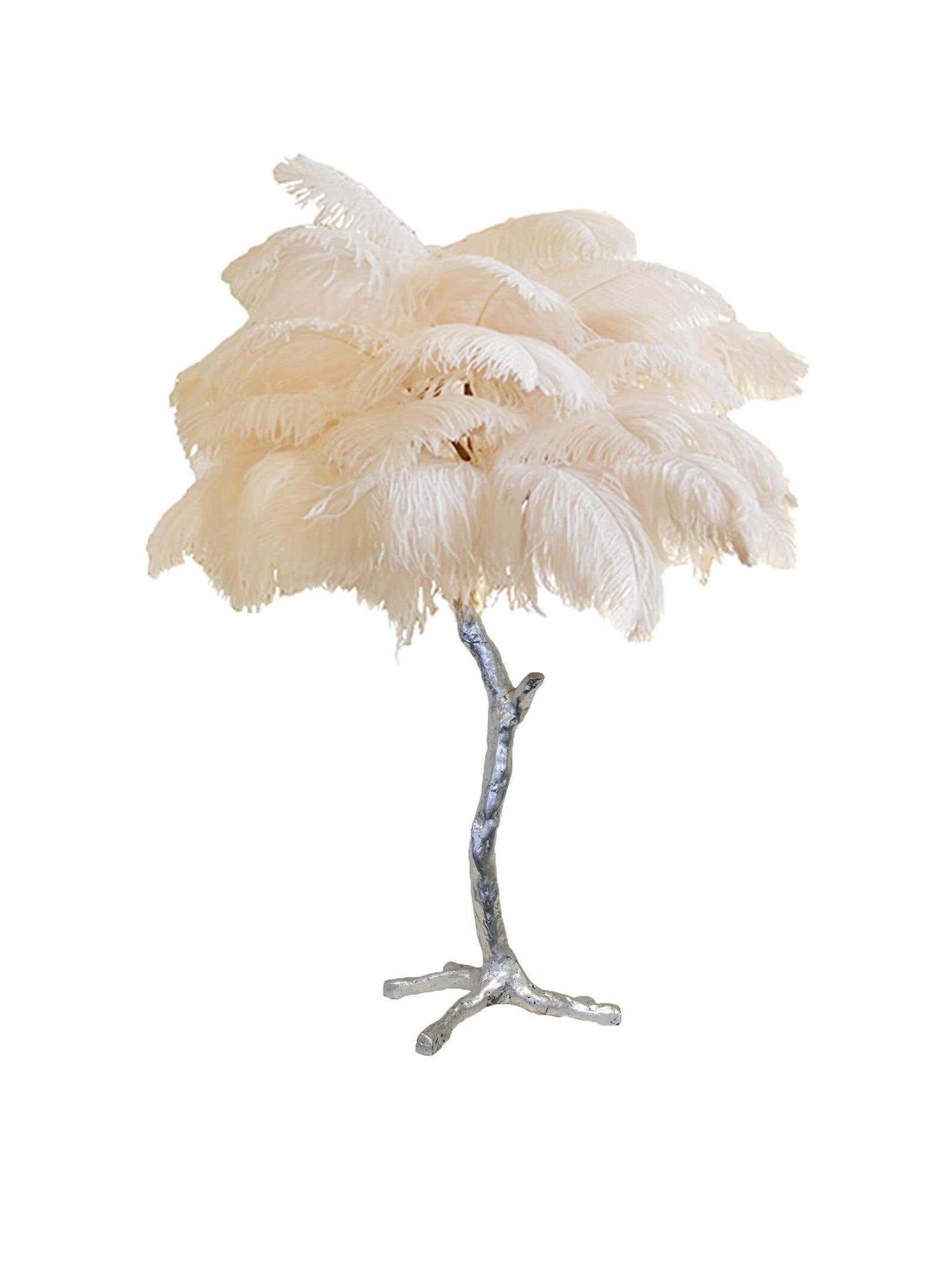 An illuminating palm tree, resplendent with exquisite ostrich feather foliage, the feather table lamp takes centre stage in any luxury setting and delivers the ultimate midas touch to Hollywood regency decors. this lighting work of art commands attention to its exquisite design and intricate craftsmanship.