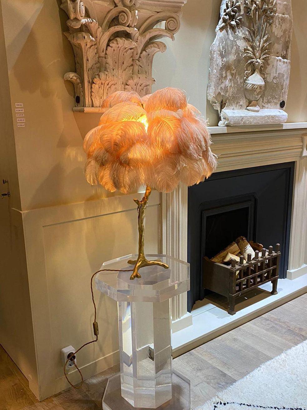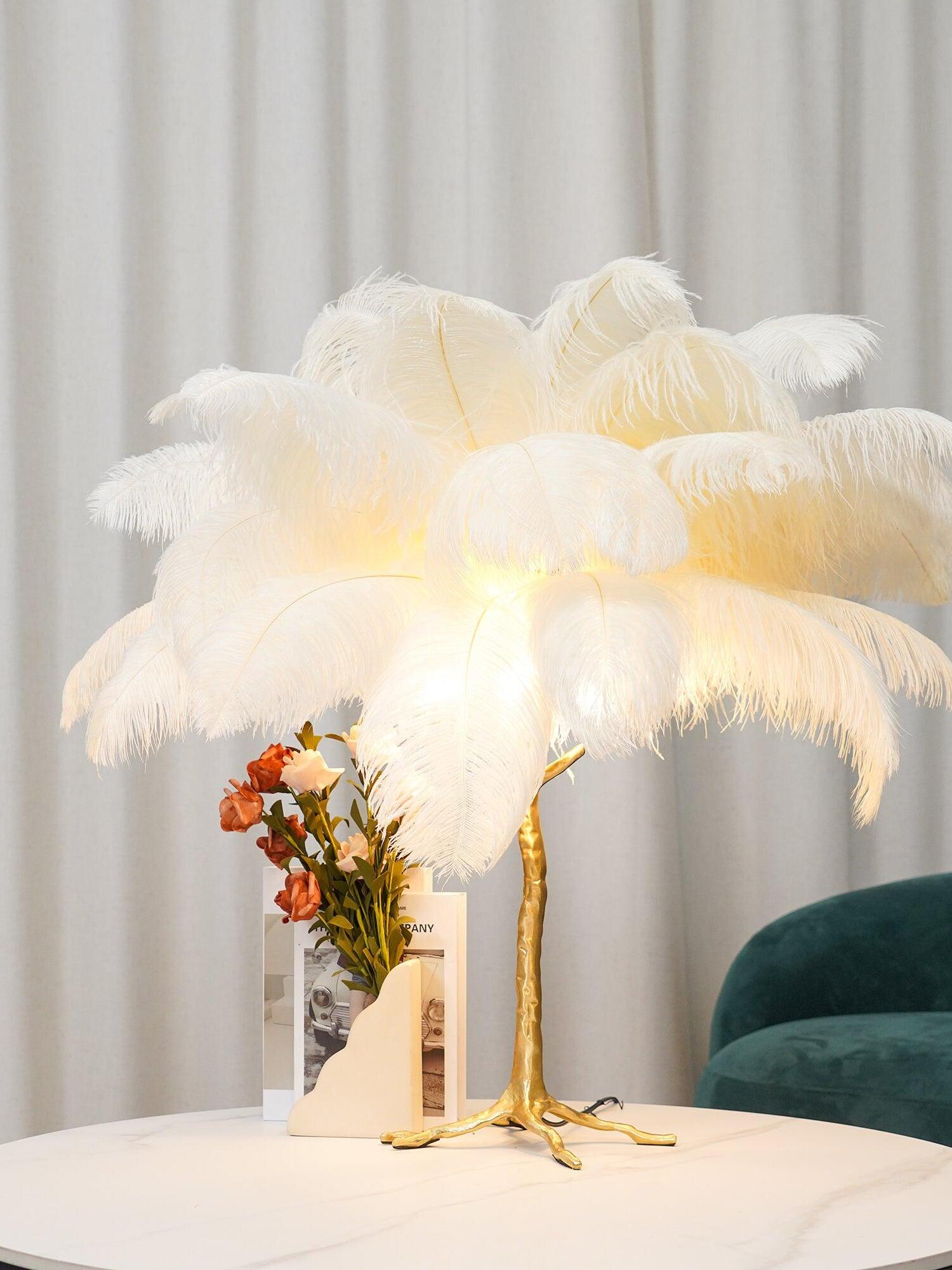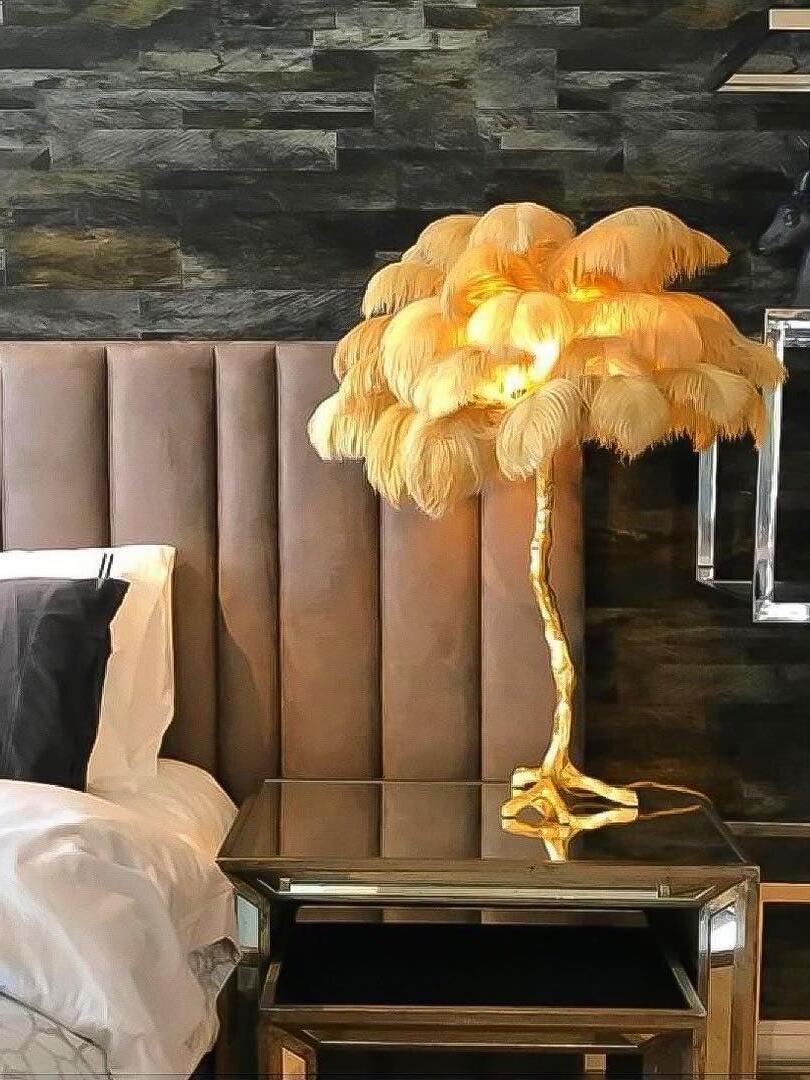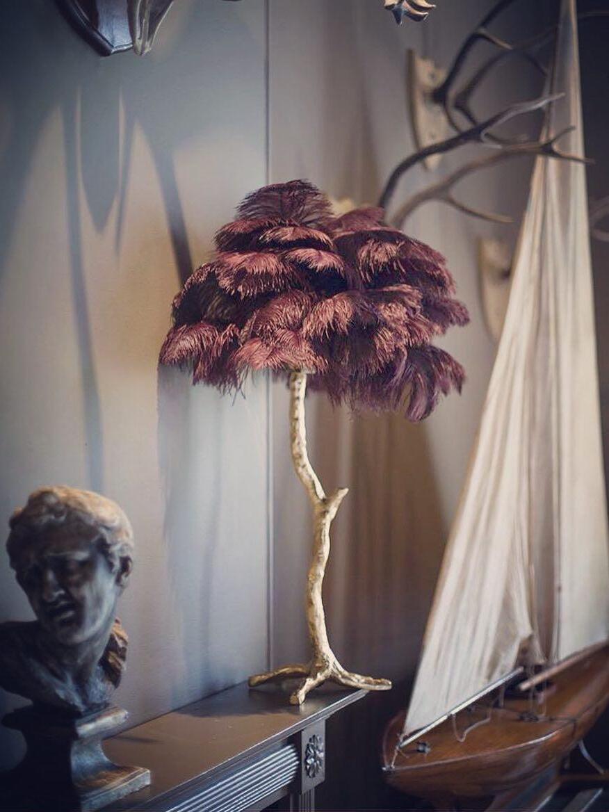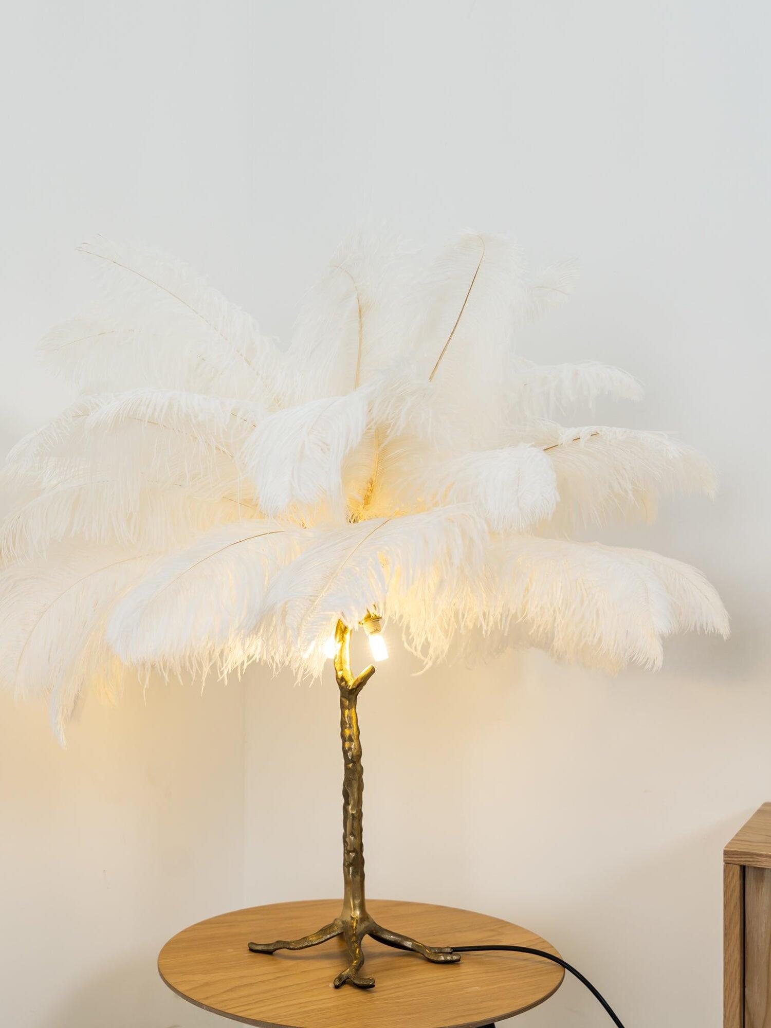 An illuminating palm tree, resplendent with exquisite ostrich feather foliage, the feather table lamp takes centre stage in any luxury setting and delivers the ultimate midas touch to Hollywood regency decors. this lighting work of art commands attention to its exquisite design and intricate craftsmanship.