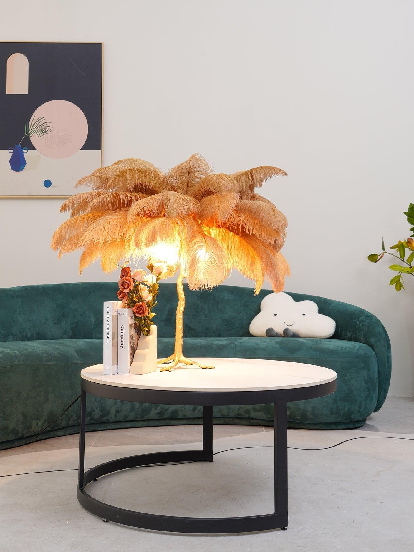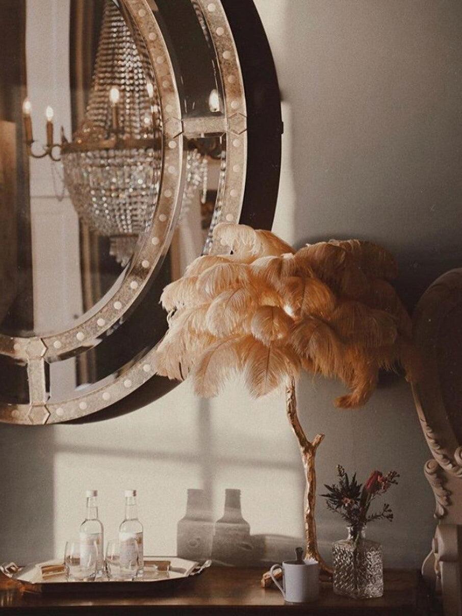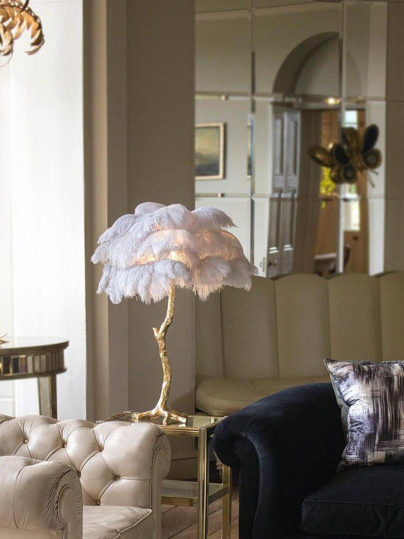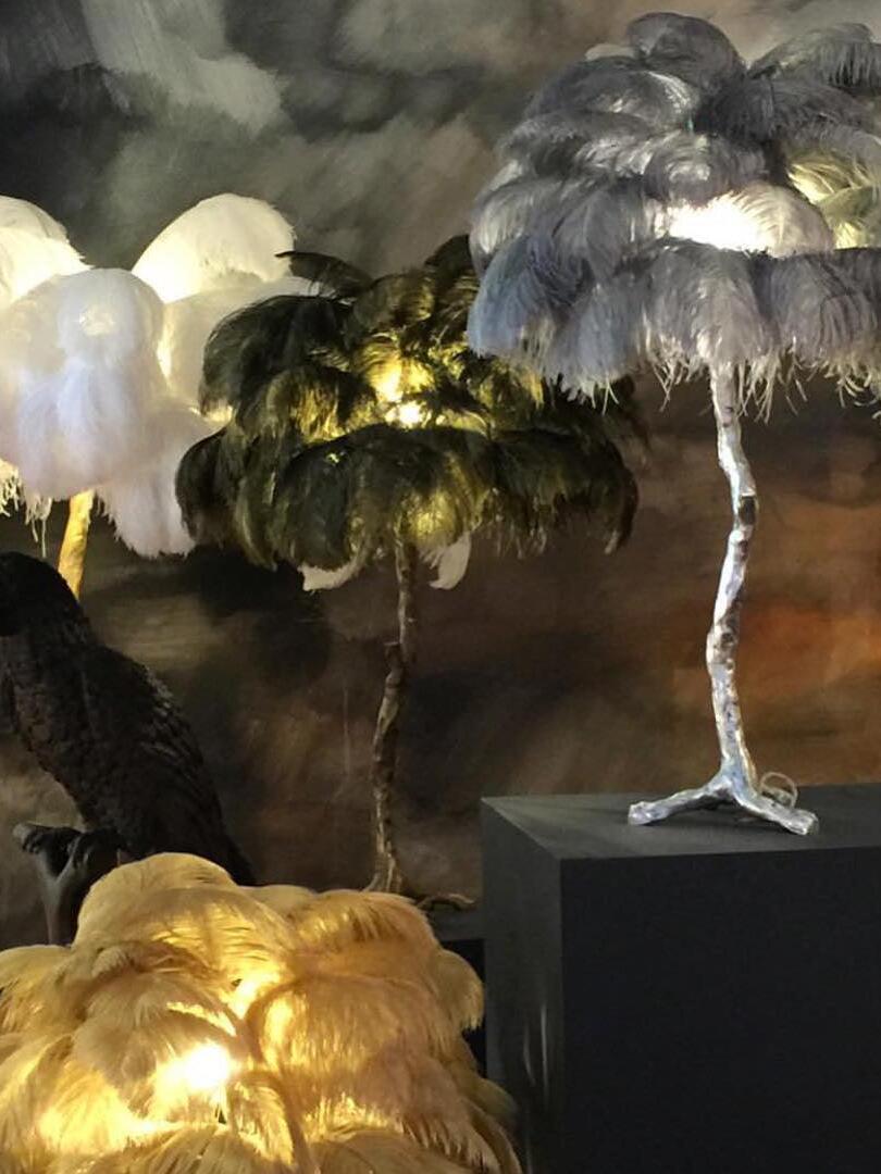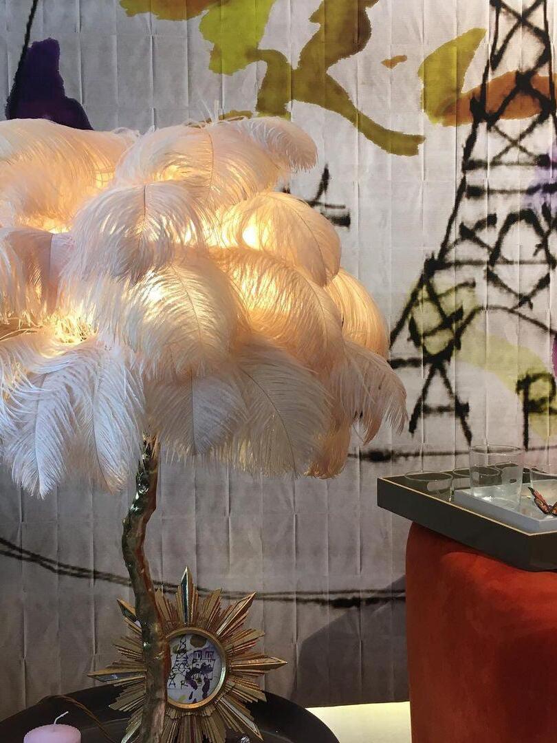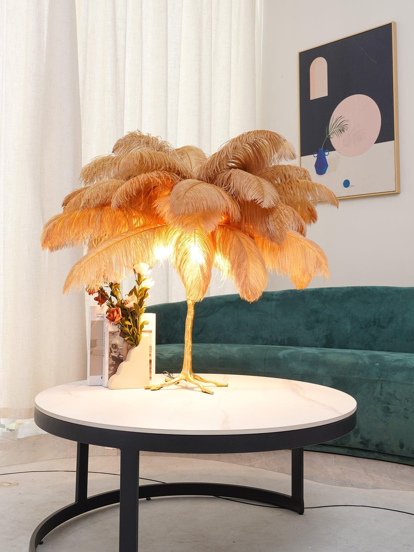 An illuminating palm tree, resplendent with exquisite ostrich feather foliage, the feather table lamp takes centre stage in any luxury setting and delivers the ultimate midas touch to Hollywood regency decors. this lighting work of art commands attention to its exquisite design and intricate craftsmanship.