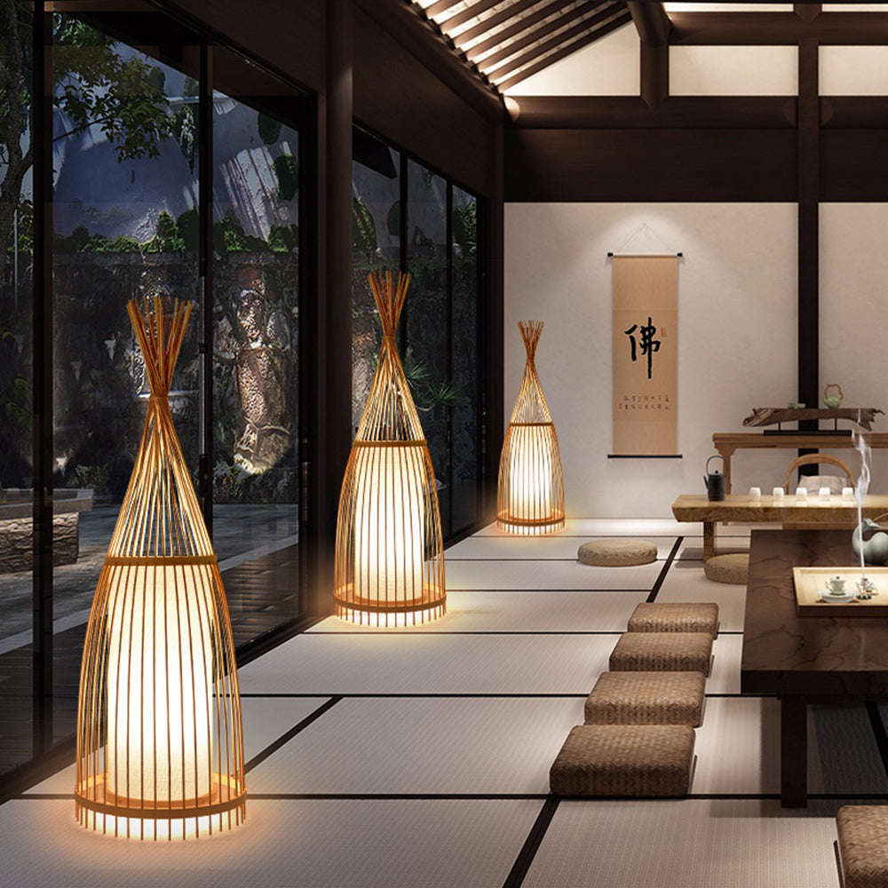 - This floor lamp boasts a unique and captivating cylindrical shape. The straight bamboo knots gracefully encircle the lamp's top, creating an intricate pattern that adds character and charm. The cylindrical design not only adds a touch of sophistication but also ensures that the lamp's illumination is distributed evenly, providing a soft, diffused glow that enhances the ambiance of your room.