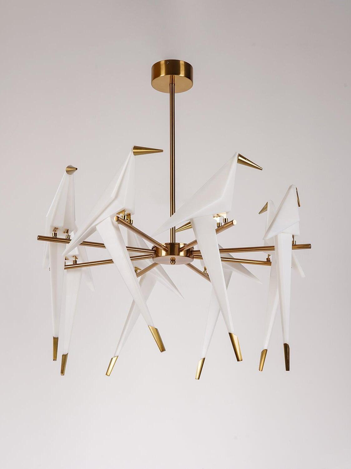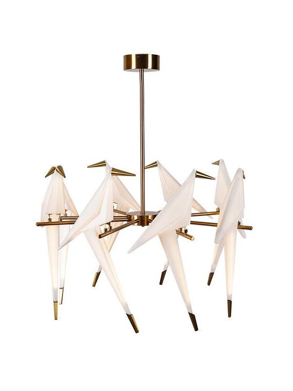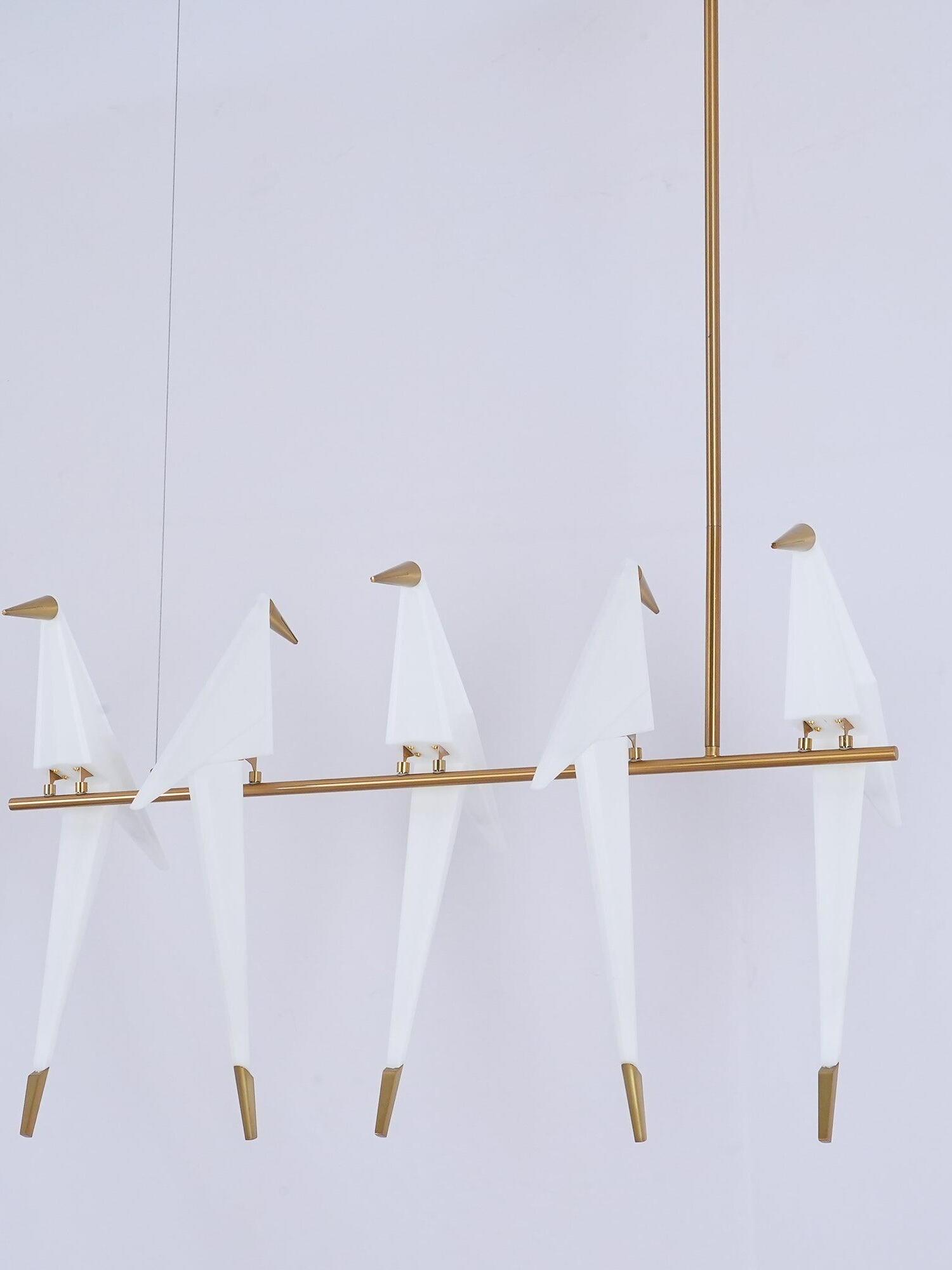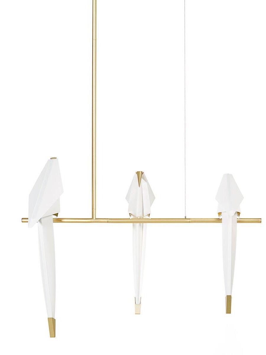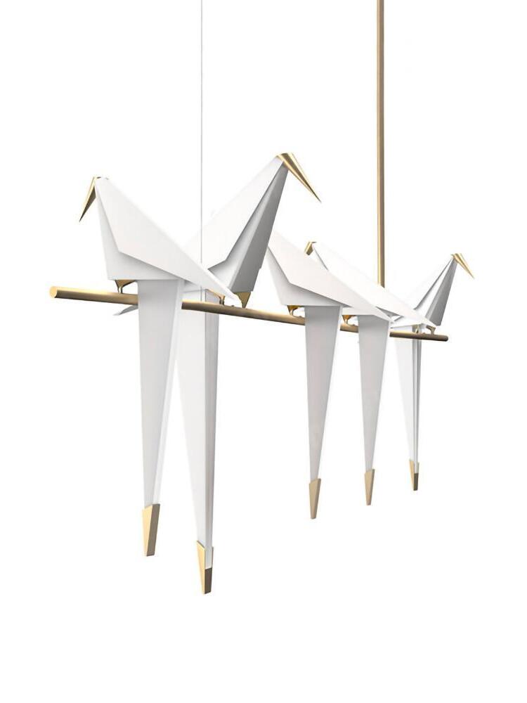 A family of sculptural lamps celebrates the beauty and poetry of a bird perched on a branch, rocking darkness away when set in motion. Crafted from the paper in the form of an abstract bird sitting on a branch, these sunlit birds are free to swing when softly touched, gently glowing and bringing along the promise of spring.