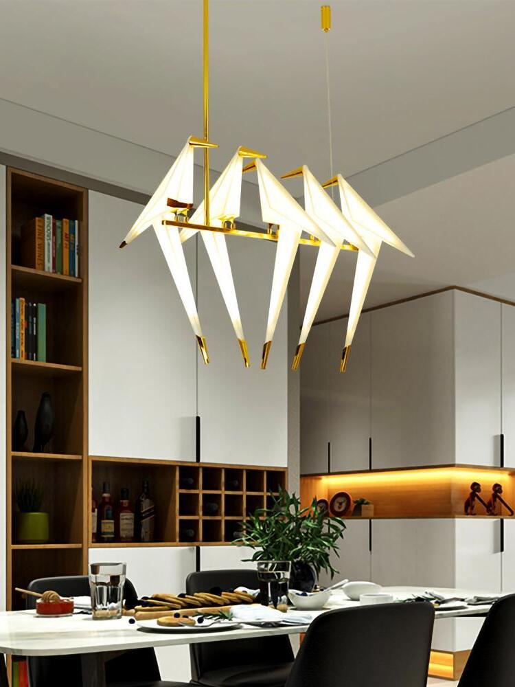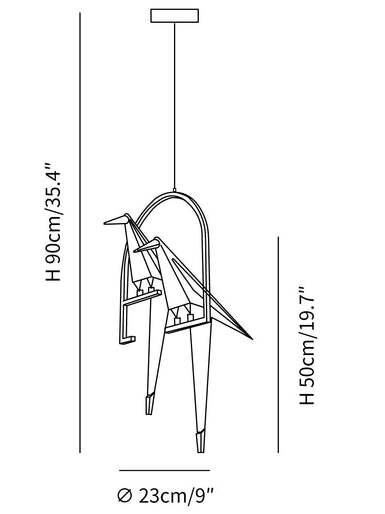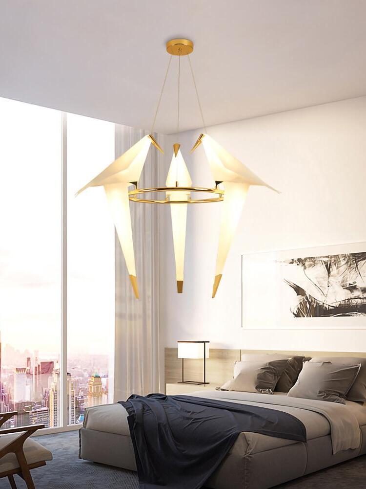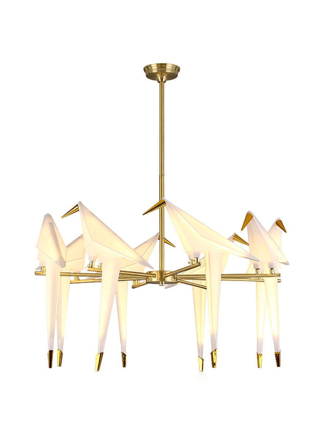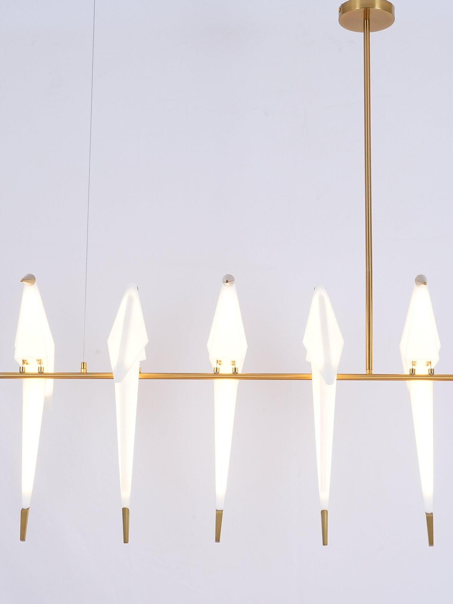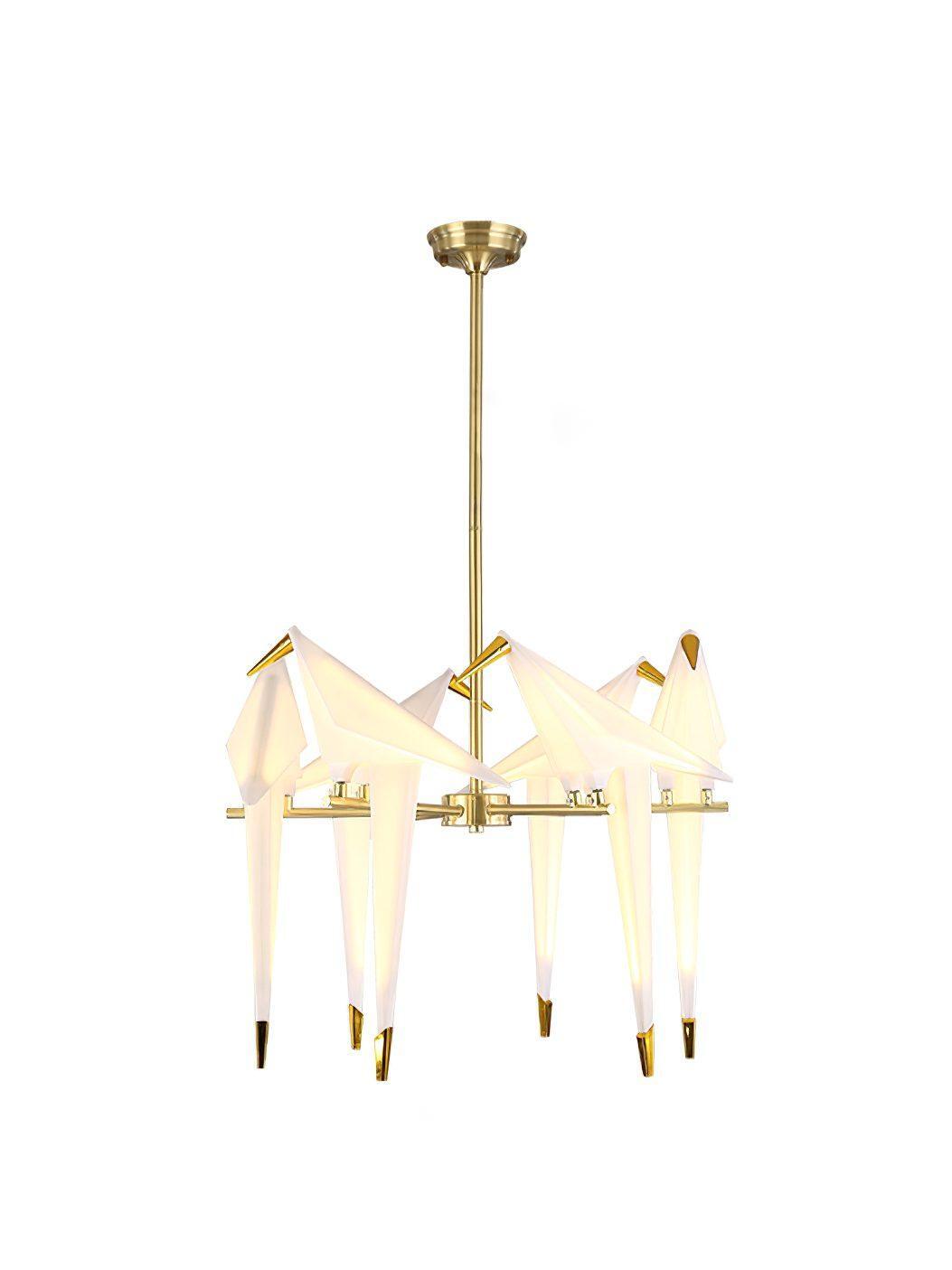 A family of sculptural lamps celebrates the beauty and poetry of a bird perched on a branch, rocking darkness away when set in motion. Crafted from the paper in the form of an abstract bird sitting on a branch, these sunlit birds are free to swing when softly touched, gently glowing and bringing along the promise of spring.