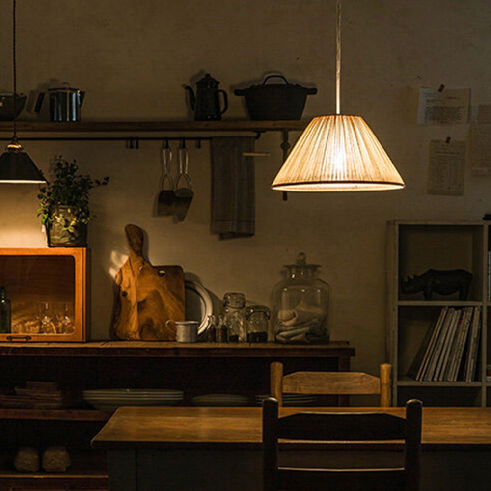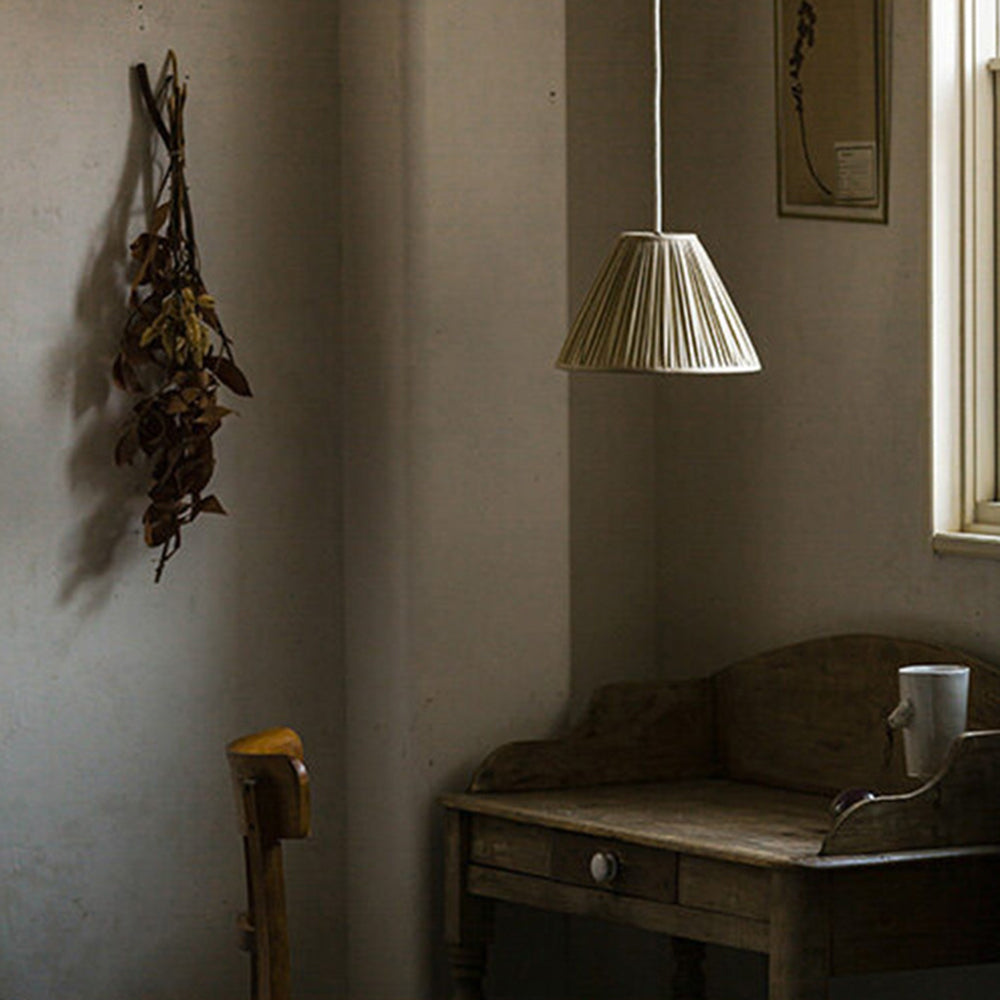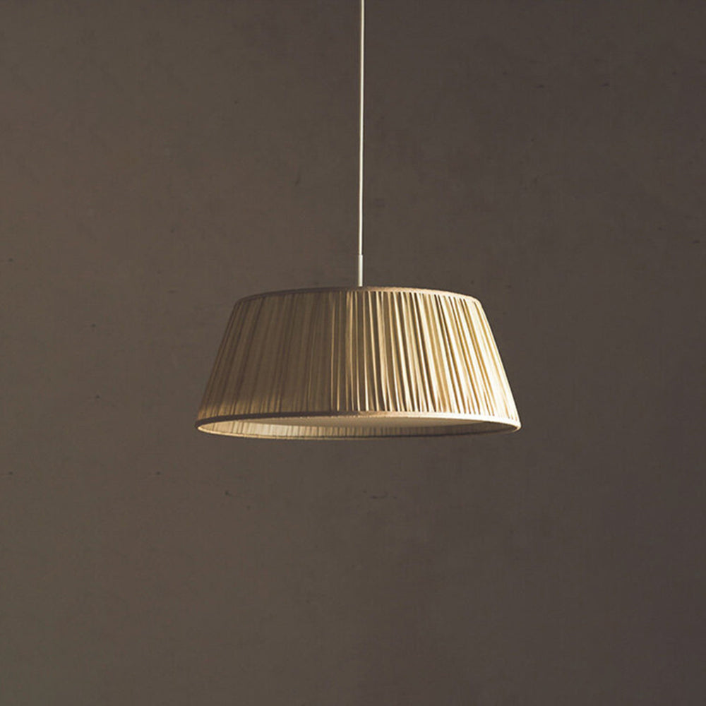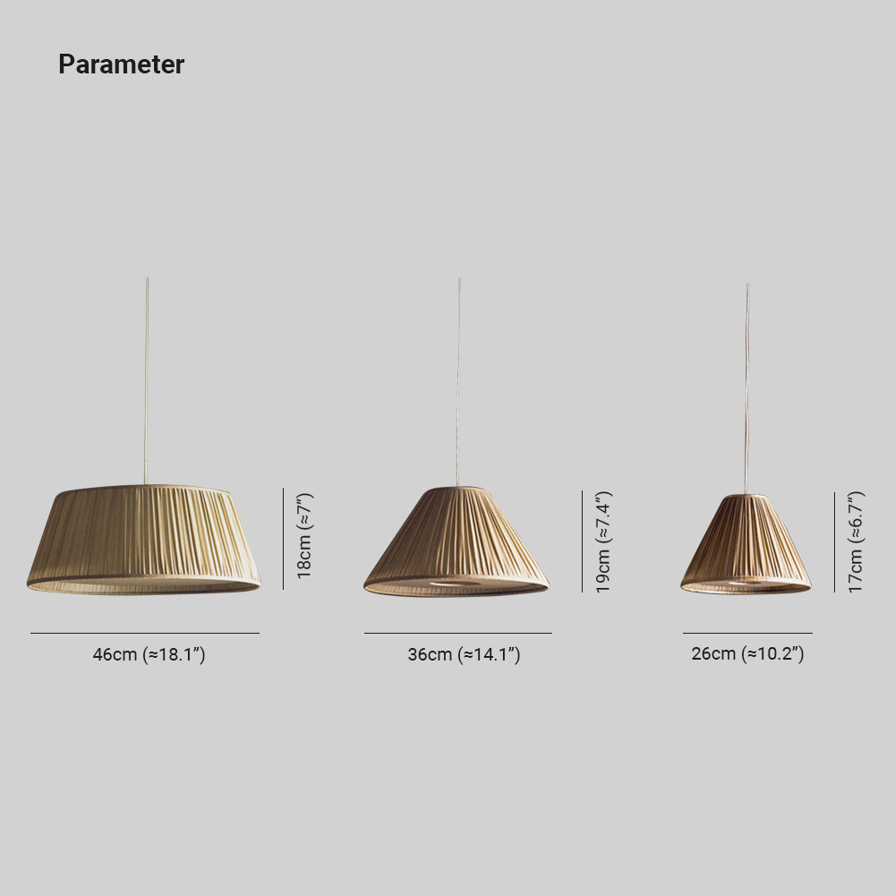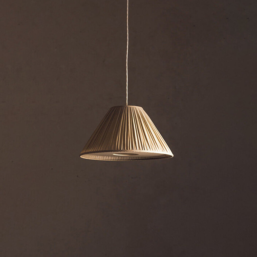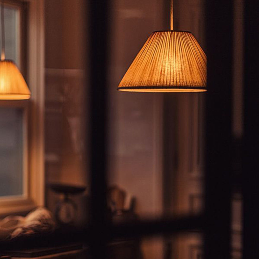 - The Renée Pleated Pendant Light's distinctive shape. This pendant light unique cone or drum shape adorned with exquisite folded lines on its surface. The artistic folds create a mesmerizing play of light and shadow, adding depth and character to your living space. It's not just a lighting fixture; it's a sculptural masterpiece that doubles as a conversation starter.