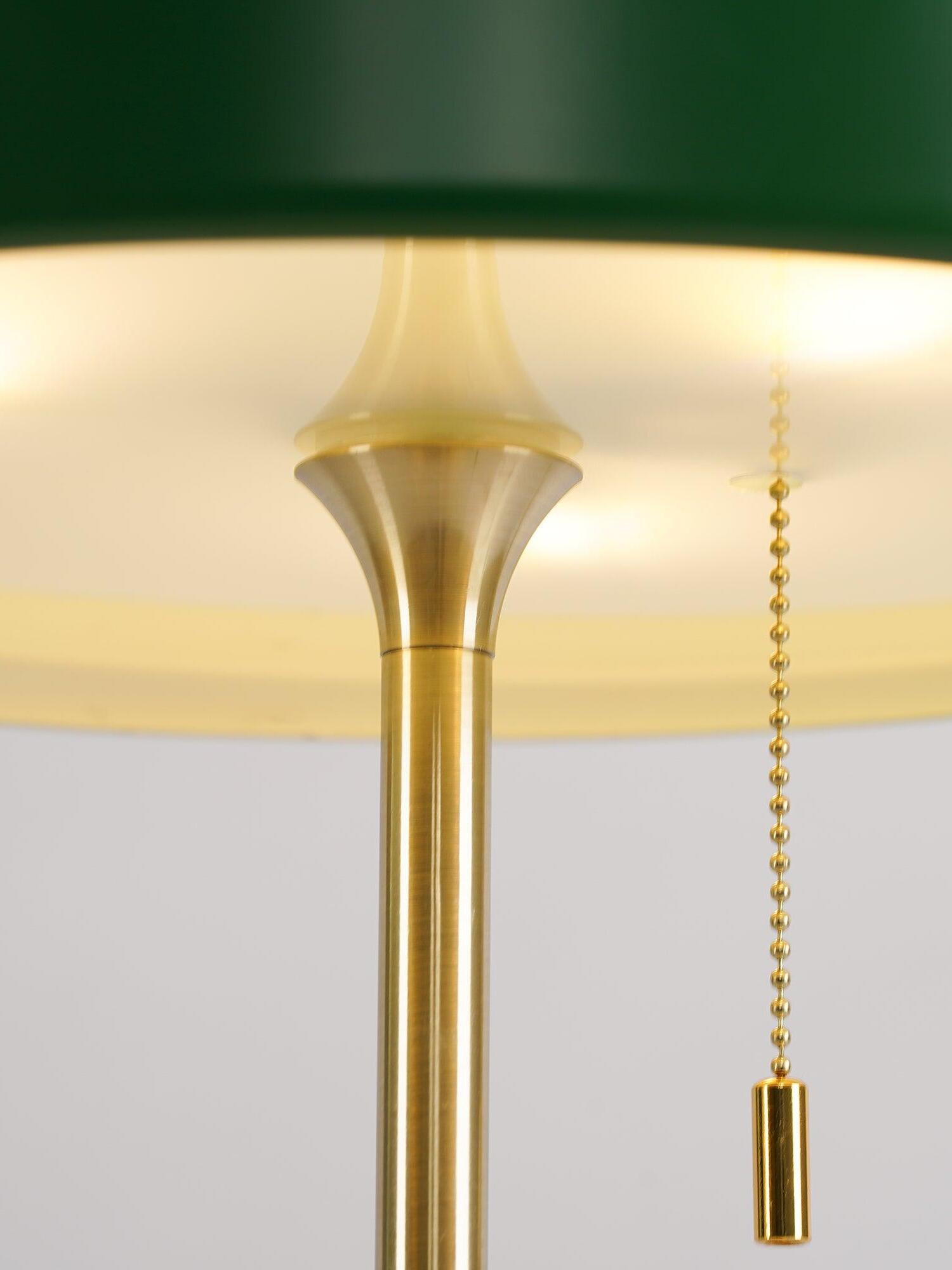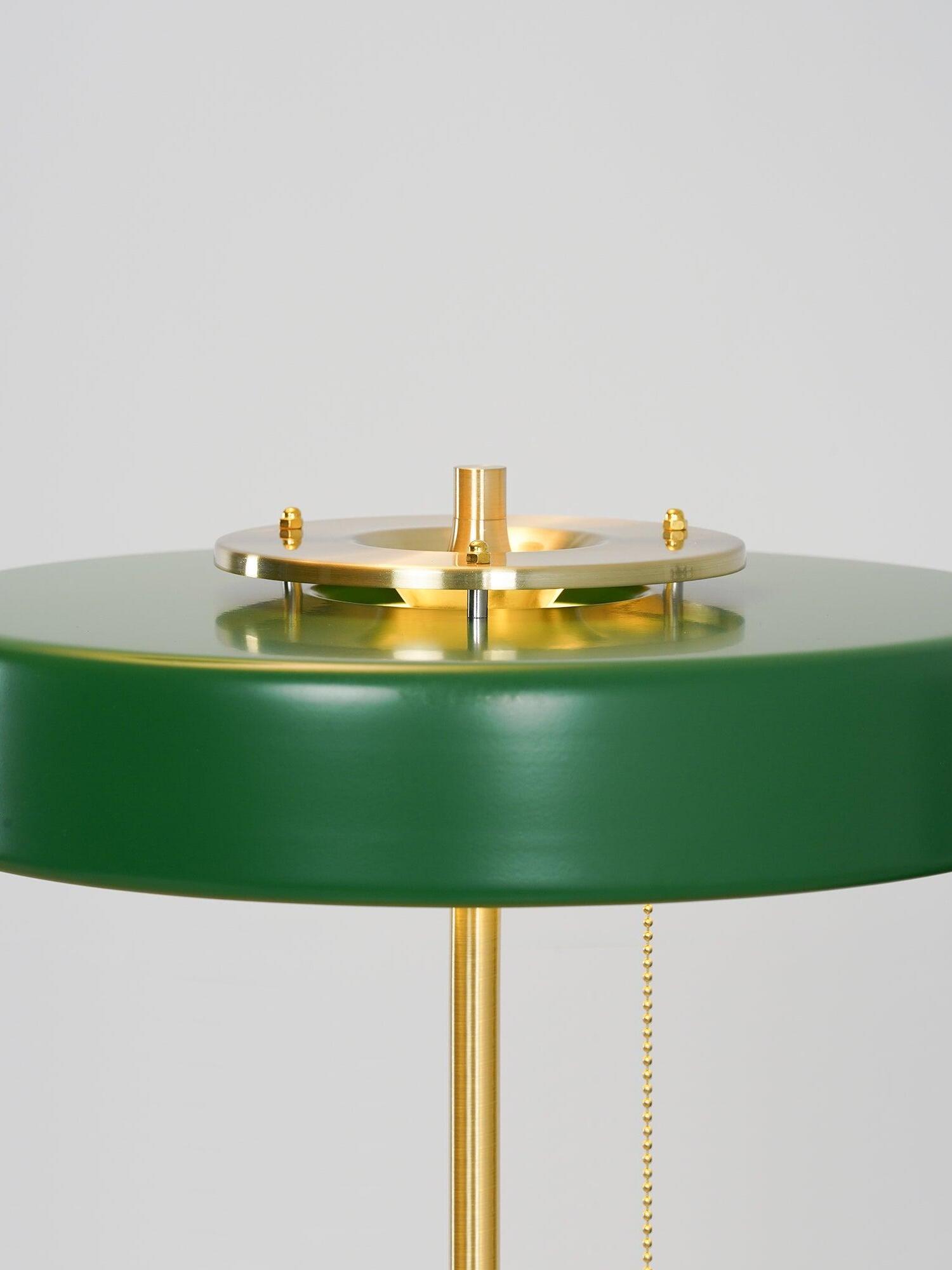 A pull chain switch hangs over a solid iron base with an inset color ring that matches the shade color. Light also escapes through the top iron feature to add highlights to the spun metal shade. A pull chain switch hangs over a solid iron base which features an inset color ring to match the shade. This light draws you in to imagine all the great possibilities alone it can give and the pleasure you take from seeing it for yourself.