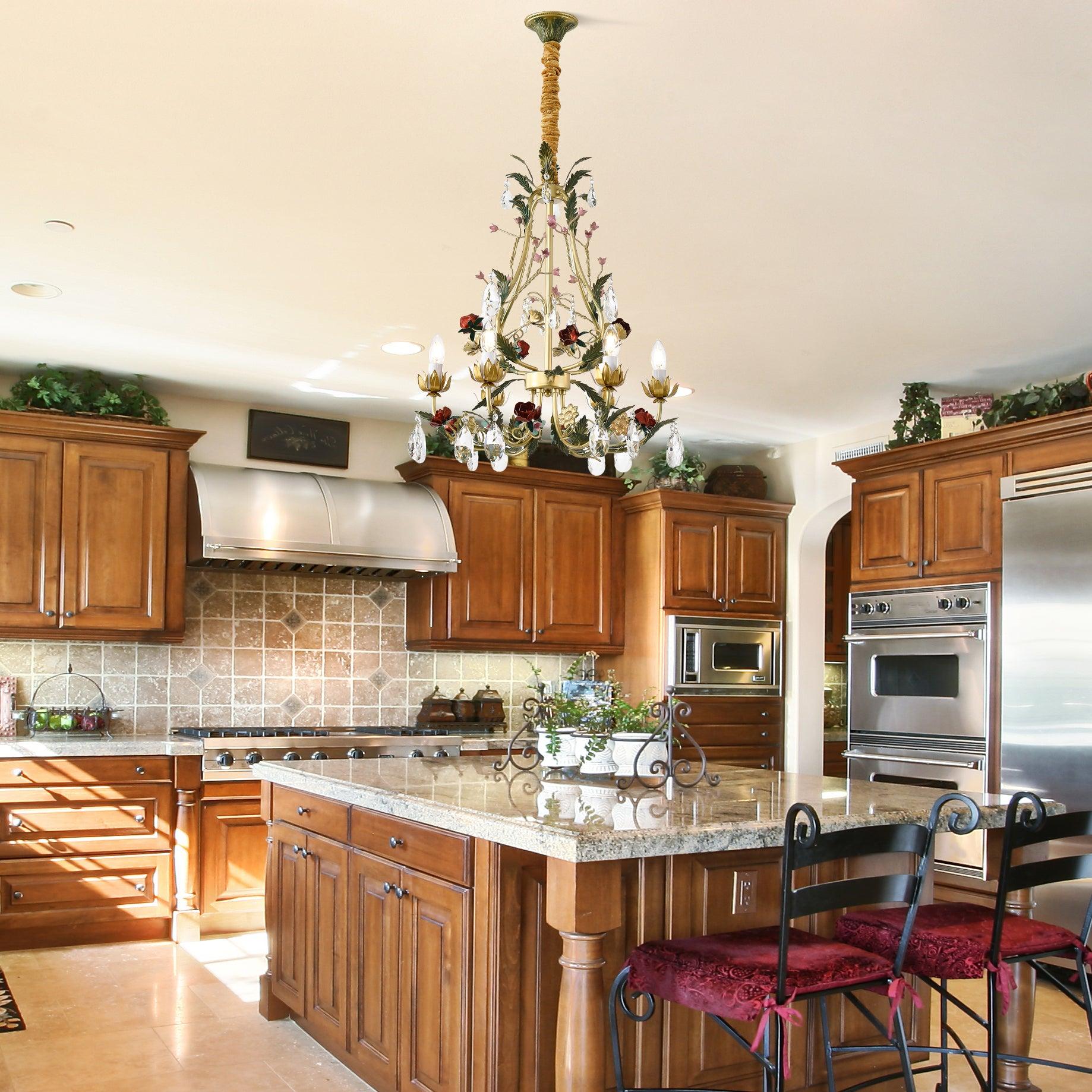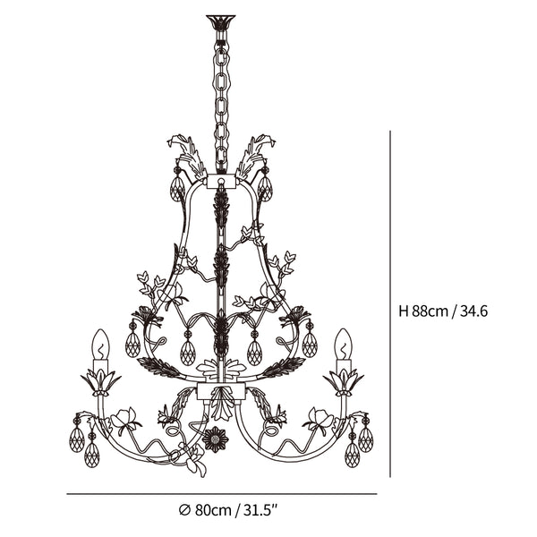 This chandelier showcases a captivating blend of nature-inspired elements and luxurious craftsmanship. The framework, adorned with delicate gold-colored leaves and blooming roses, intertwines with clear crystal droplets that refract light beautifully. The ornate design, complemented by candle-like bulbs, exudes both elegance and whimsy, making it a statement piece suitable for various interior styles. Whether it's for a classic living room or a romantic bedroom, this chandelier promises to add a touch of opulence and charm to any space.