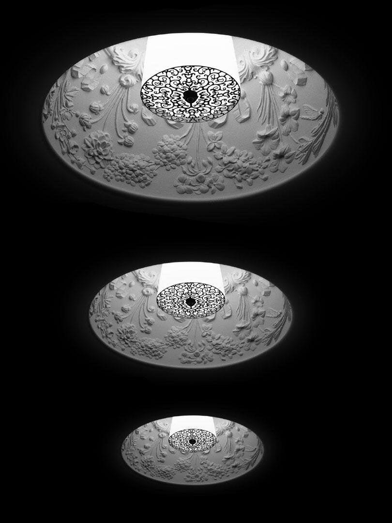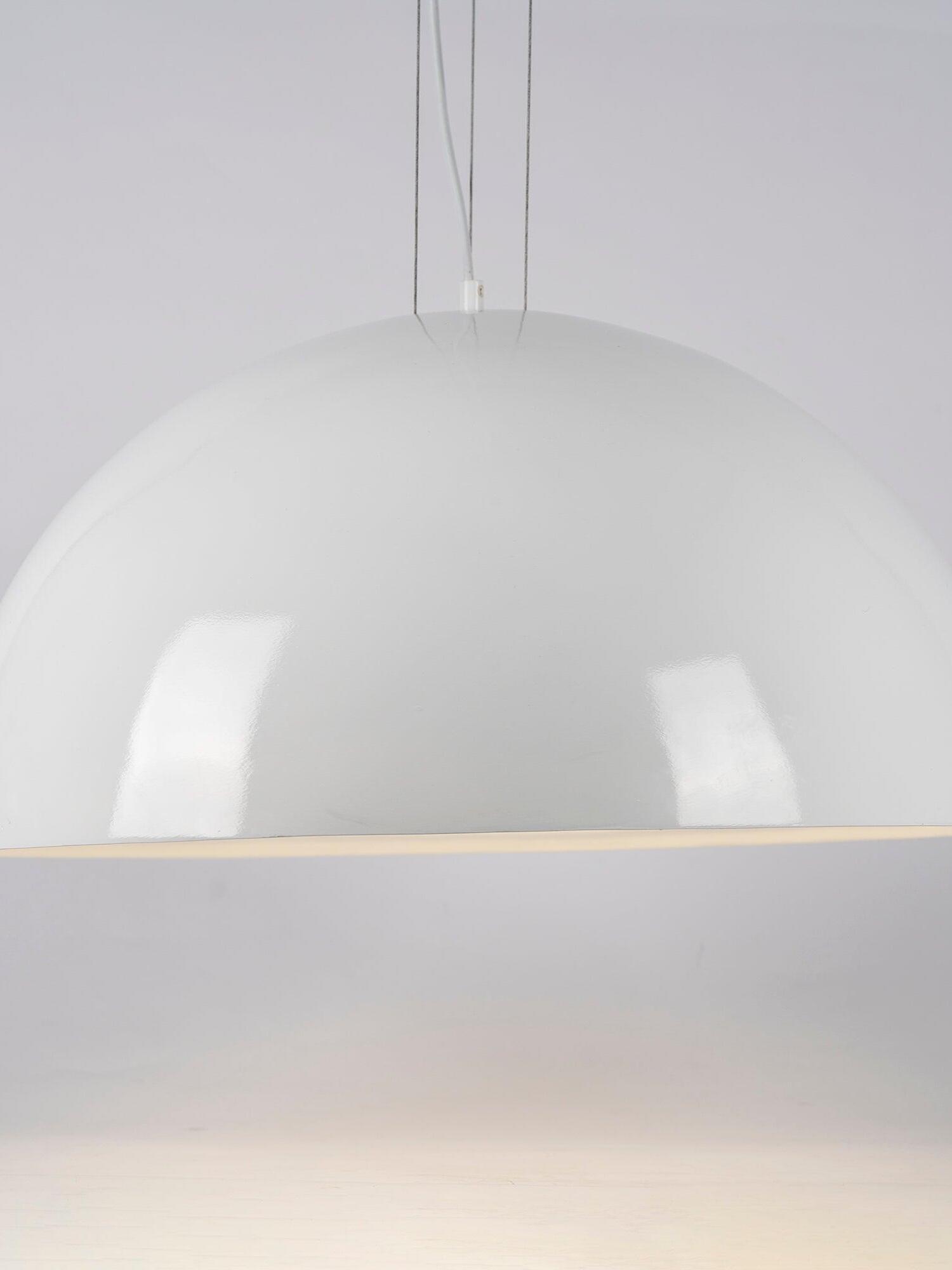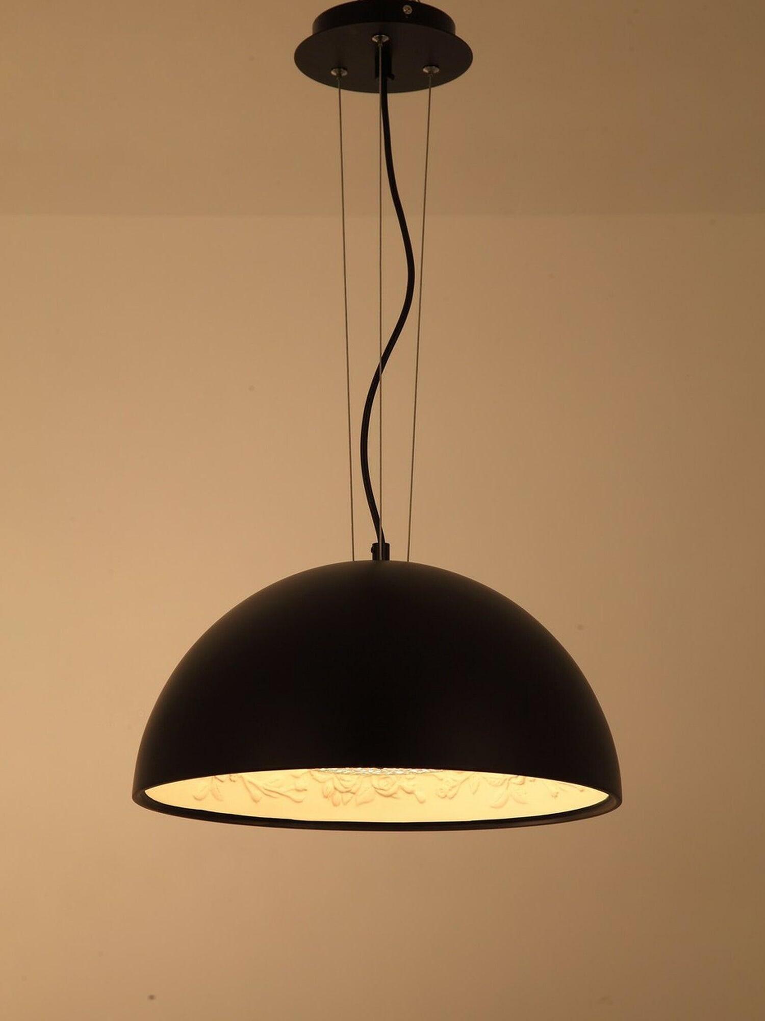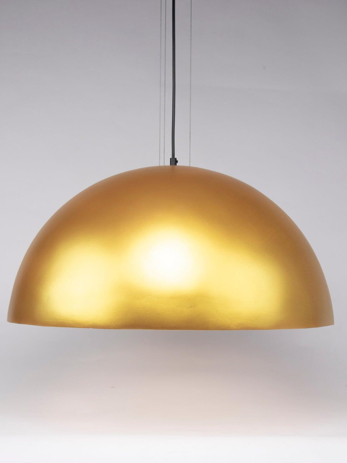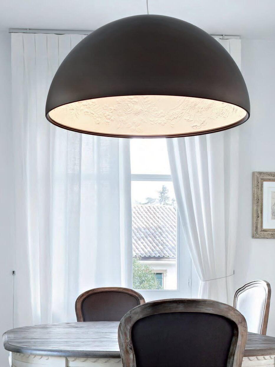 Suspension luminaire providing diffused lighting. Hemispherical, mechanically-processed cast plaster diffuser, painted white inside. Outer finish: rust, glossy black, glossy white or matte gold. Plaster diffuser support in die-cast aluminum alloy. Upper cable gland and blocking ring nut in black injection-molded PC. Shaped, adjustment screws.