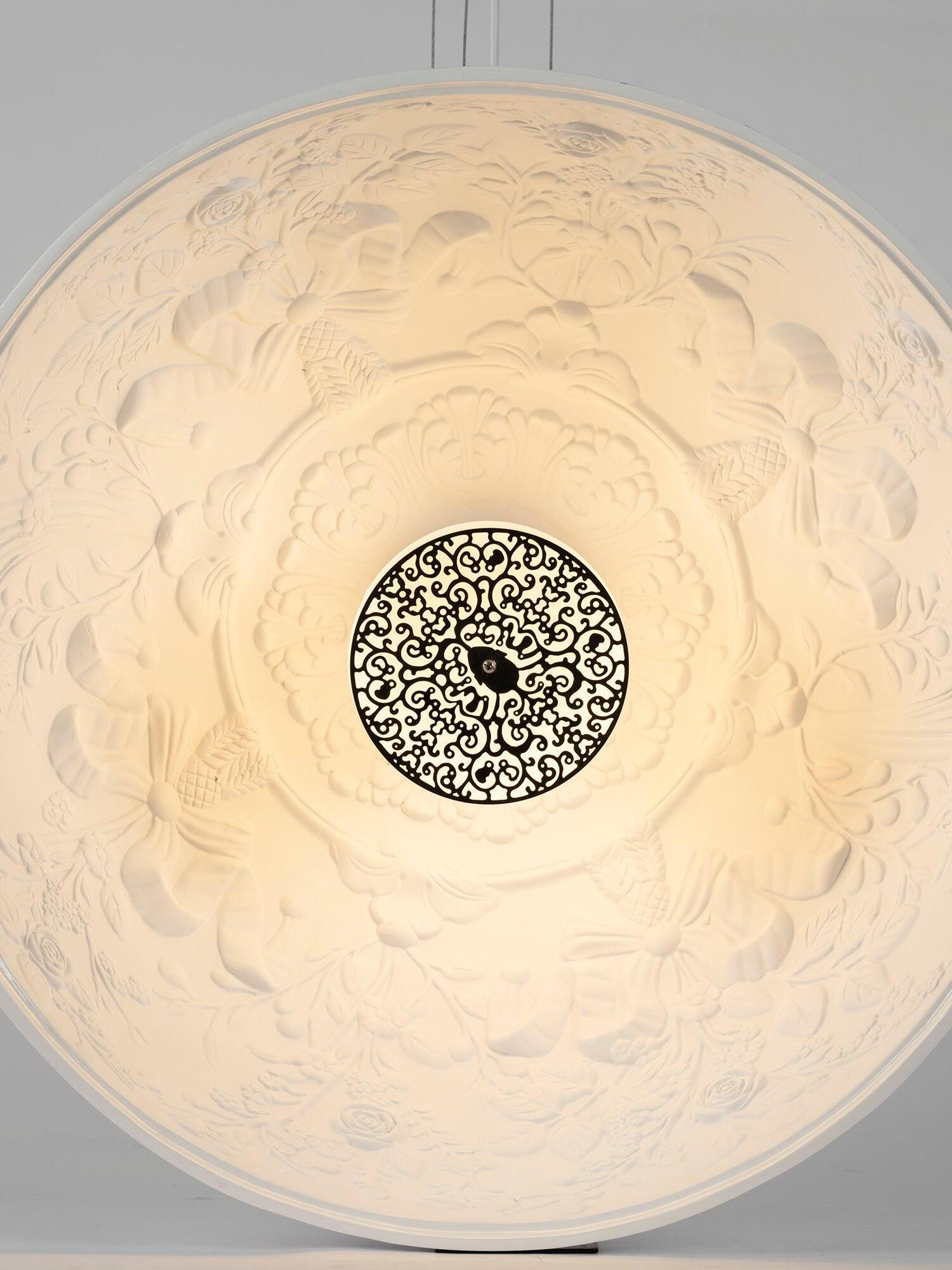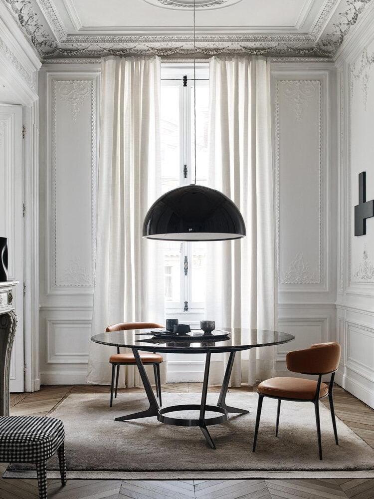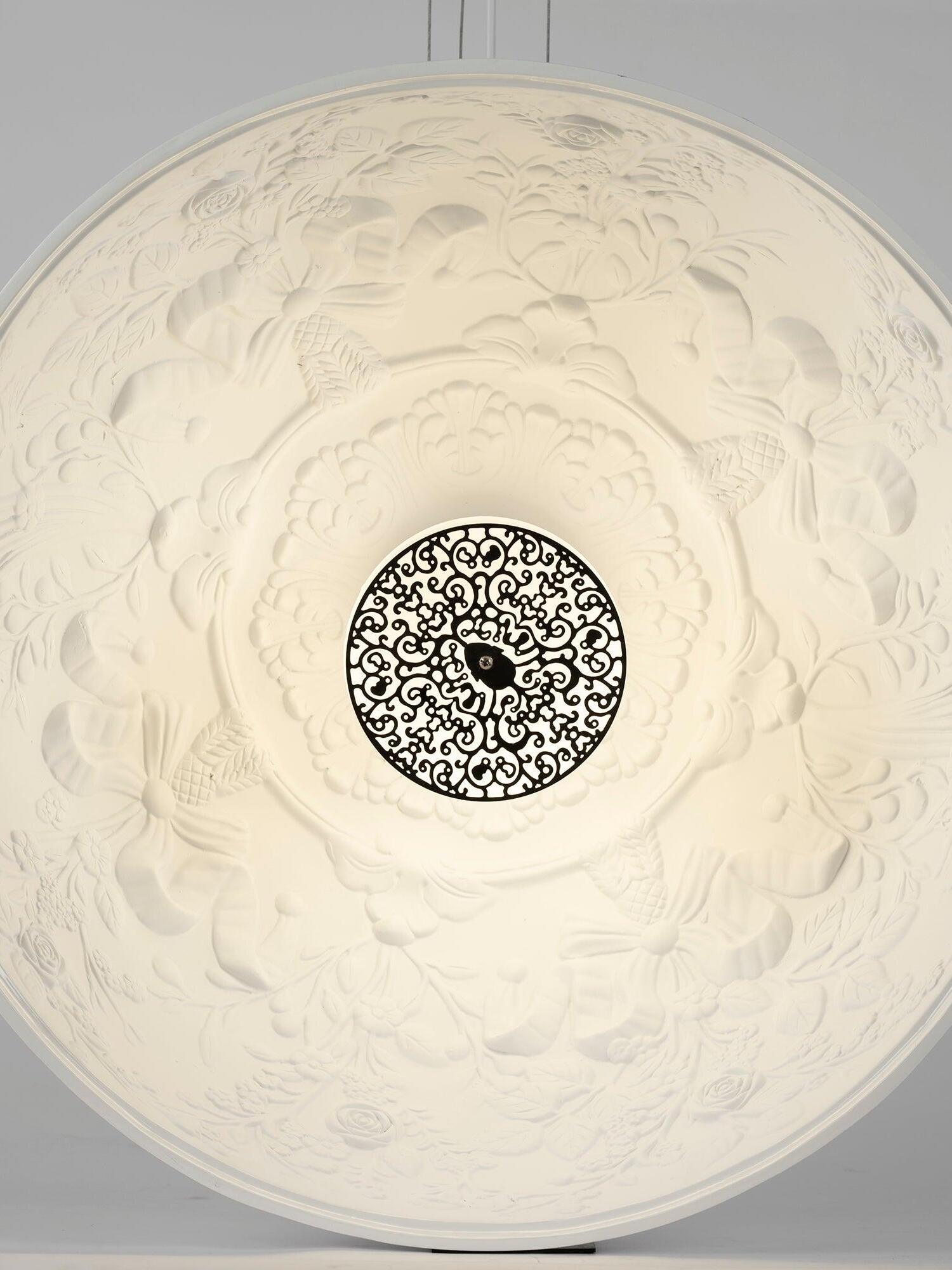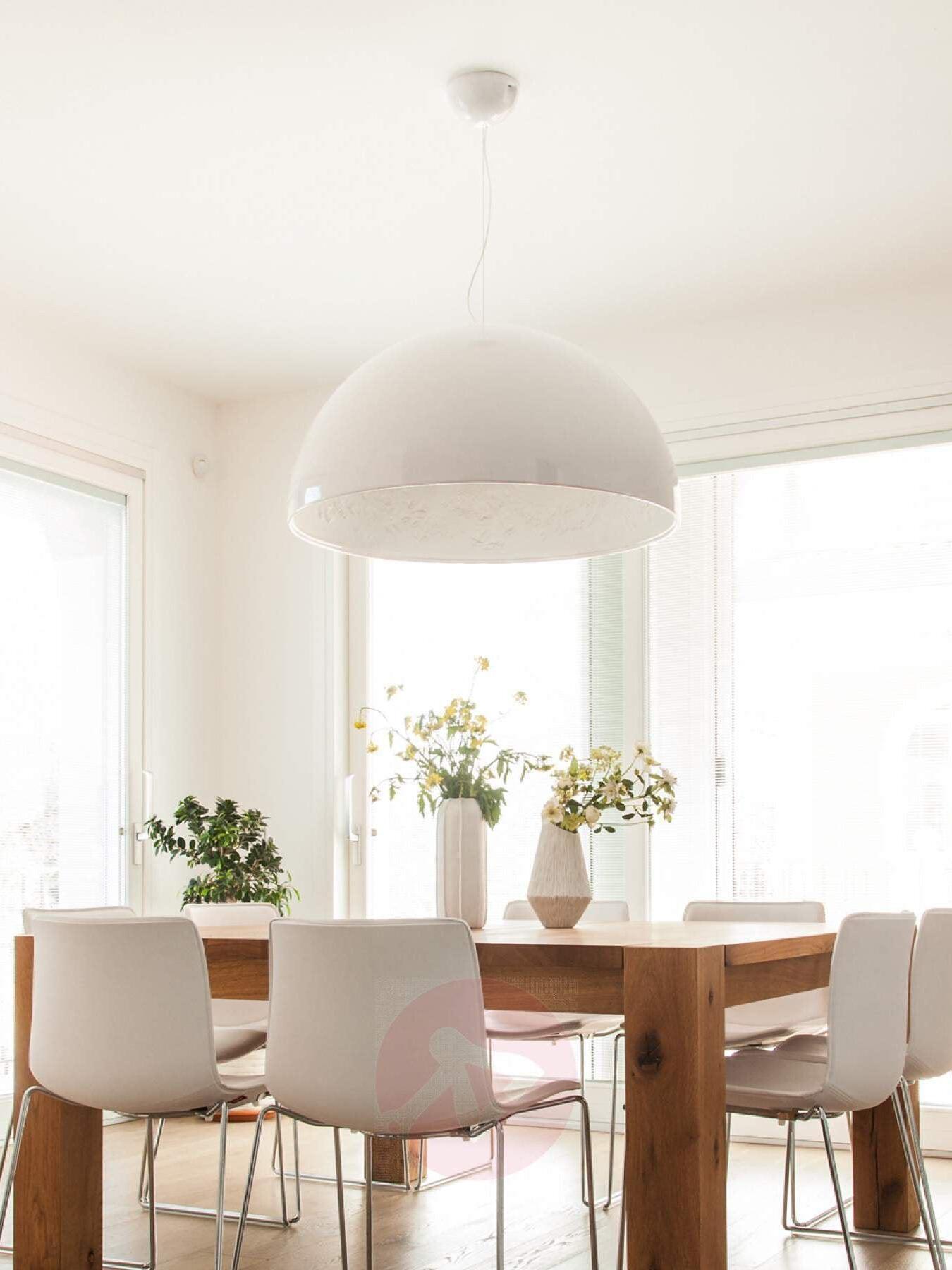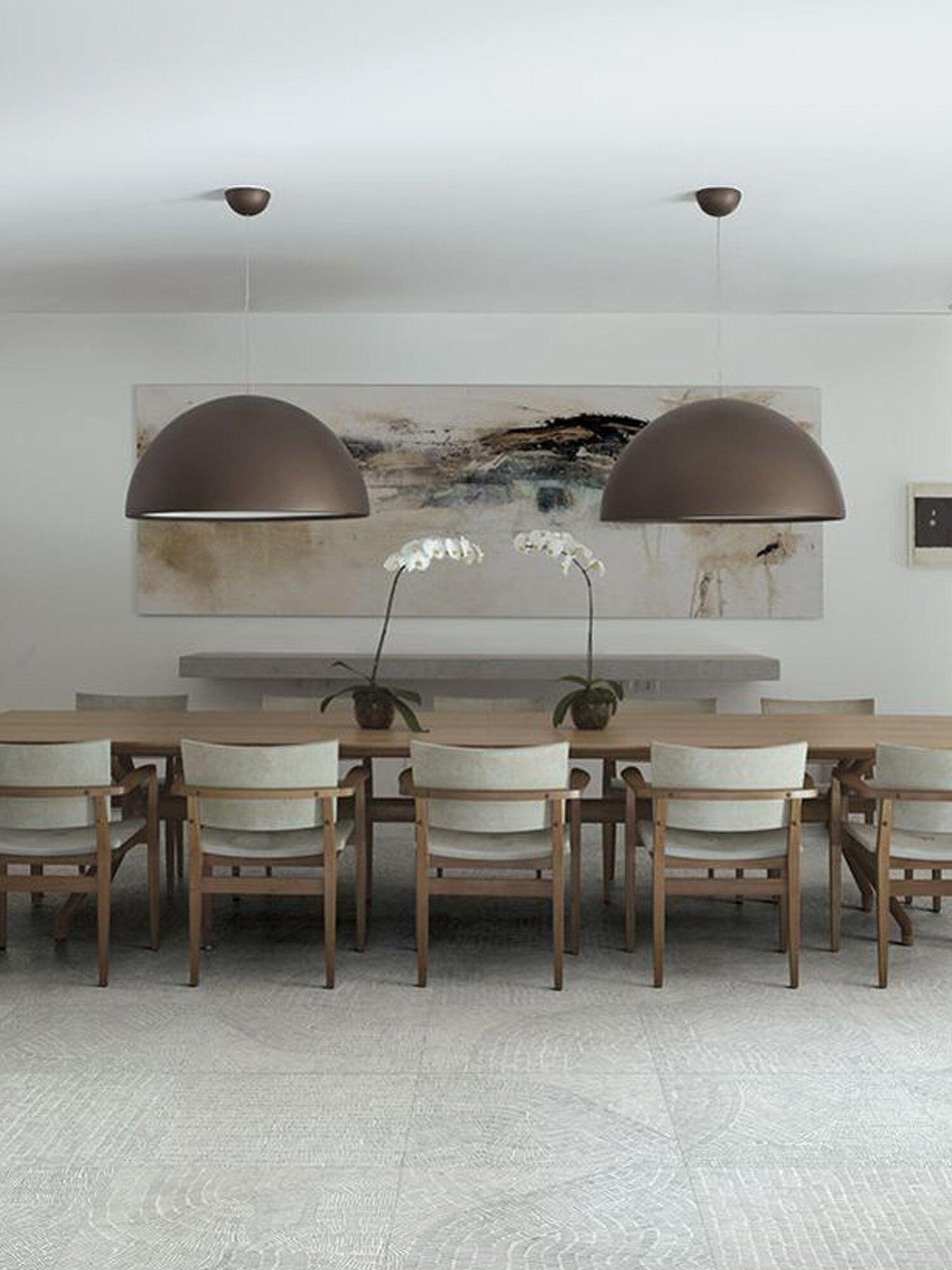 Suspension luminaire providing diffused lighting. Hemispherical, mechanically-processed cast plaster diffuser, painted white inside. Outer finish: rust, glossy black, glossy white or matte gold. Plaster diffuser support in die-cast aluminum alloy. Upper cable gland and blocking ring nut in black injection-molded PC. Shaped, adjustment screws.