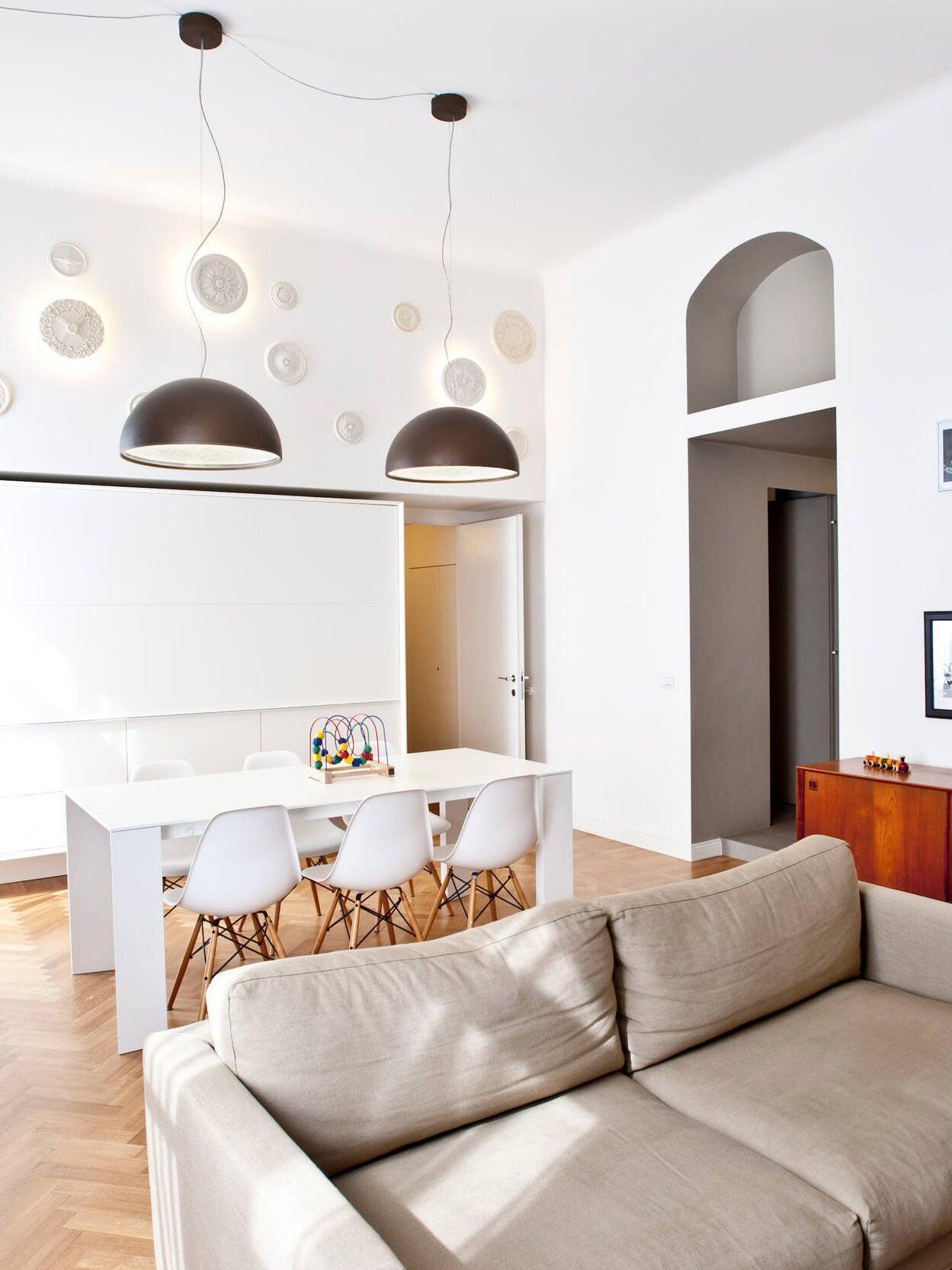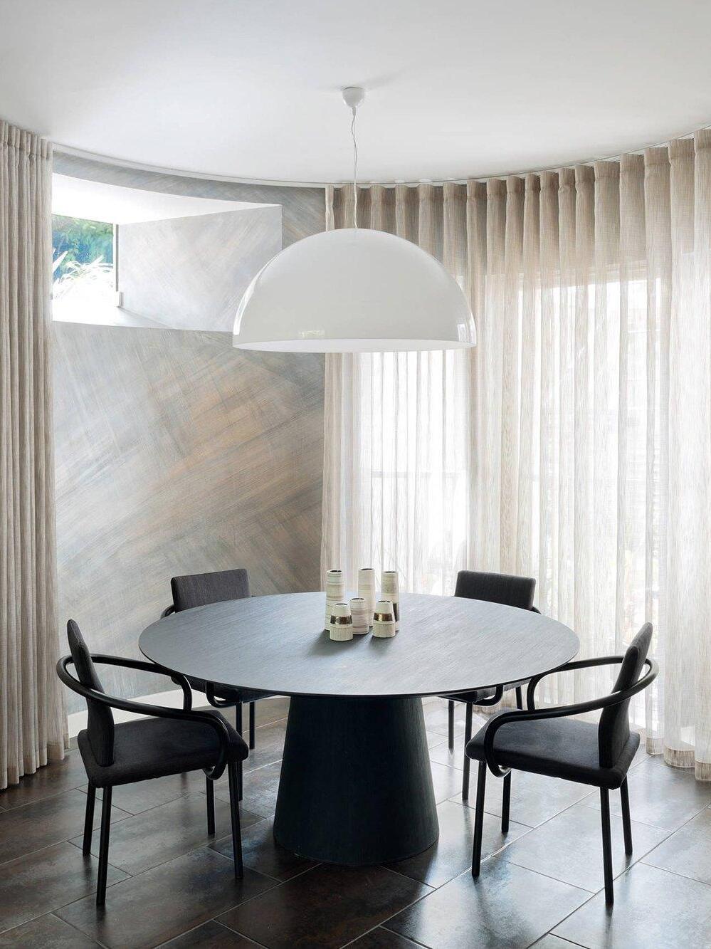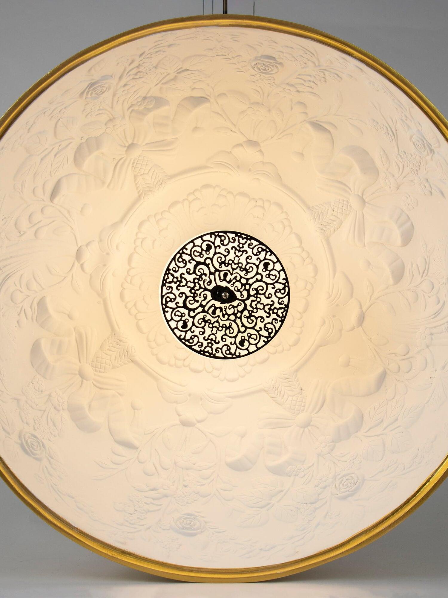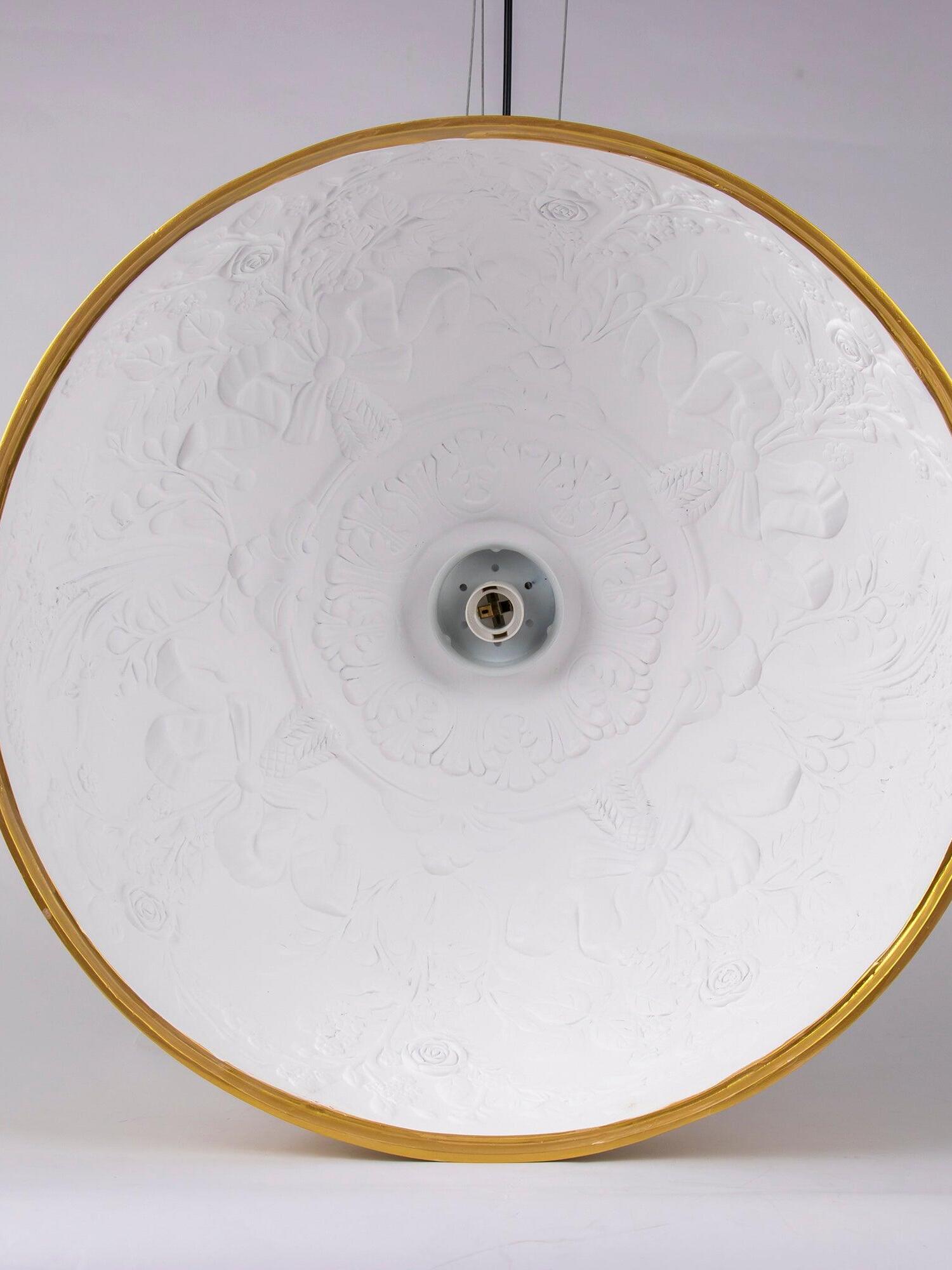 Suspension luminaire providing diffused lighting. Hemispherical, mechanically-processed cast plaster diffuser, painted white inside. Outer finish: rust, glossy black, glossy white or matte gold. Plaster diffuser support in die-cast aluminum alloy. Upper cable gland and blocking ring nut in black injection-molded PC. Shaped, adjustment screws.