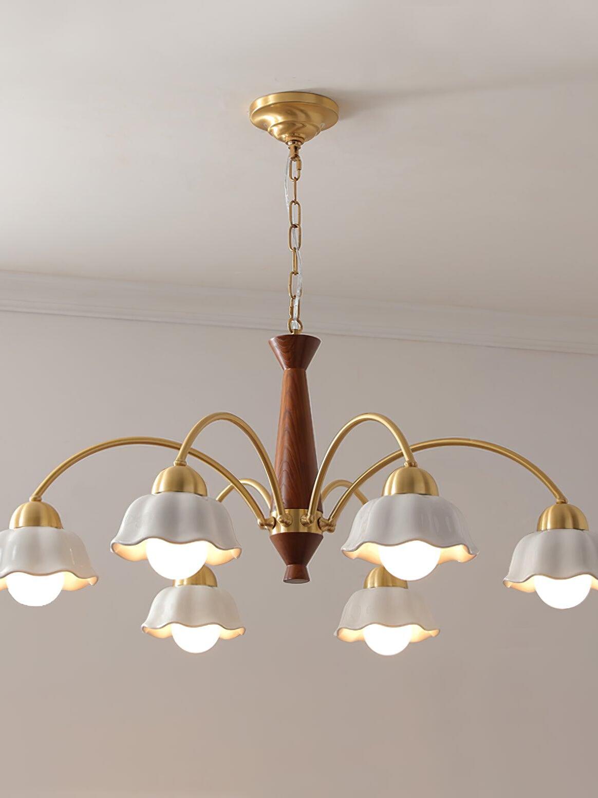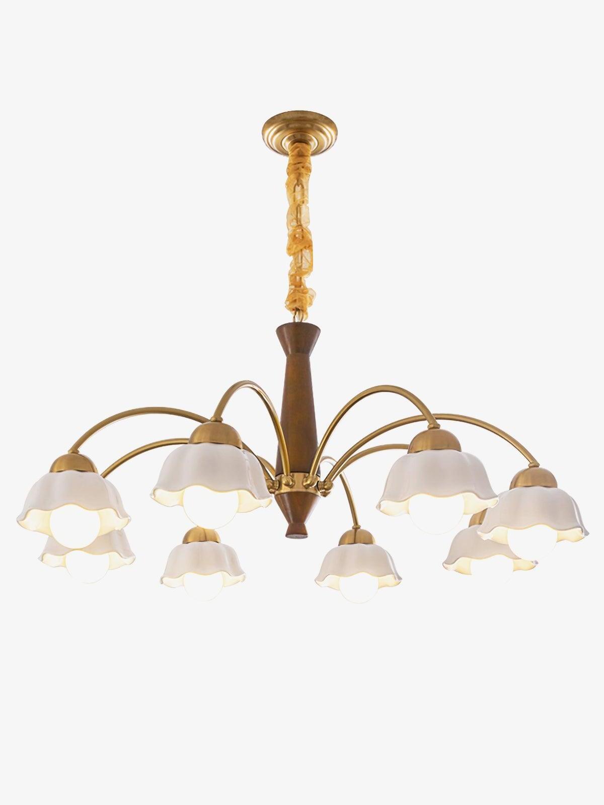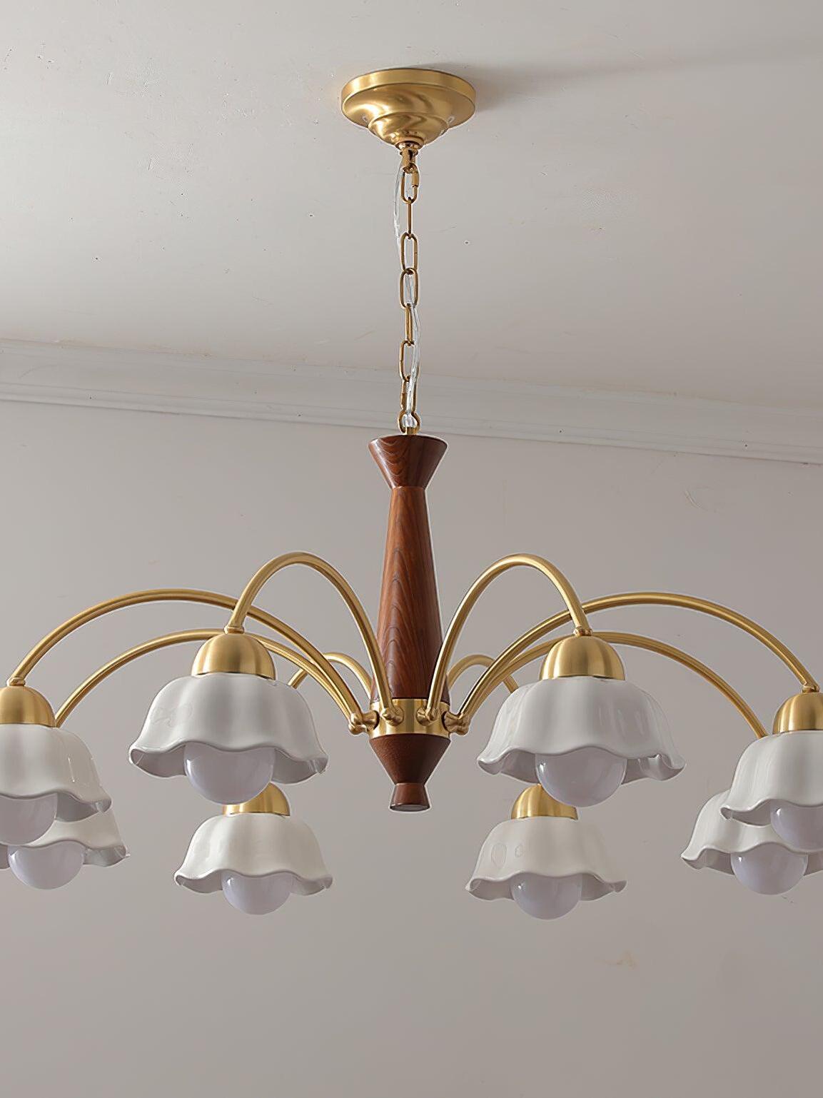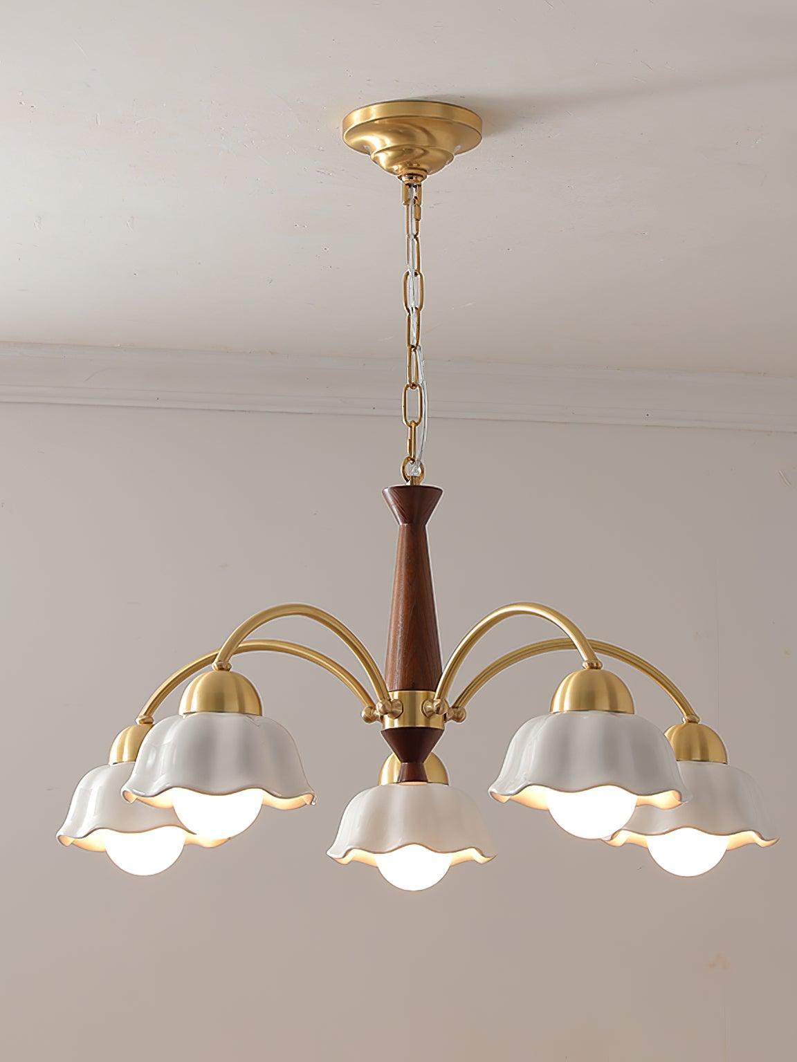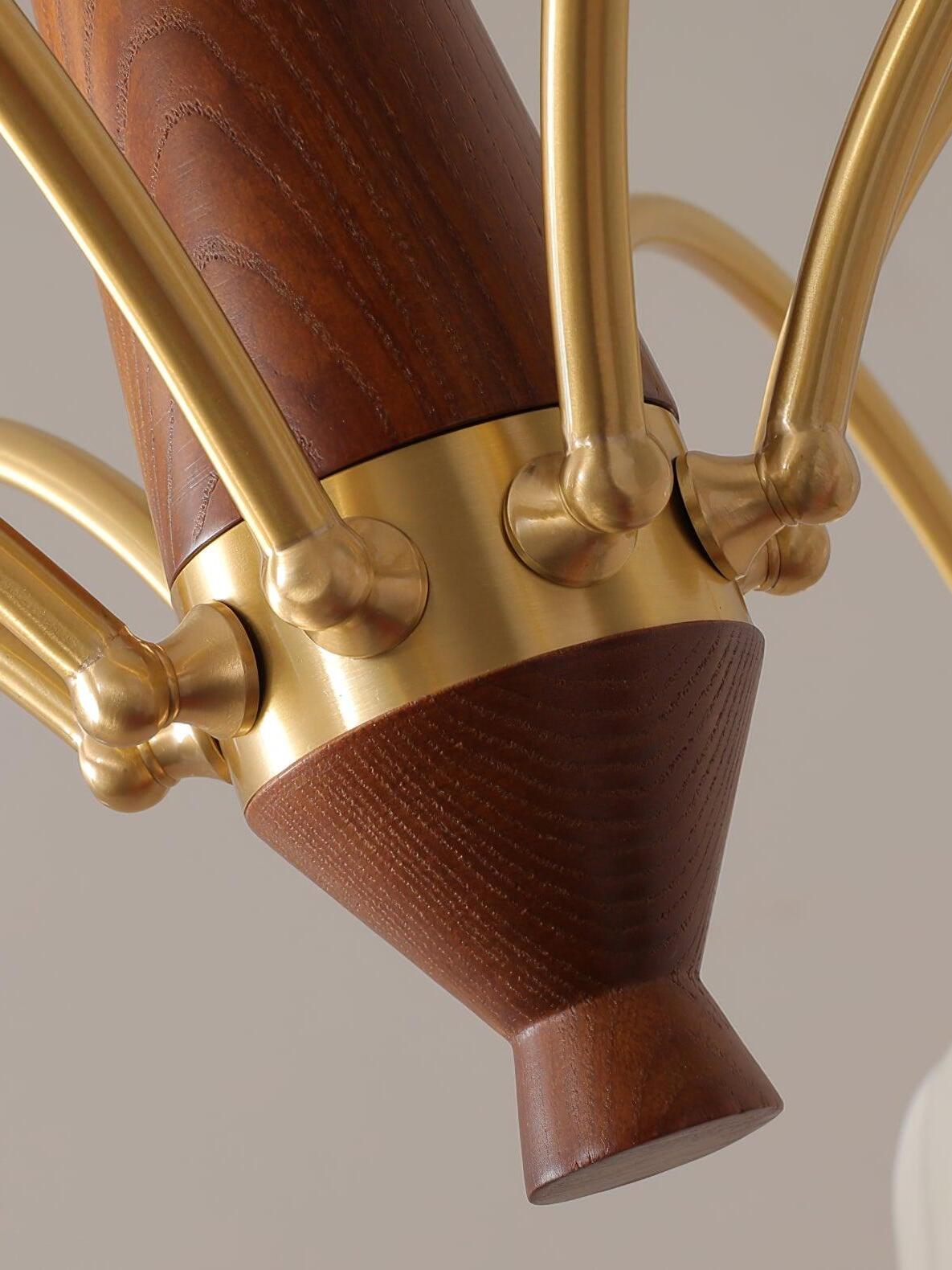 Rare midcentury chandelier in brass, wood, and frosted opaline ceramics. This chandelier is made with a high sense of quality and has great details. It features five light sources, hidden by opaline ceramics shades. The brass arms are connected to a wooden centerpiece.