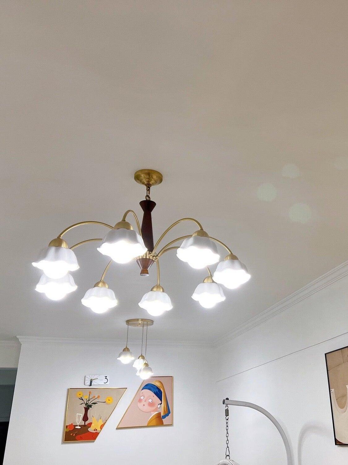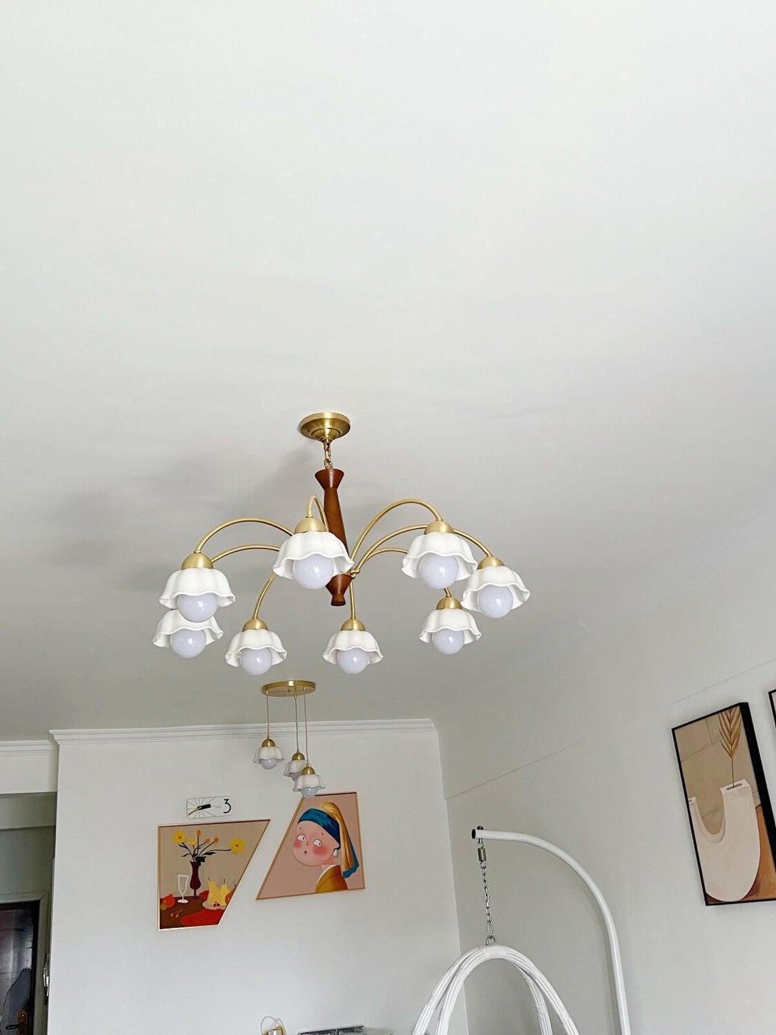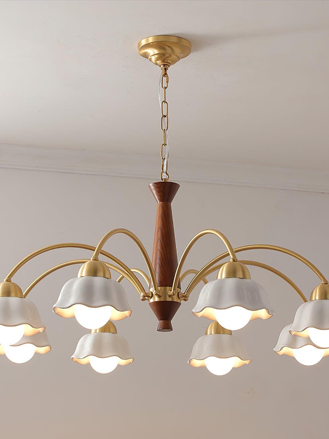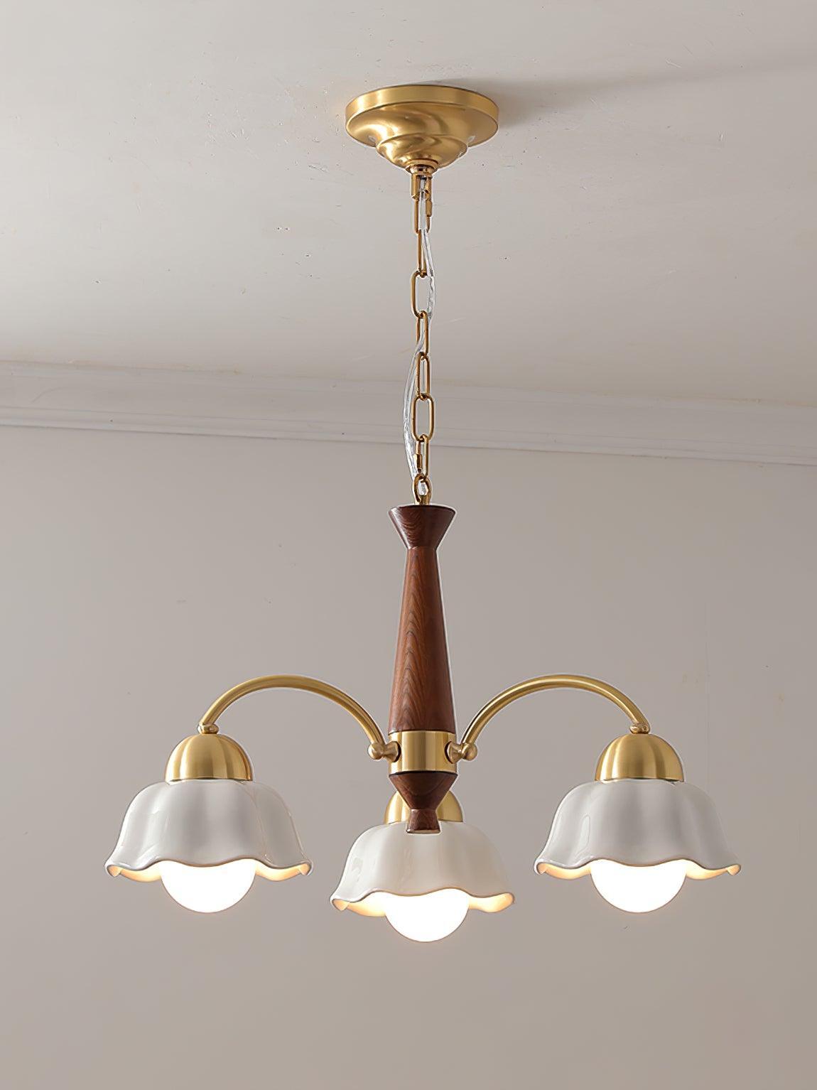 Rare midcentury chandelier in brass, wood, and frosted opaline ceramics. This chandelier is made with a high sense of quality and has great details. It features five light sources, hidden by opaline ceramics shades. The brass arms are connected to a wooden centerpiece.