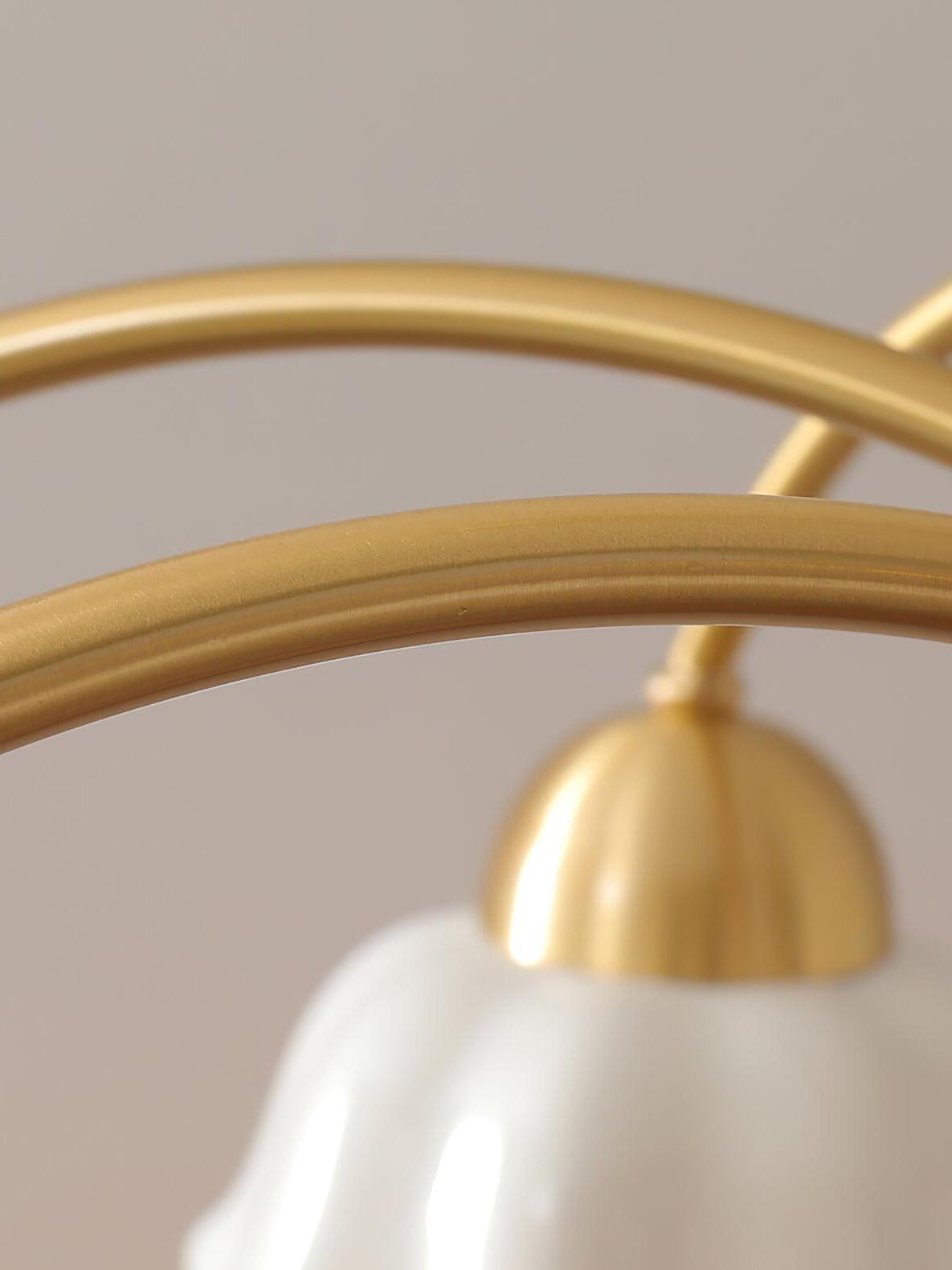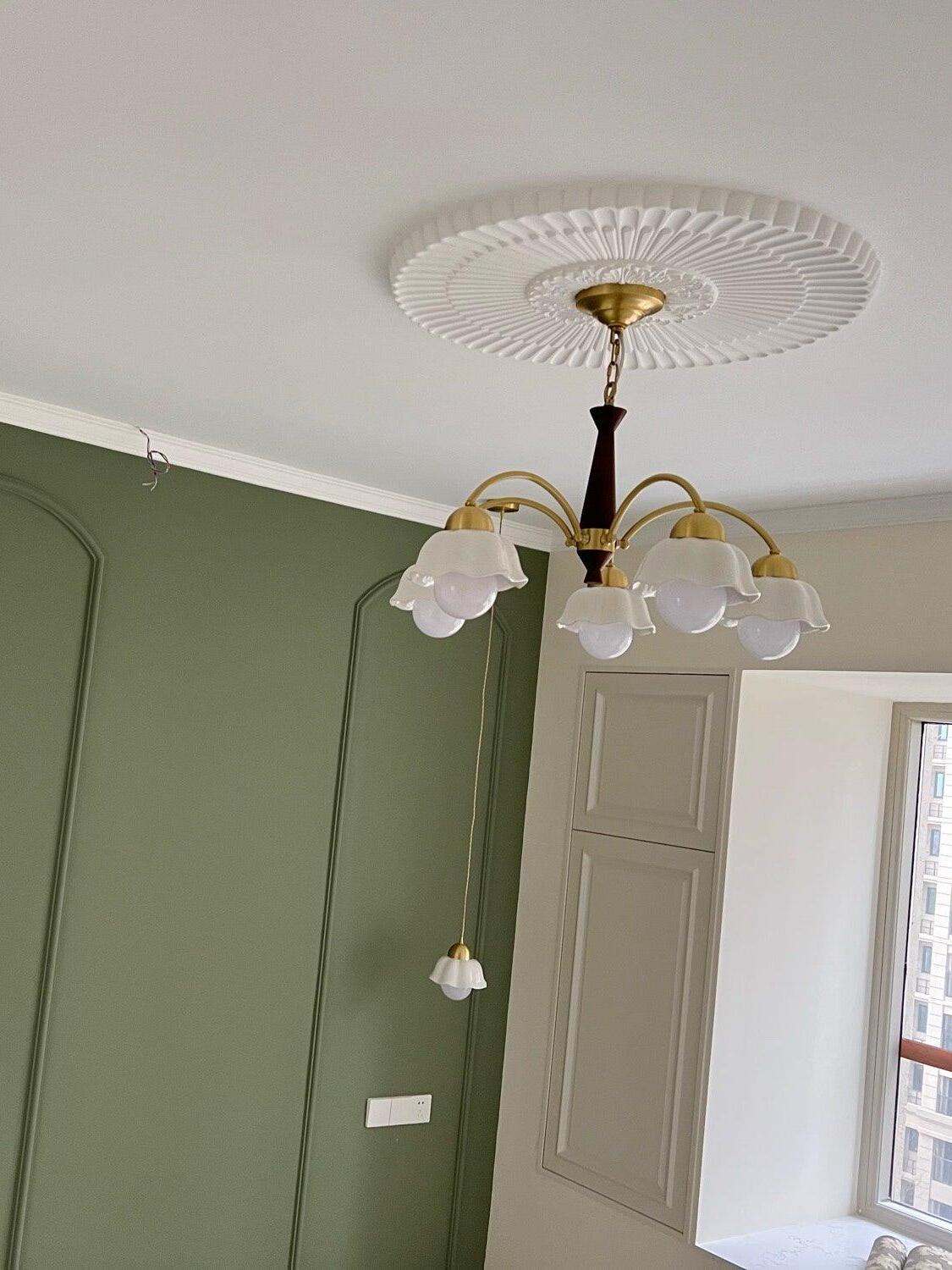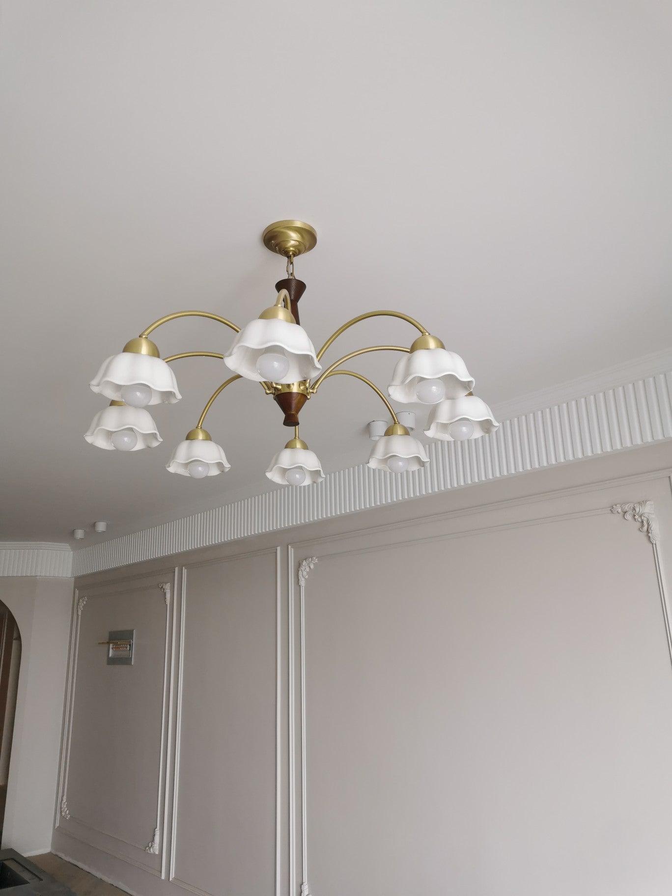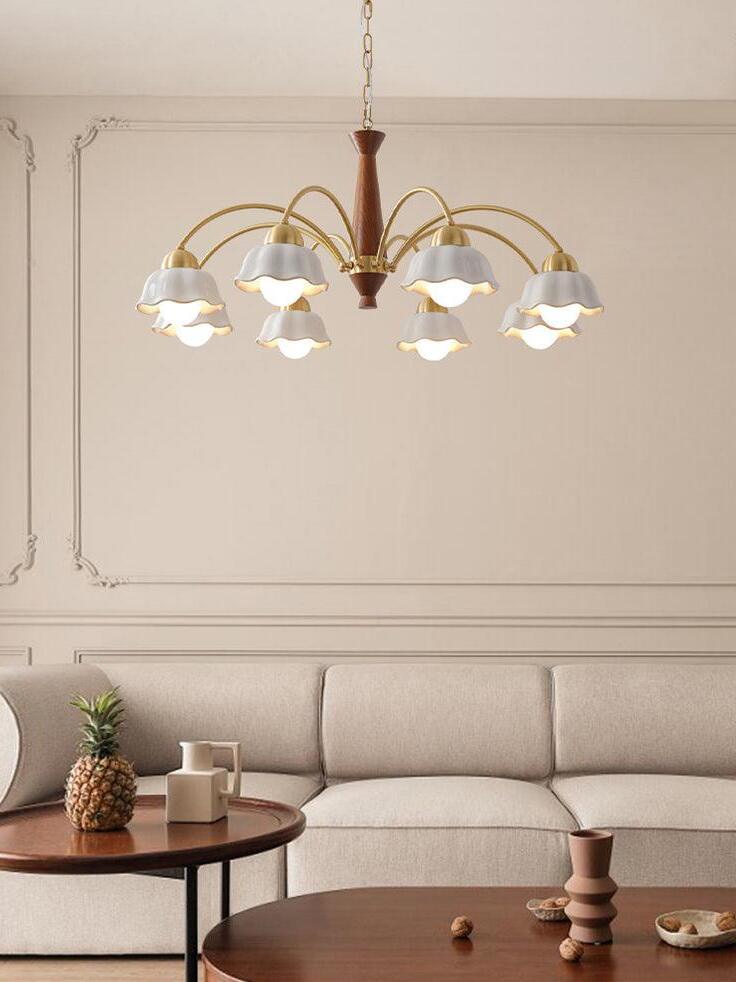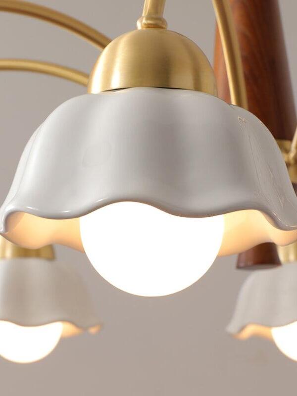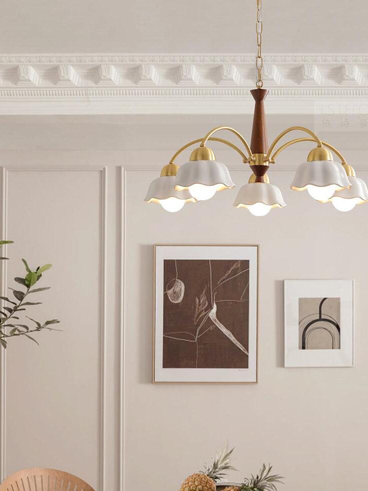 Rare midcentury chandelier in brass, wood, and frosted opaline ceramics. This chandelier is made with a high sense of quality and has great details. It features five light sources, hidden by opaline ceramics shades. The brass arms are connected to a wooden centerpiece.