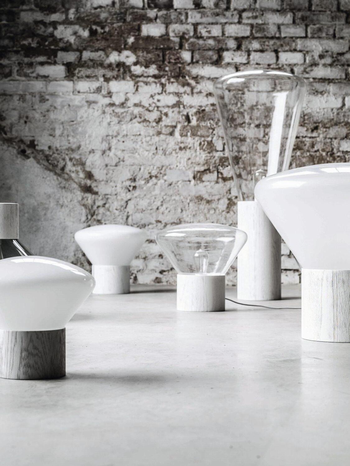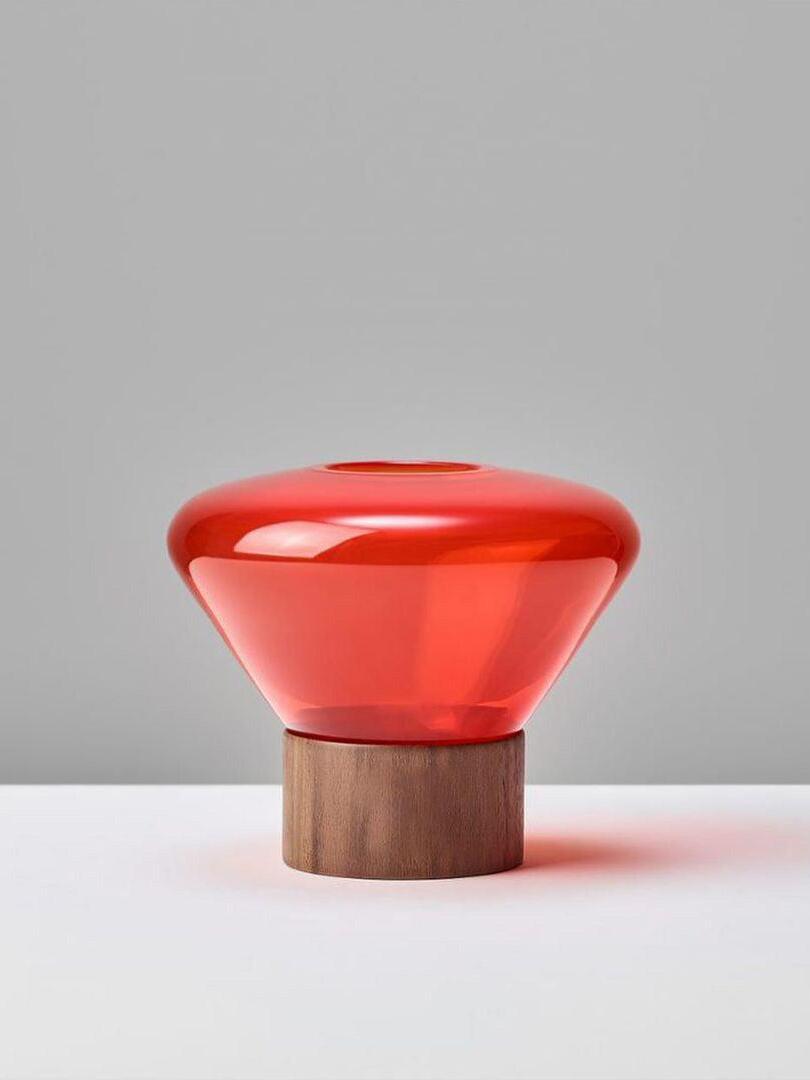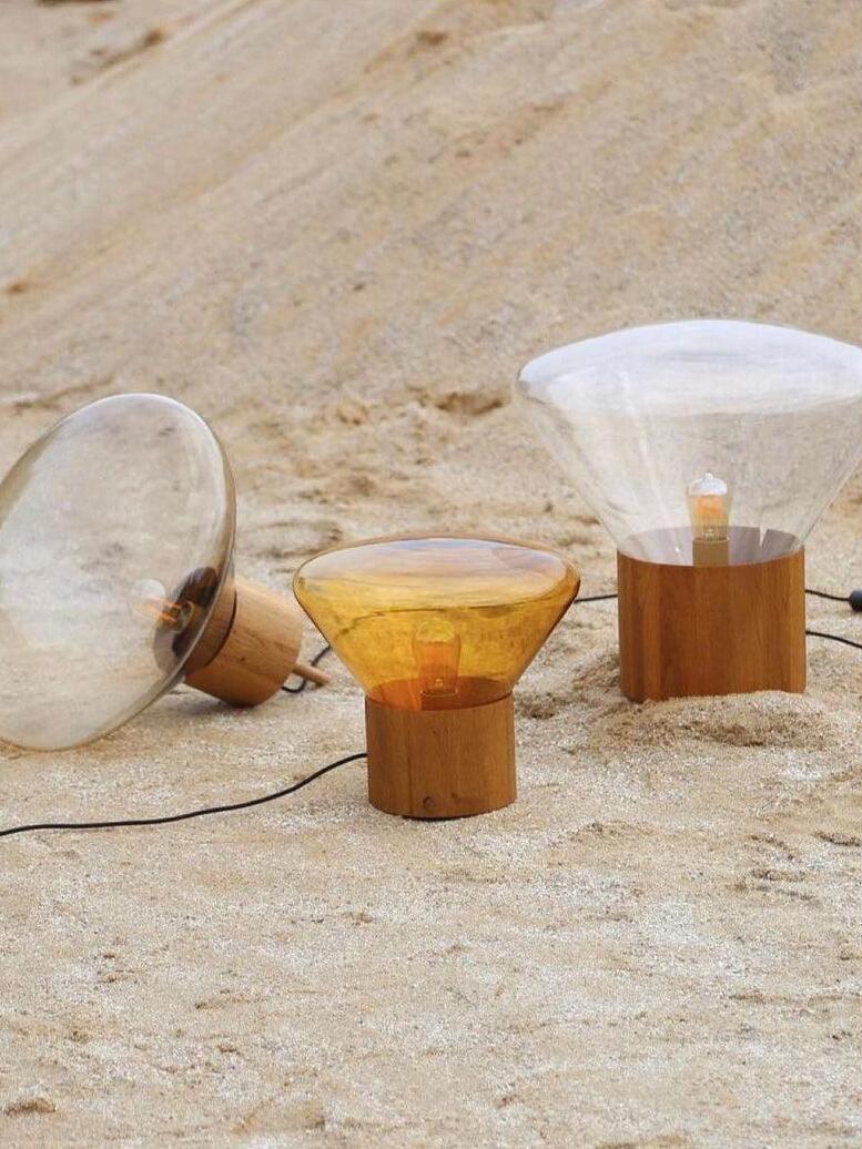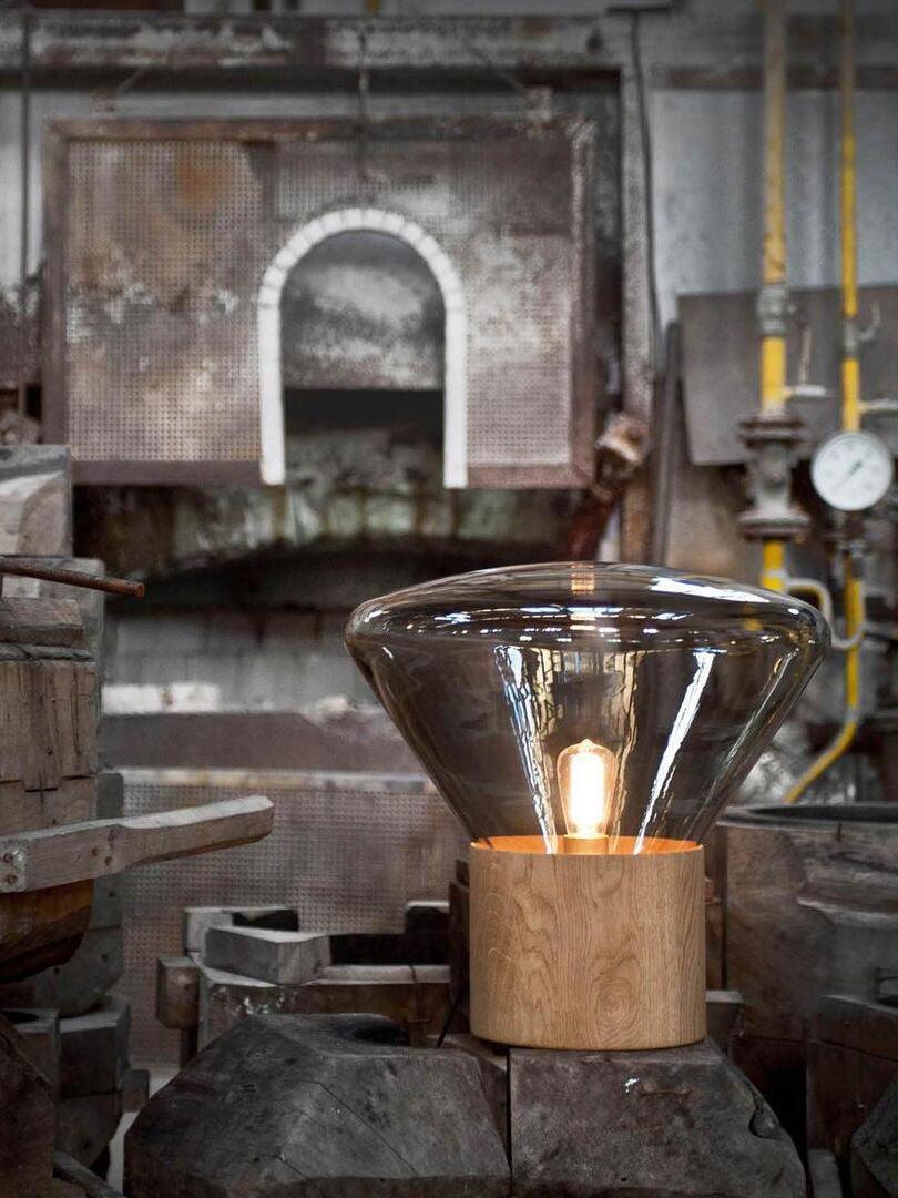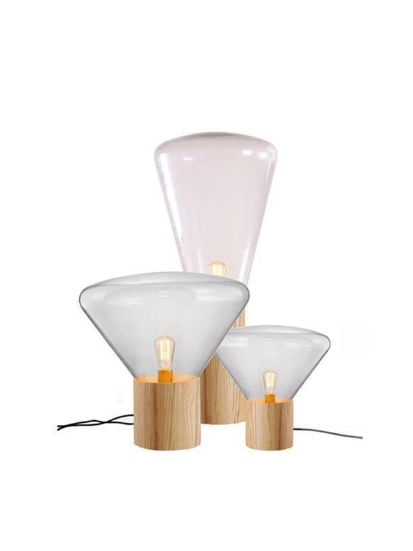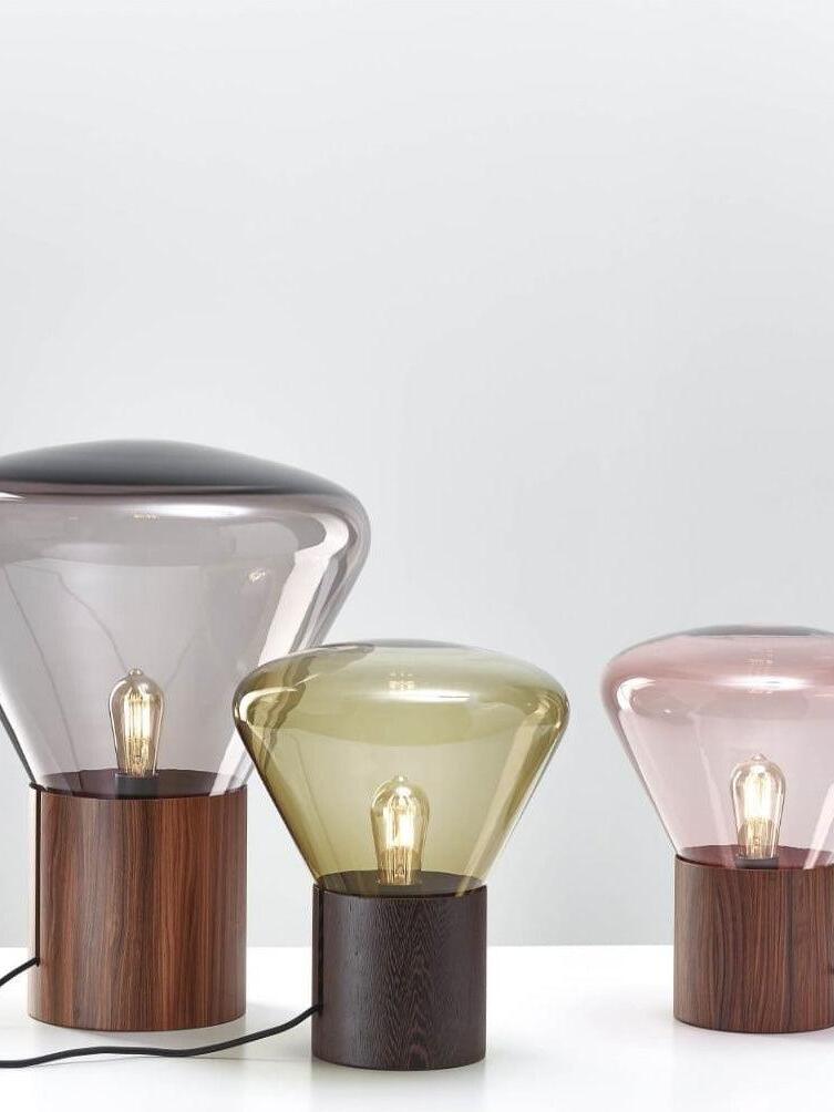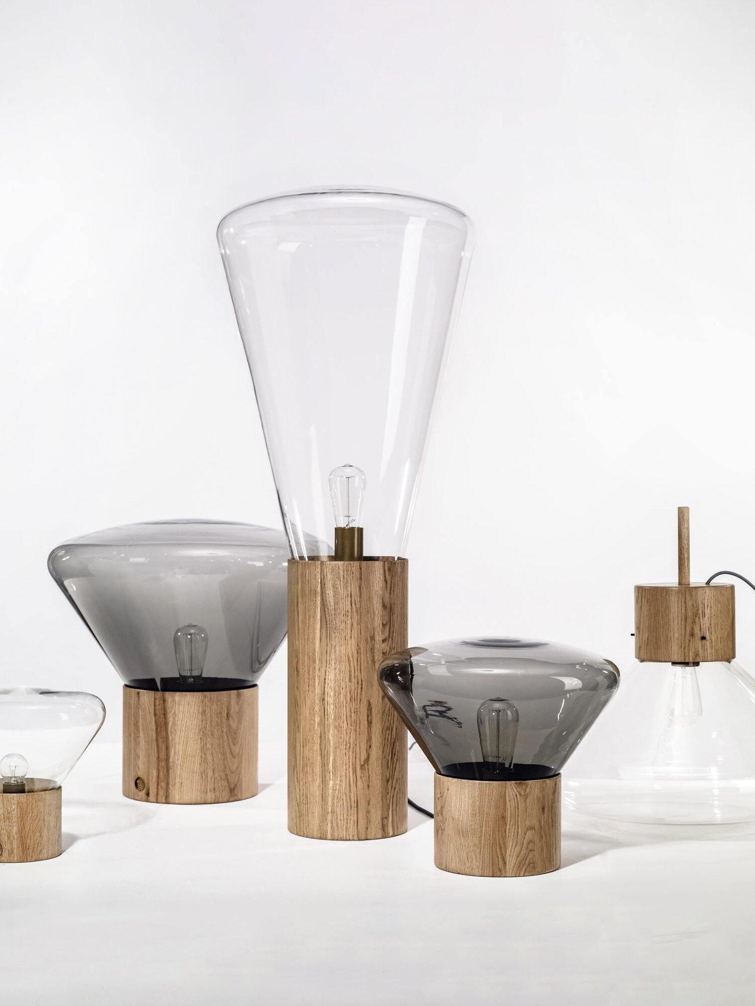 The lights, featuring a billowing glass shade set in a handcrafted wood base together with a naked filament bulb, breathe new life into any space and elicit a festive ambiance. The collection offers multiple shape and size variants as well as a broad palette of glass colors and woods.
