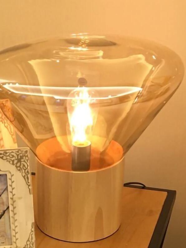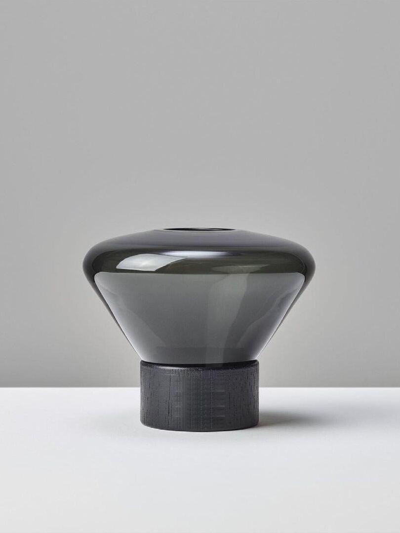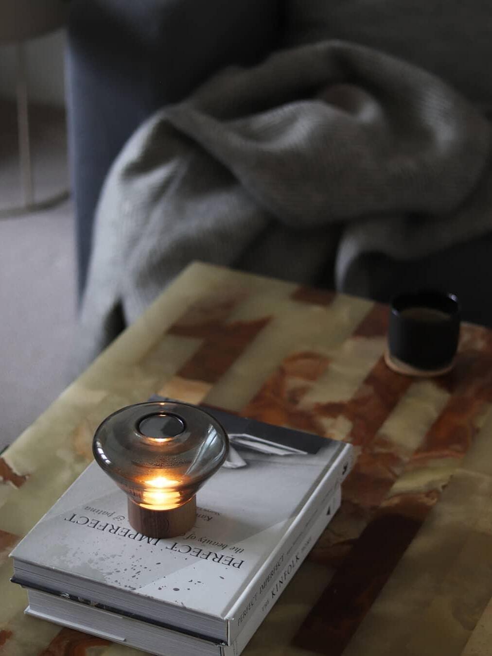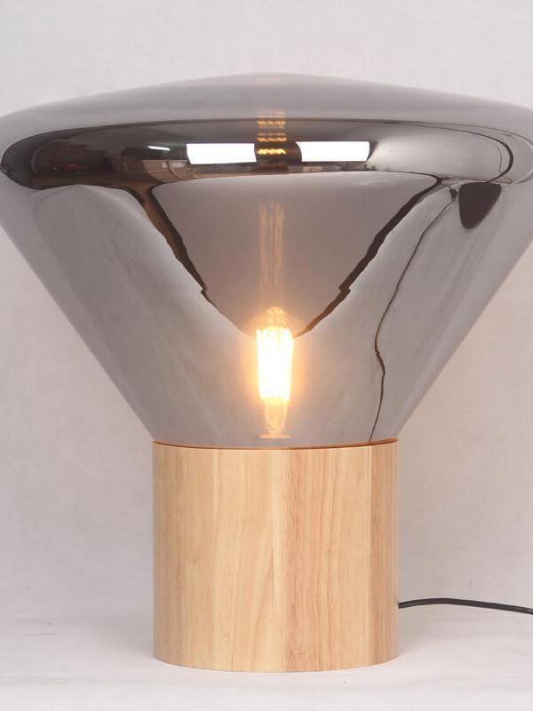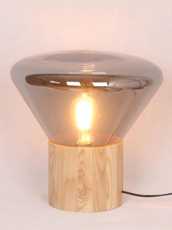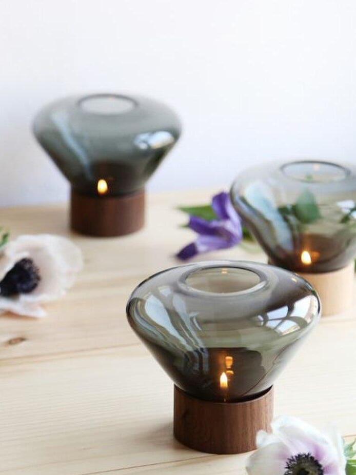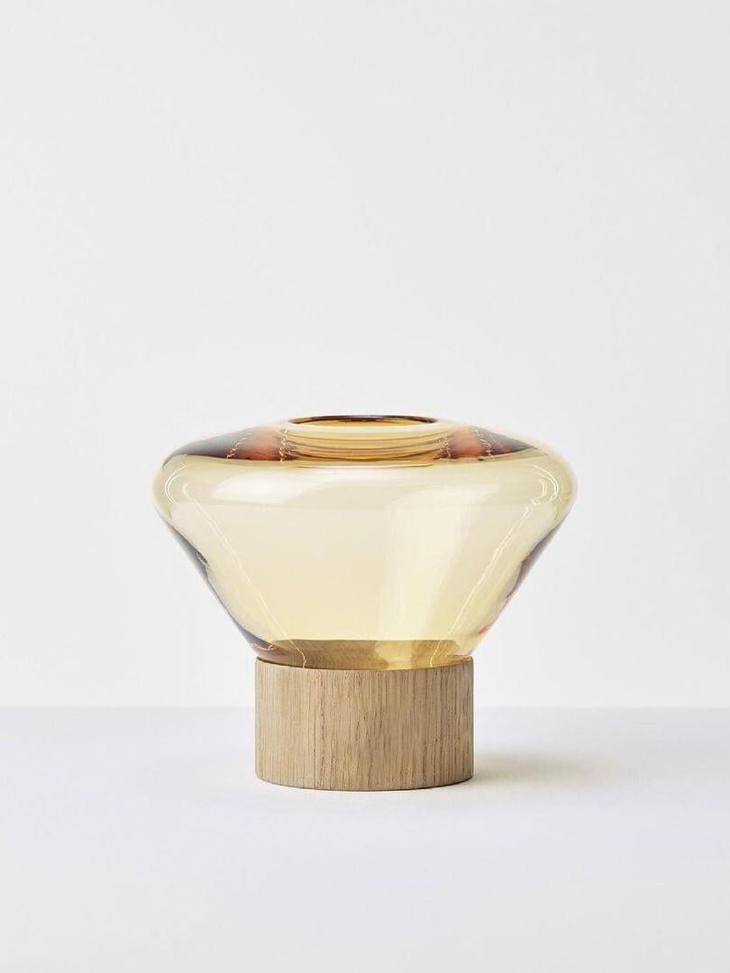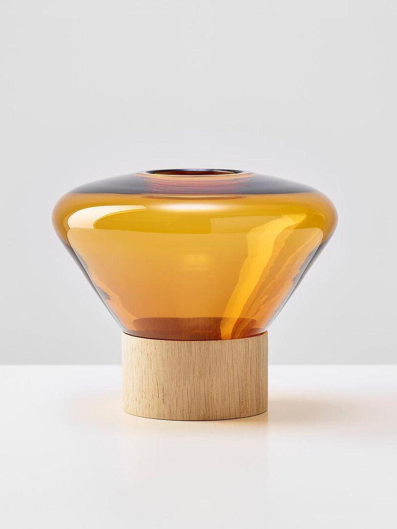 The lights, featuring a billowing glass shade set in a handcrafted wood base together with a naked filament bulb, breathe new life into any space and elicit a festive ambiance. The collection offers multiple shape and size variants as well as a broad palette of glass colors and woods.