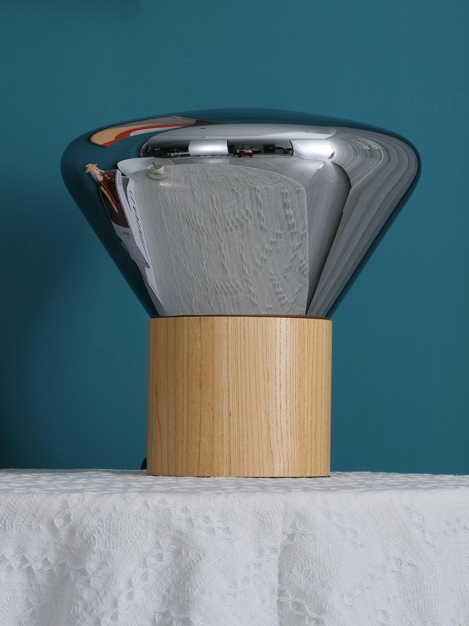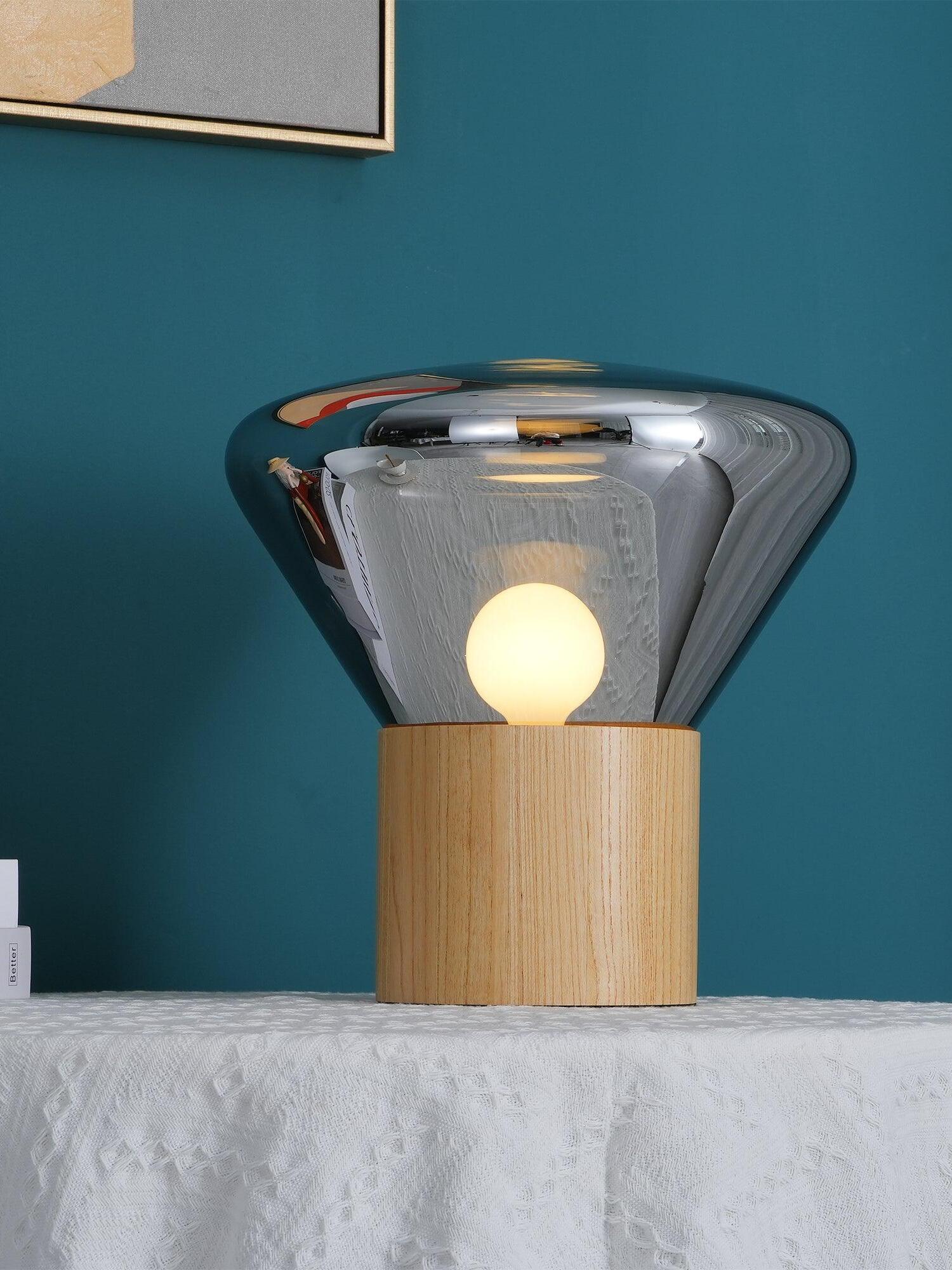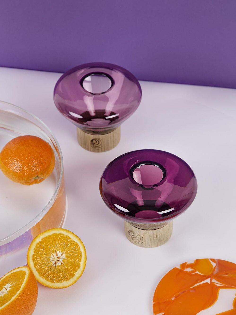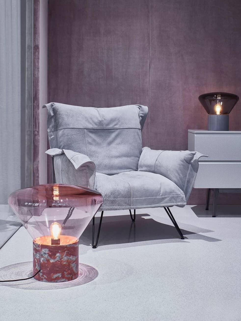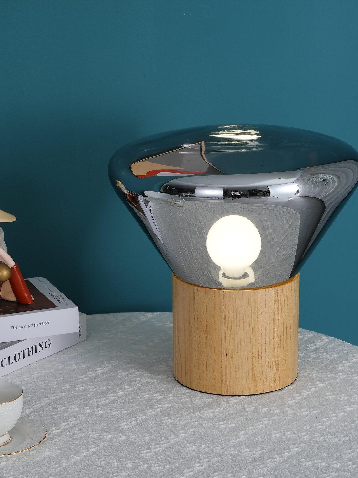 The lights, featuring a billowing glass shade set in a handcrafted wood base together with a naked filament bulb, breathe new life into any space and elicit a festive ambiance. The collection offers multiple shape and size variants as well as a broad palette of glass colors and woods.