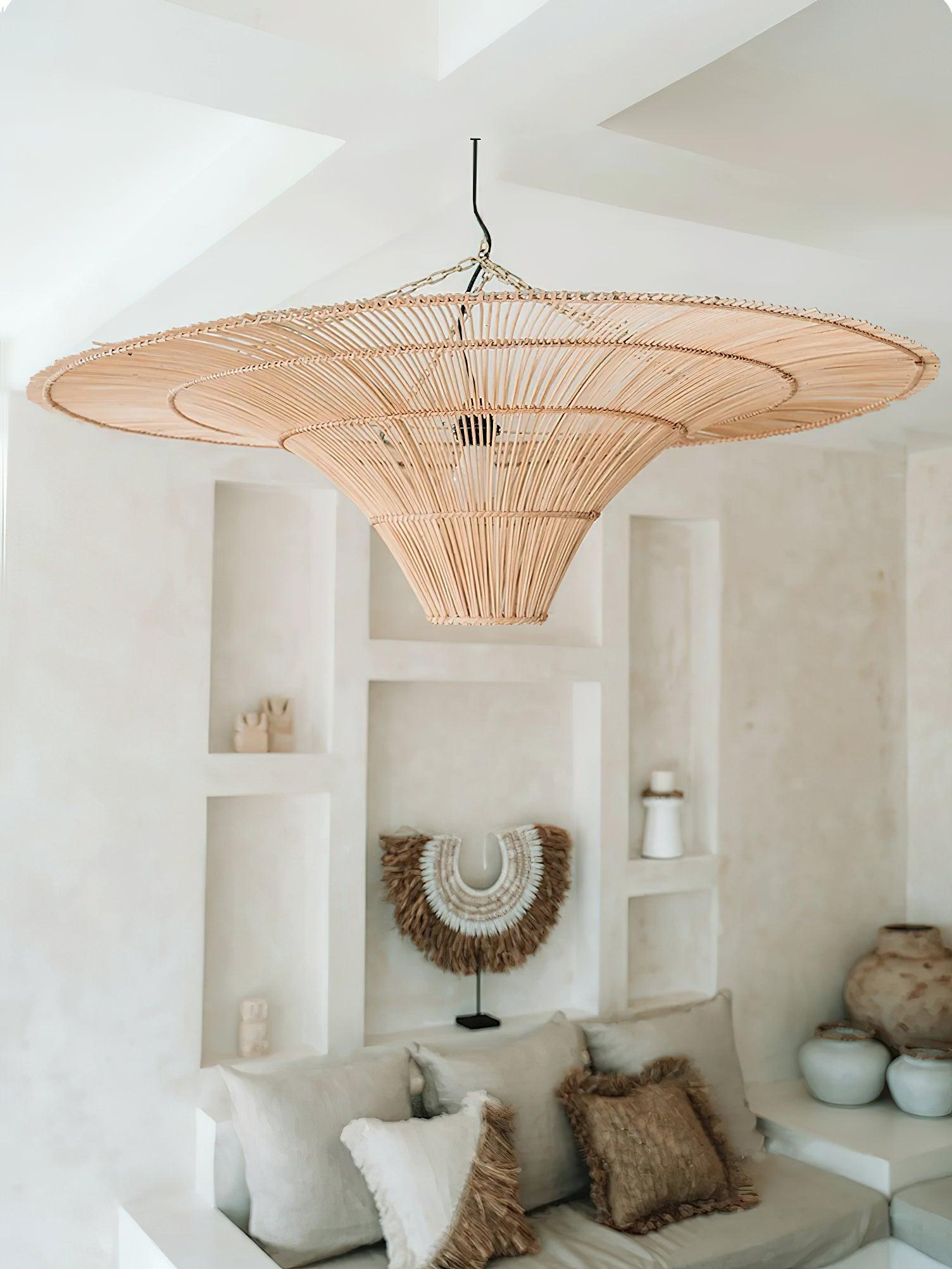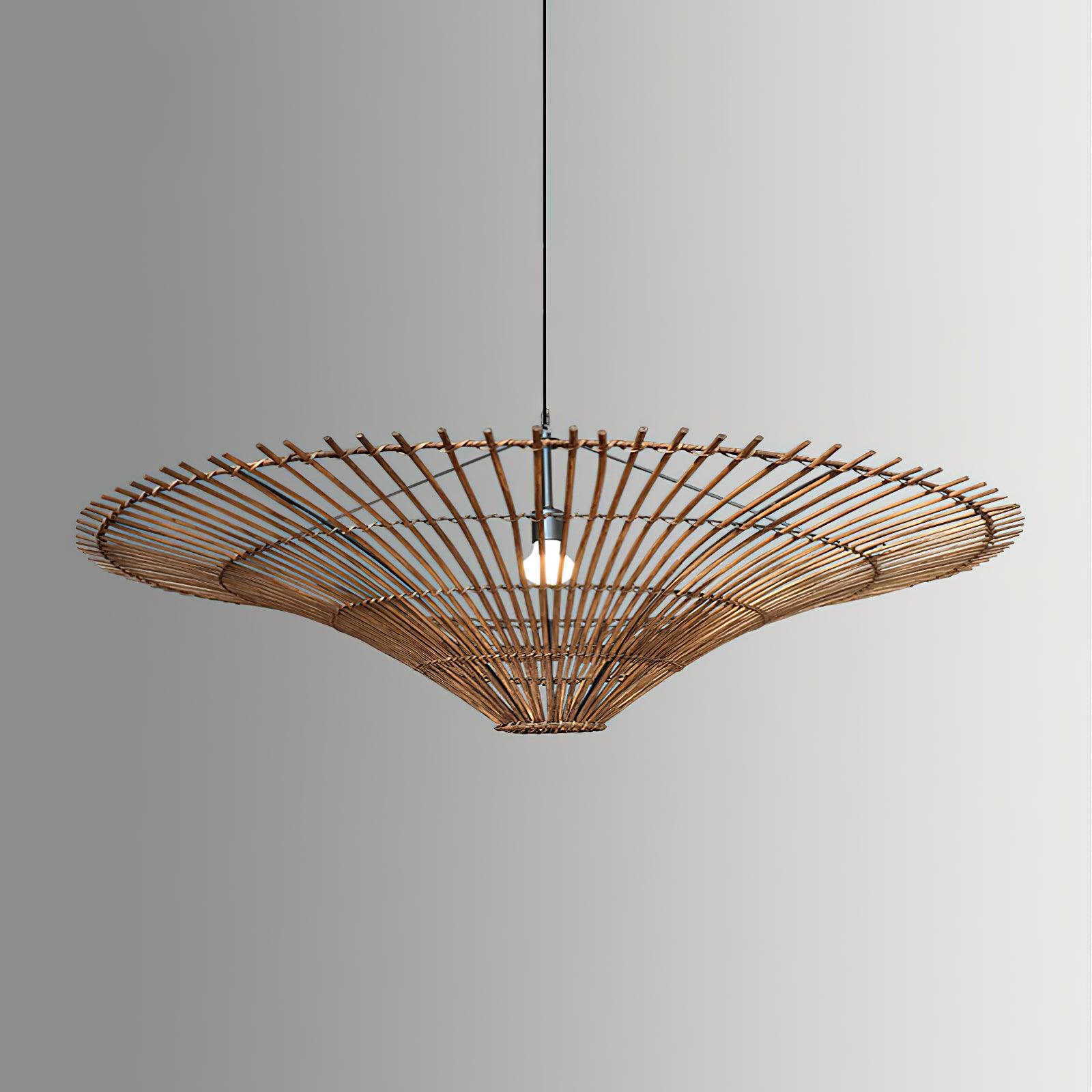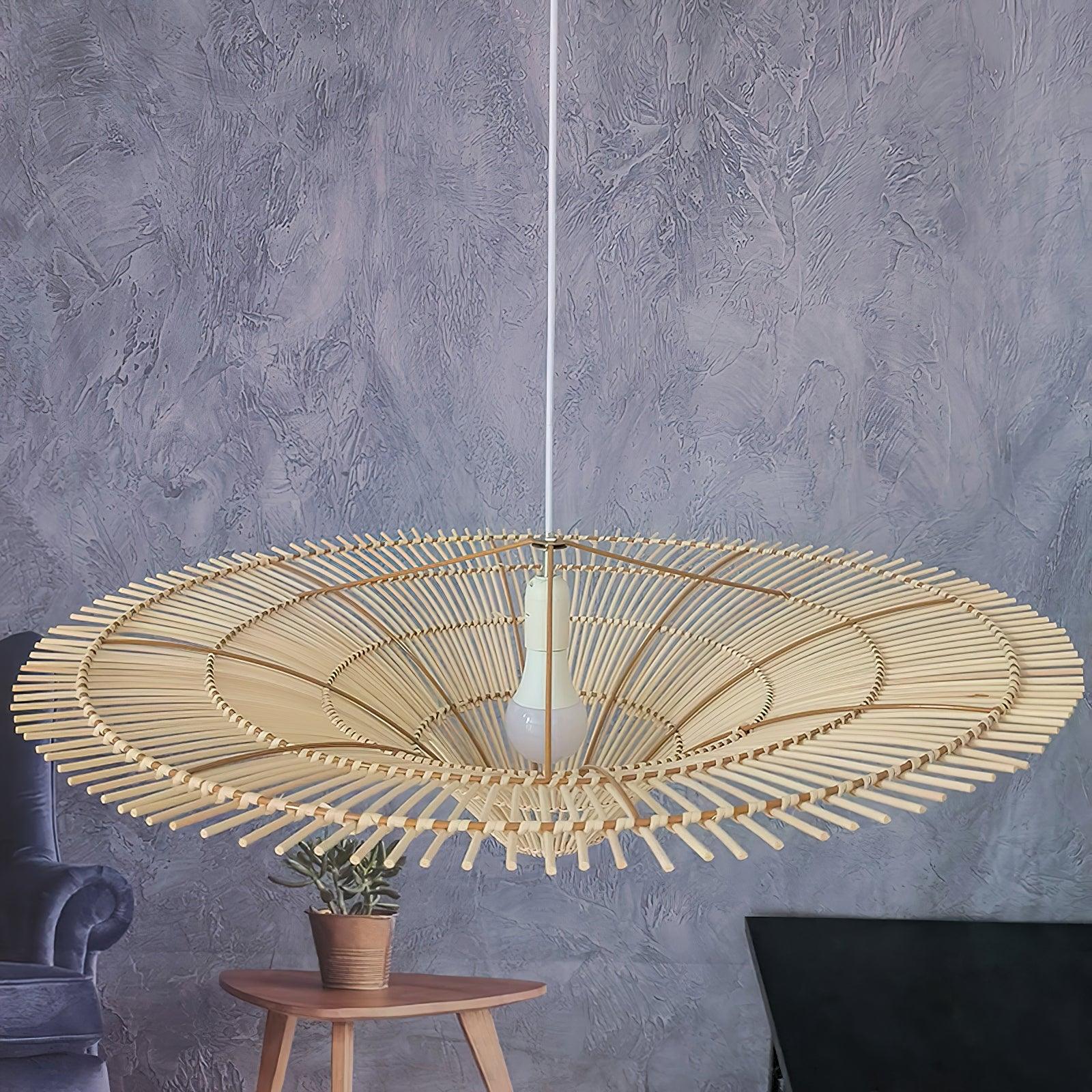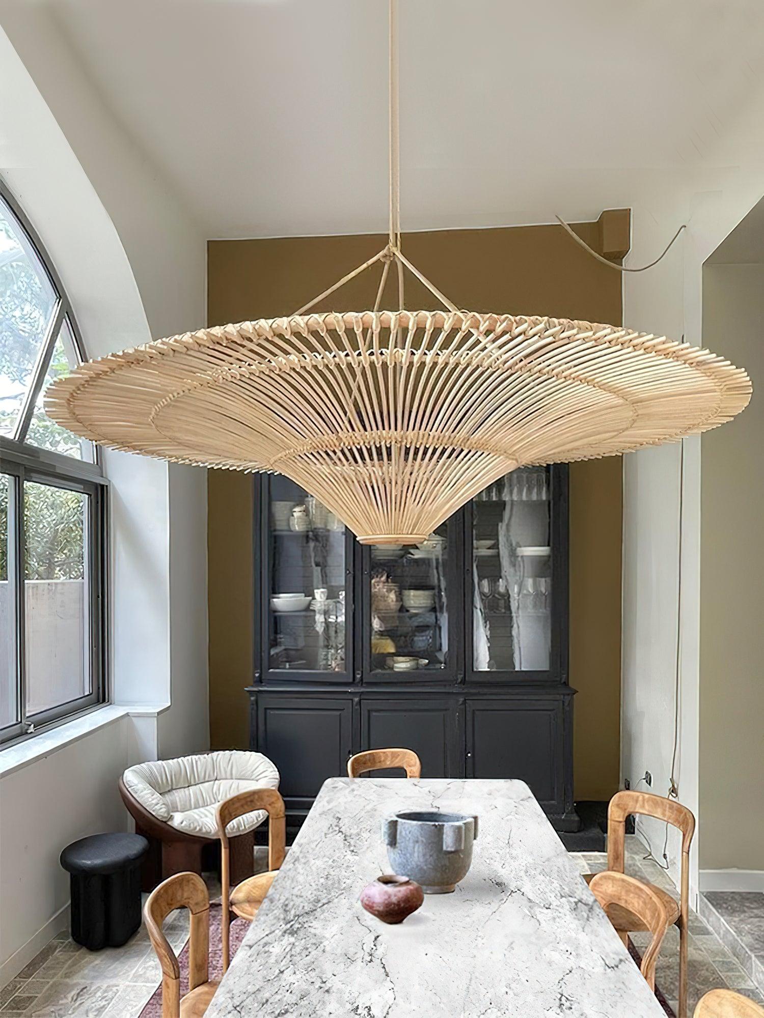 This sprawling rattan shade feels natural but makes a big statement. The irregular edging of the rattan enhances the rustic feel and the Vintage natural rattan finish adds subtle sophistication and a warm glow. Hang this one-light pendant over a dining table or in a larger living space to add a modern organic vibe.