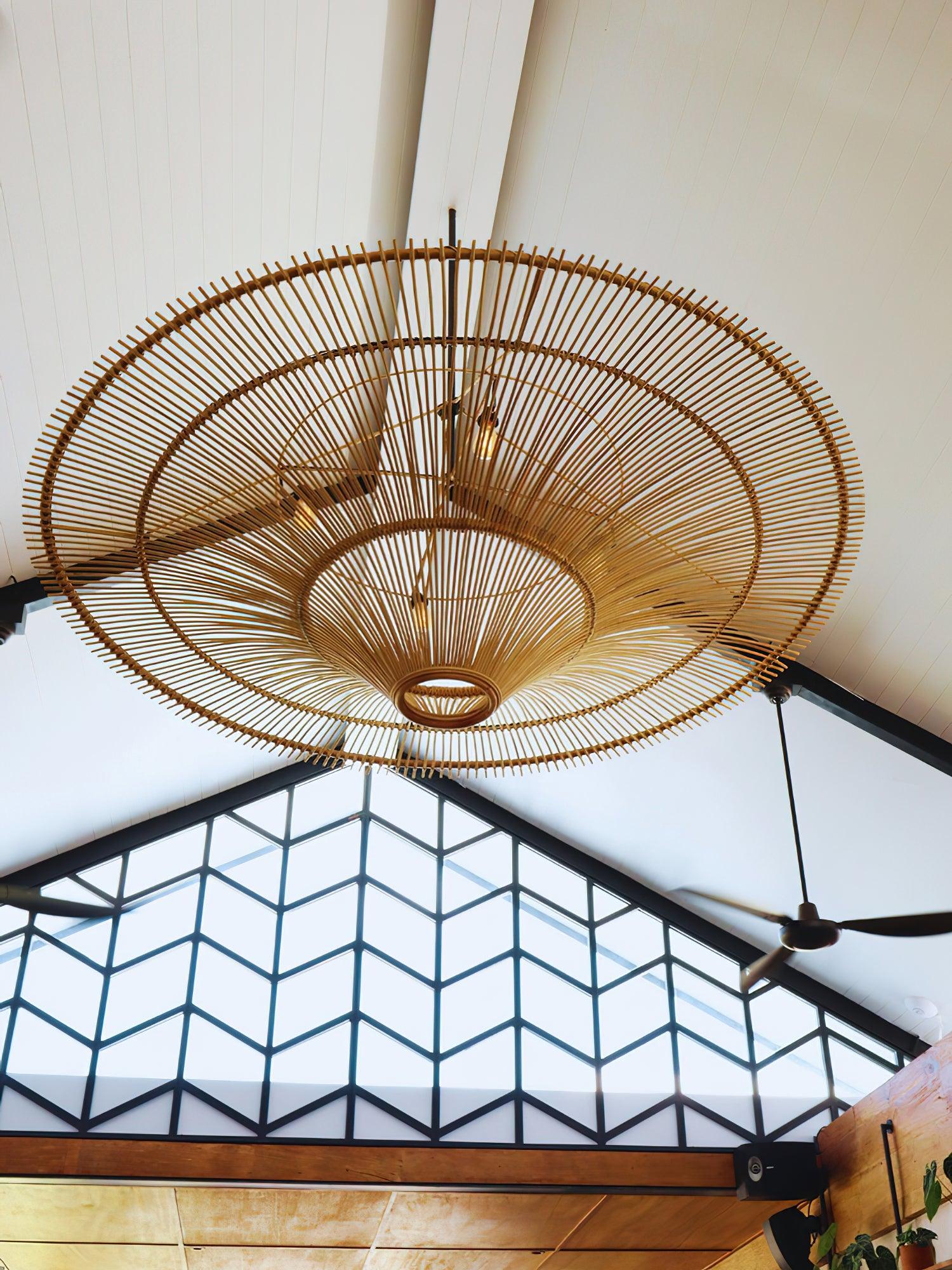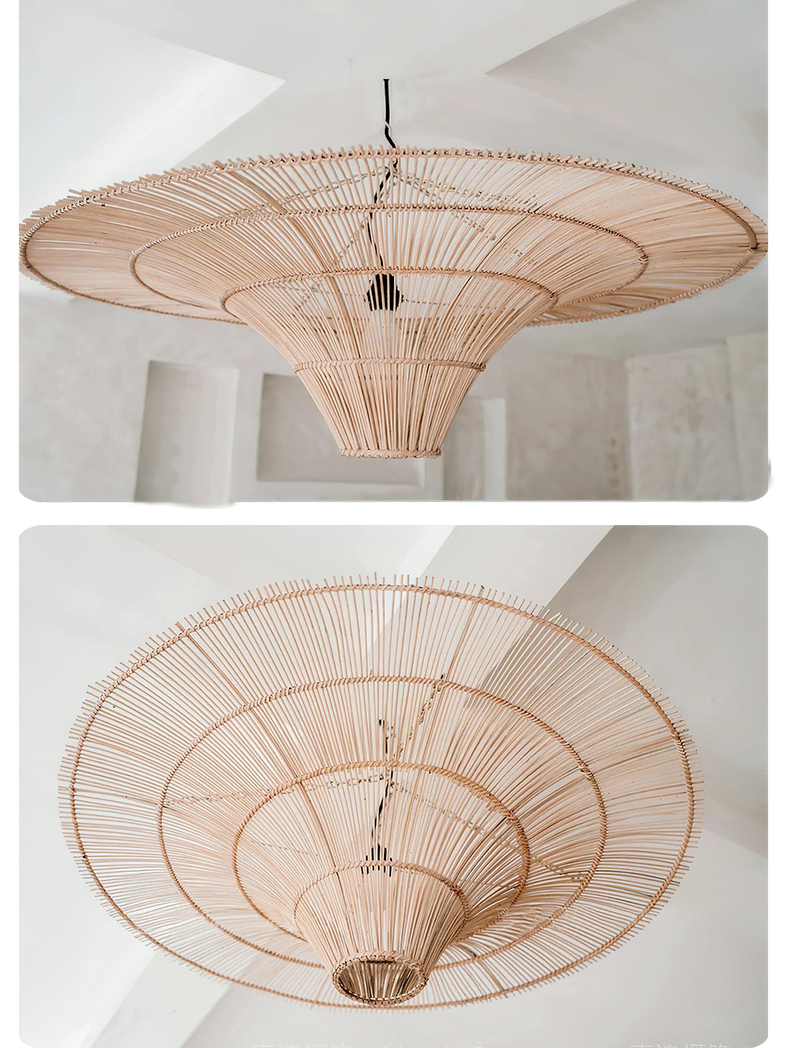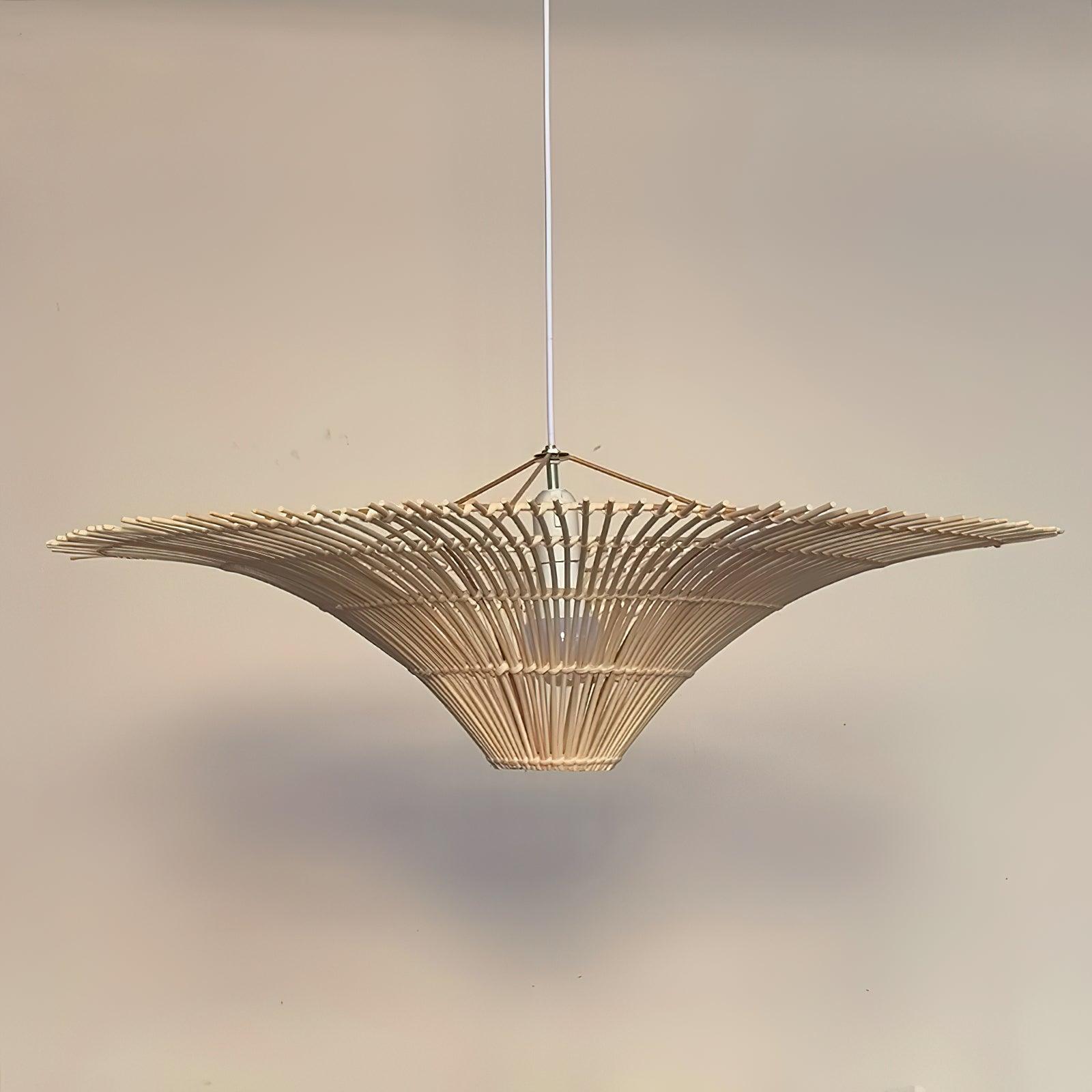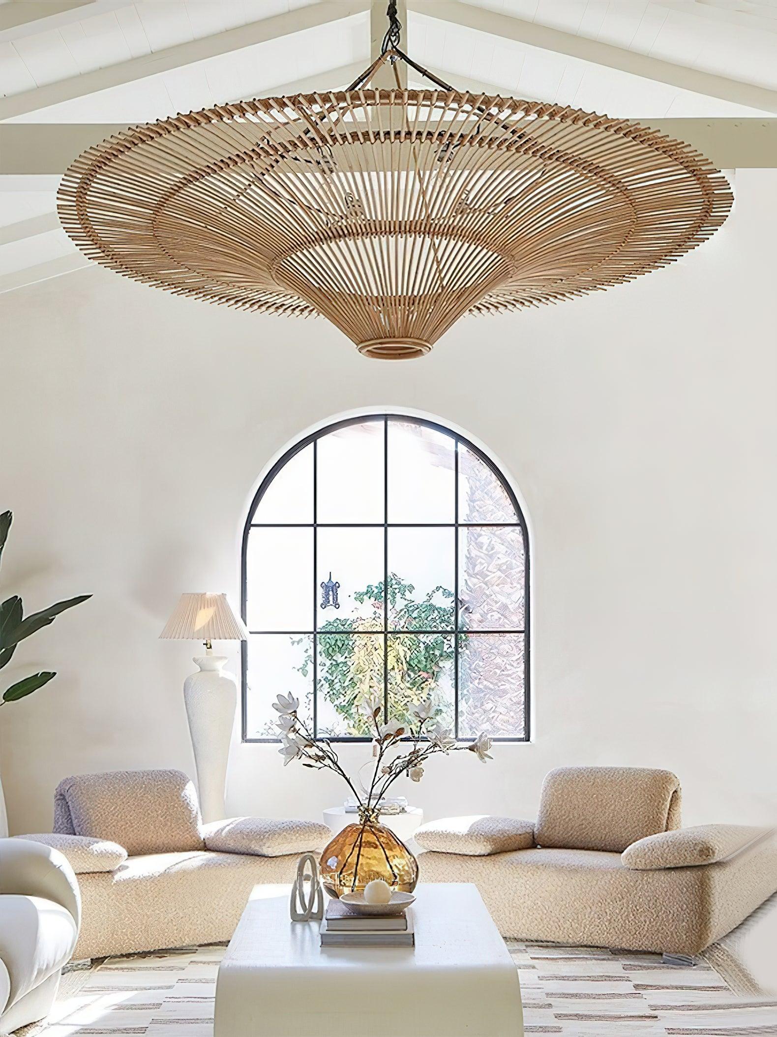 This sprawling rattan shade feels natural but makes a big statement. The irregular edging of the rattan enhances the rustic feel and the Vintage natural rattan finish adds subtle sophistication and a warm glow. Hang this one-light pendant over a dining table or in a larger living space to add a modern organic vibe.
