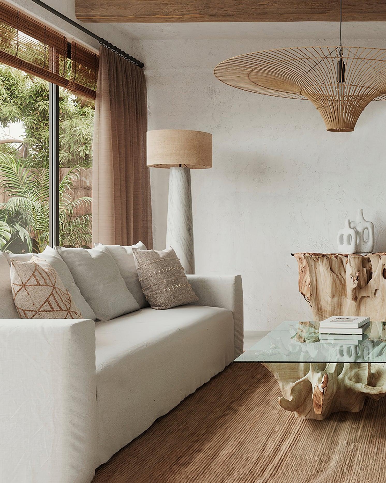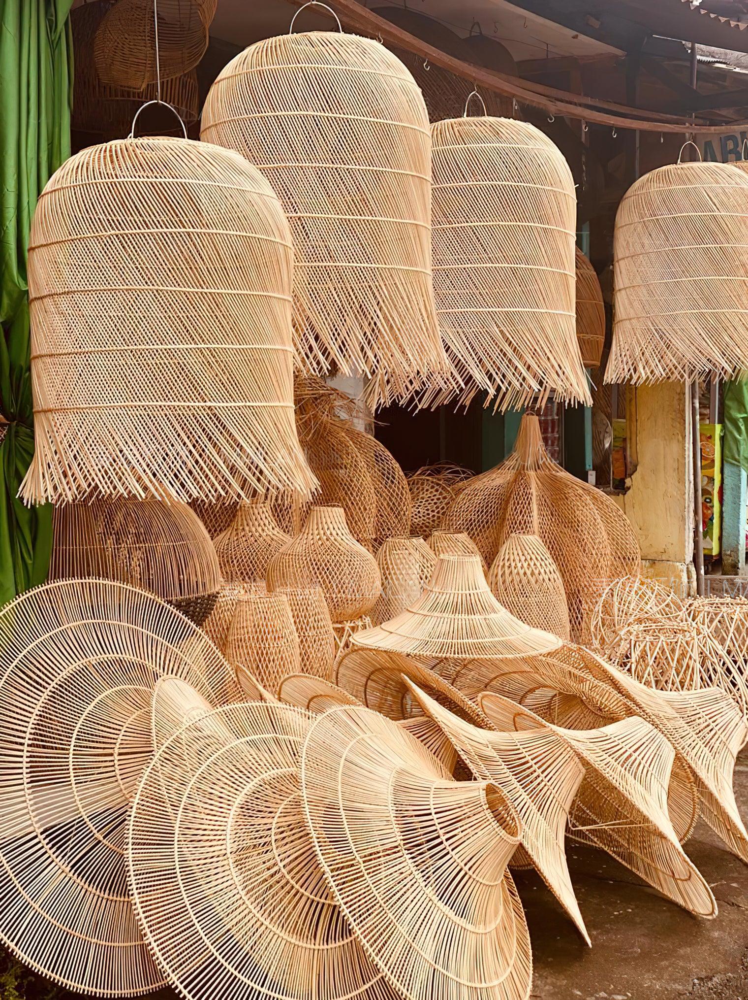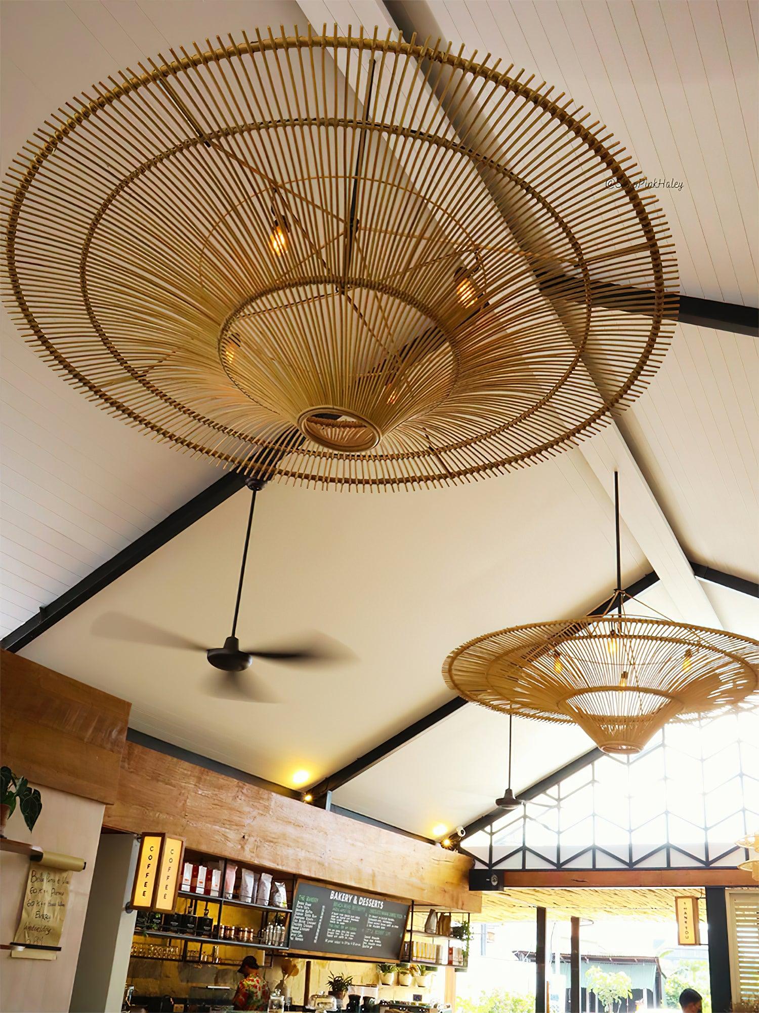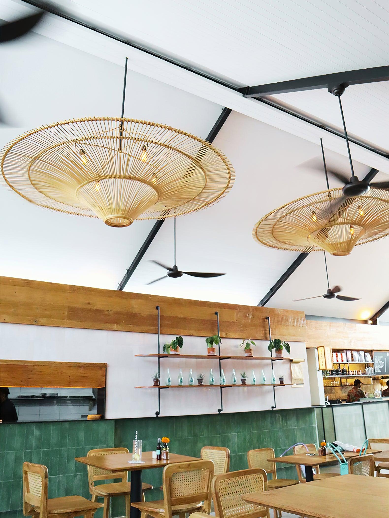 This sprawling rattan shade feels natural but makes a big statement. The irregular edging of the rattan enhances the rustic feel and the Vintage natural rattan finish adds subtle sophistication and a warm glow. Hang this one-light pendant over a dining table or in a larger living space to add a modern organic vibe.