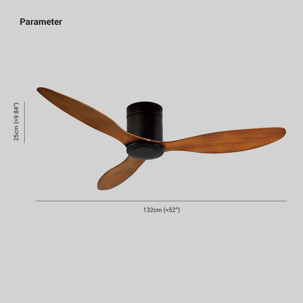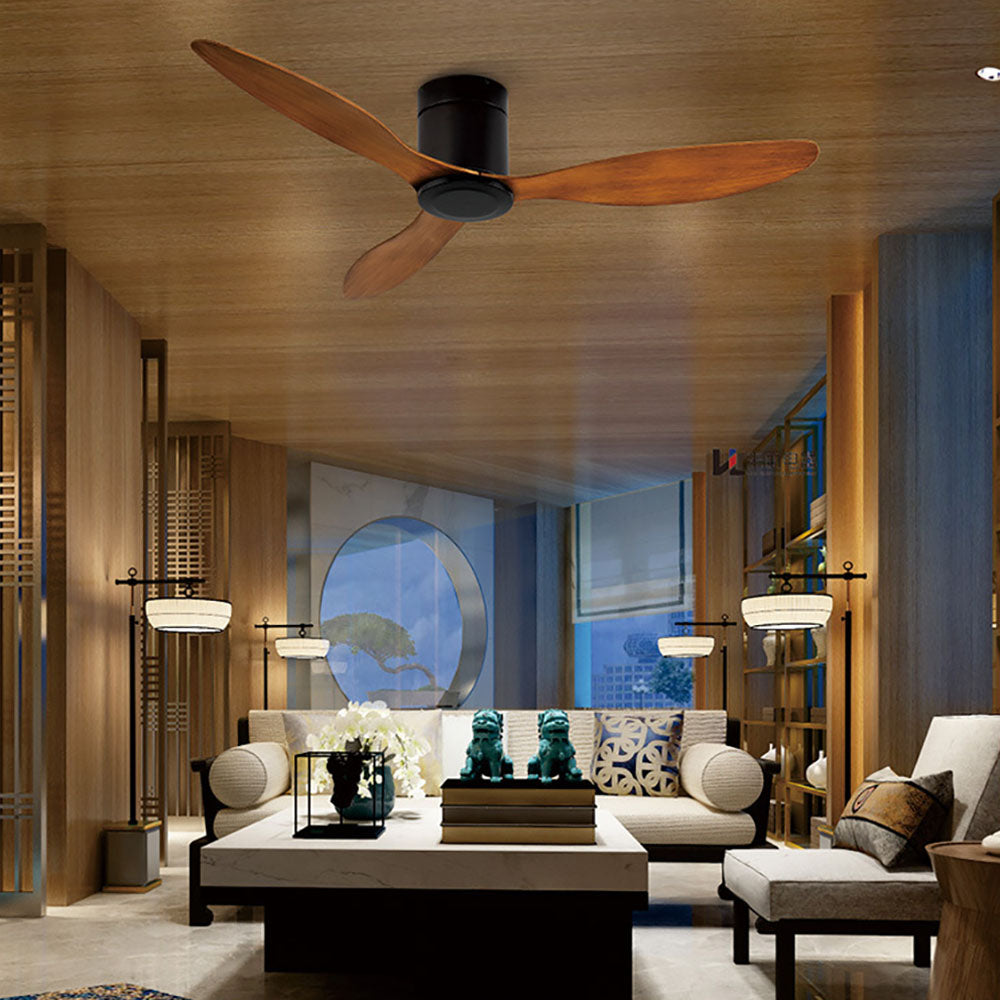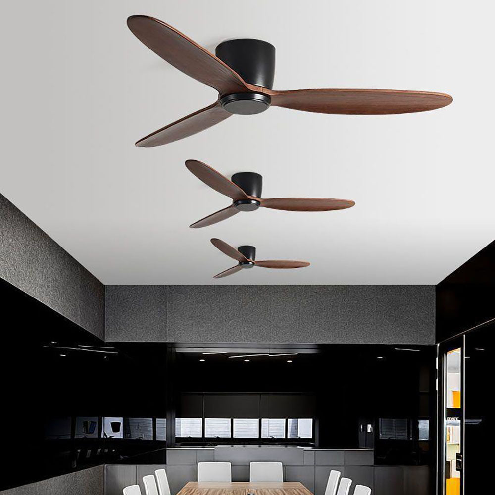- Modern and minimalist 3-blade DC ceiling fan with a stylish black and wood finish.